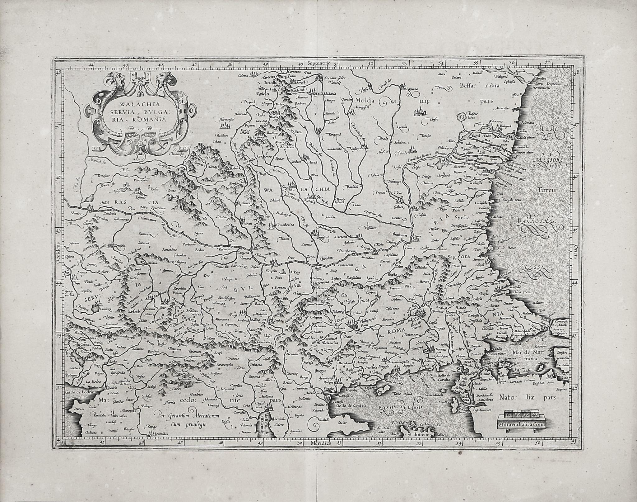 Látványos térkép a Kelet-Balkánról, középpontjában Bulgáriával, a Boszporusz és Konstantinápoly ábrázolásával. A térkép meghatározó eleme a Duna és vízrendszere; a terület magában foglalja Bulgáriát, Romániát, Szerbiát és Macedóniát.