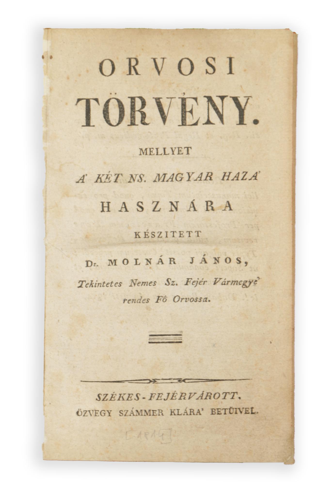 Orvosi törvény. Mellyet a' két ns. magyar haza' hasznára készitett ~. I-II.