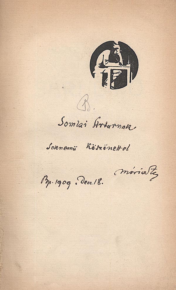 Az első lapon ajánlással: "Somlai Arturnak soknemü köszönettel Móricz Bp. 1909. dec. 18." A színész a Nemzeti Színházban a címszerepet játszotta, ekkor a kötetet jegyzetekkel látta el.