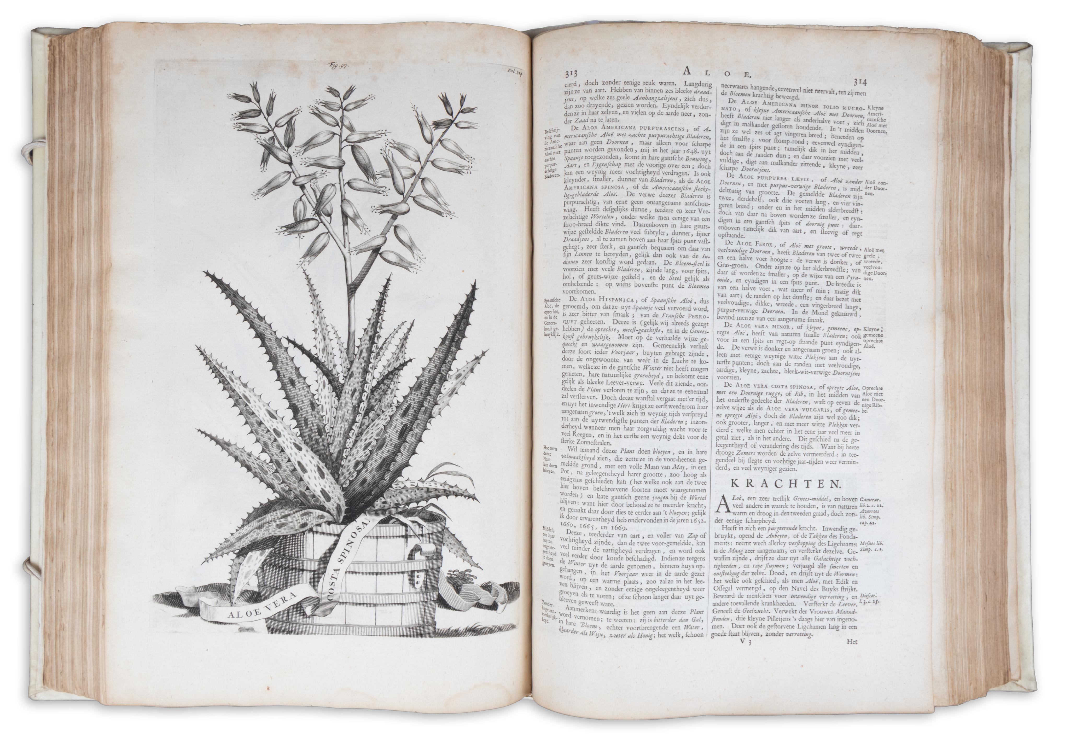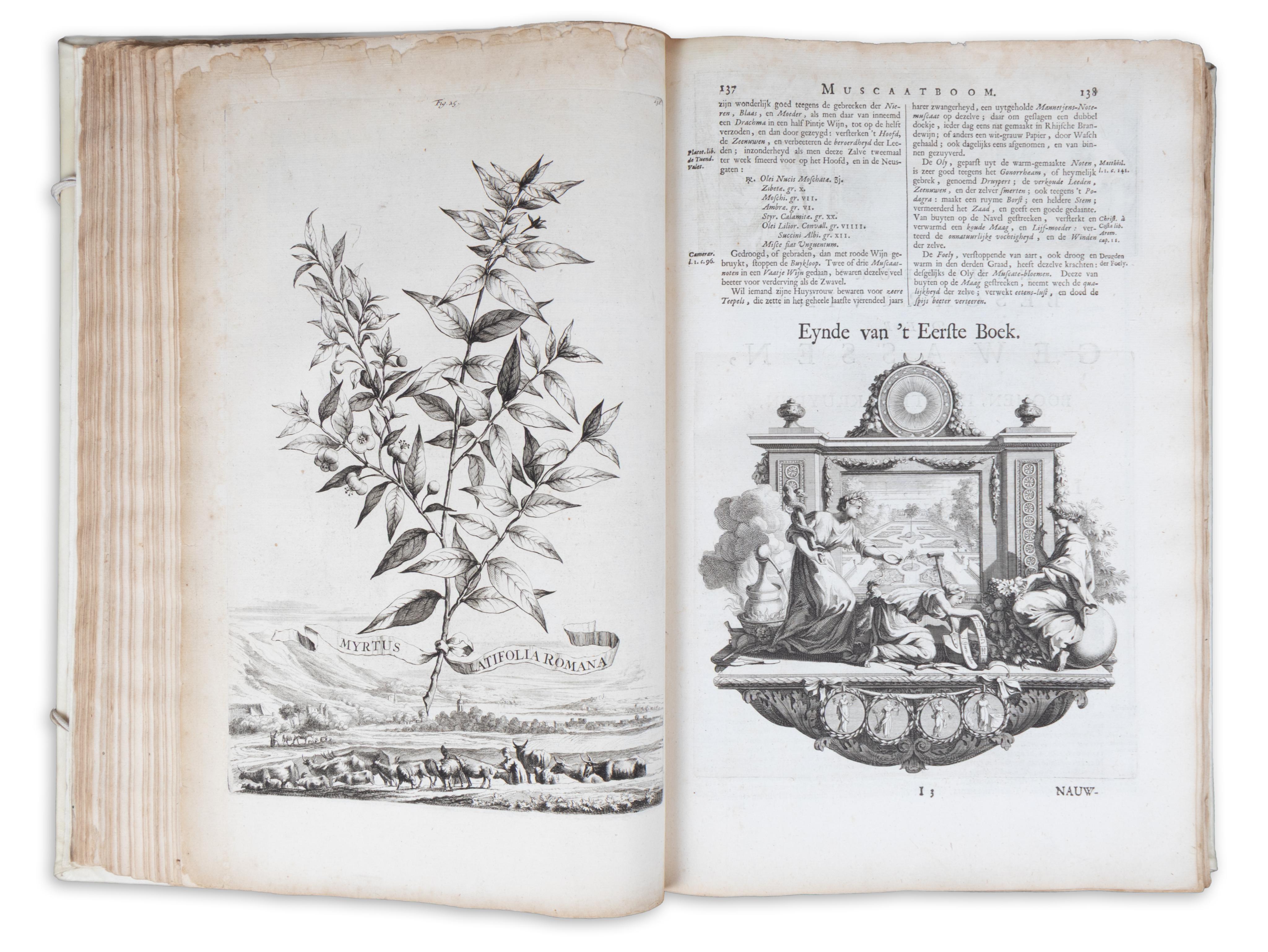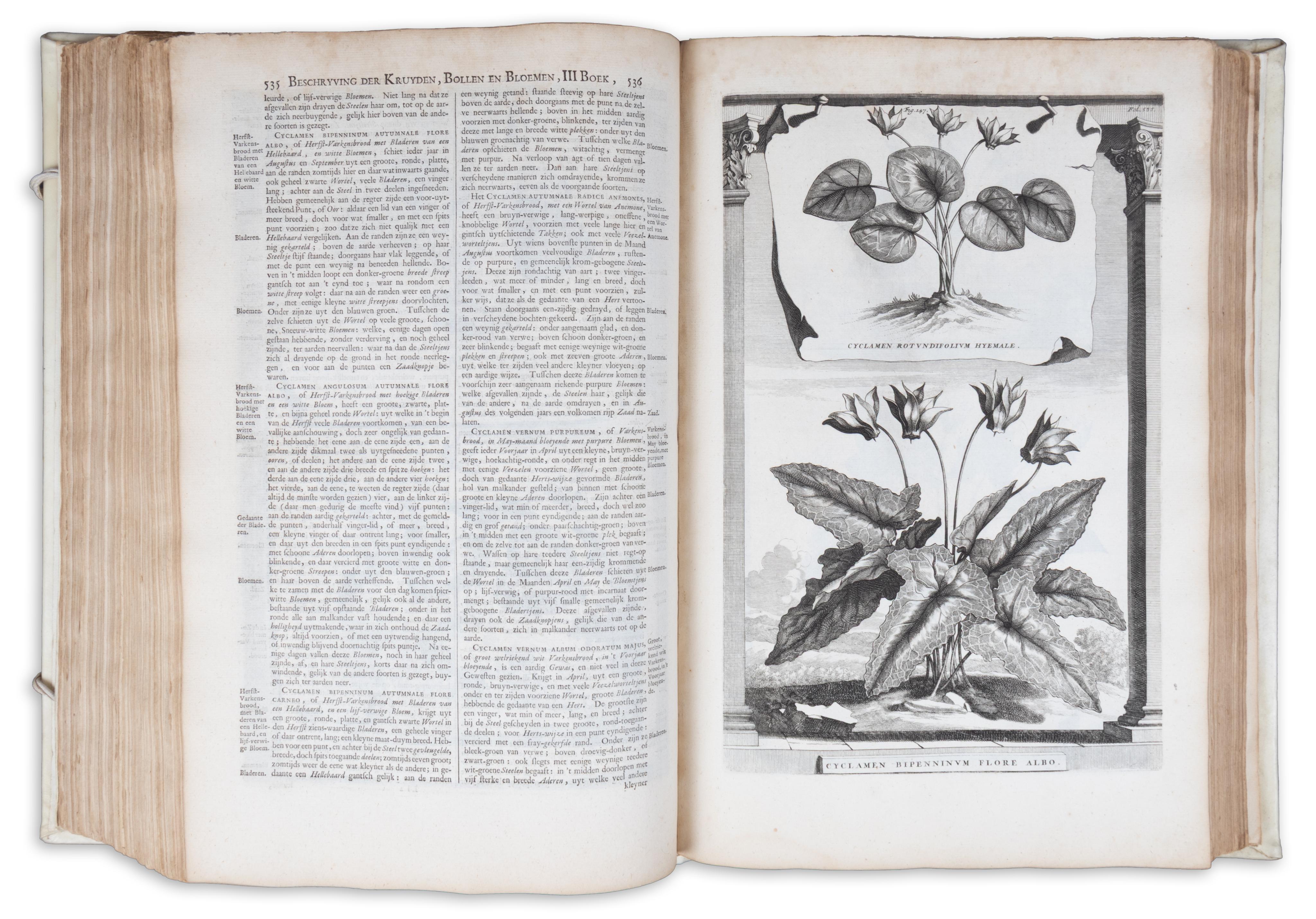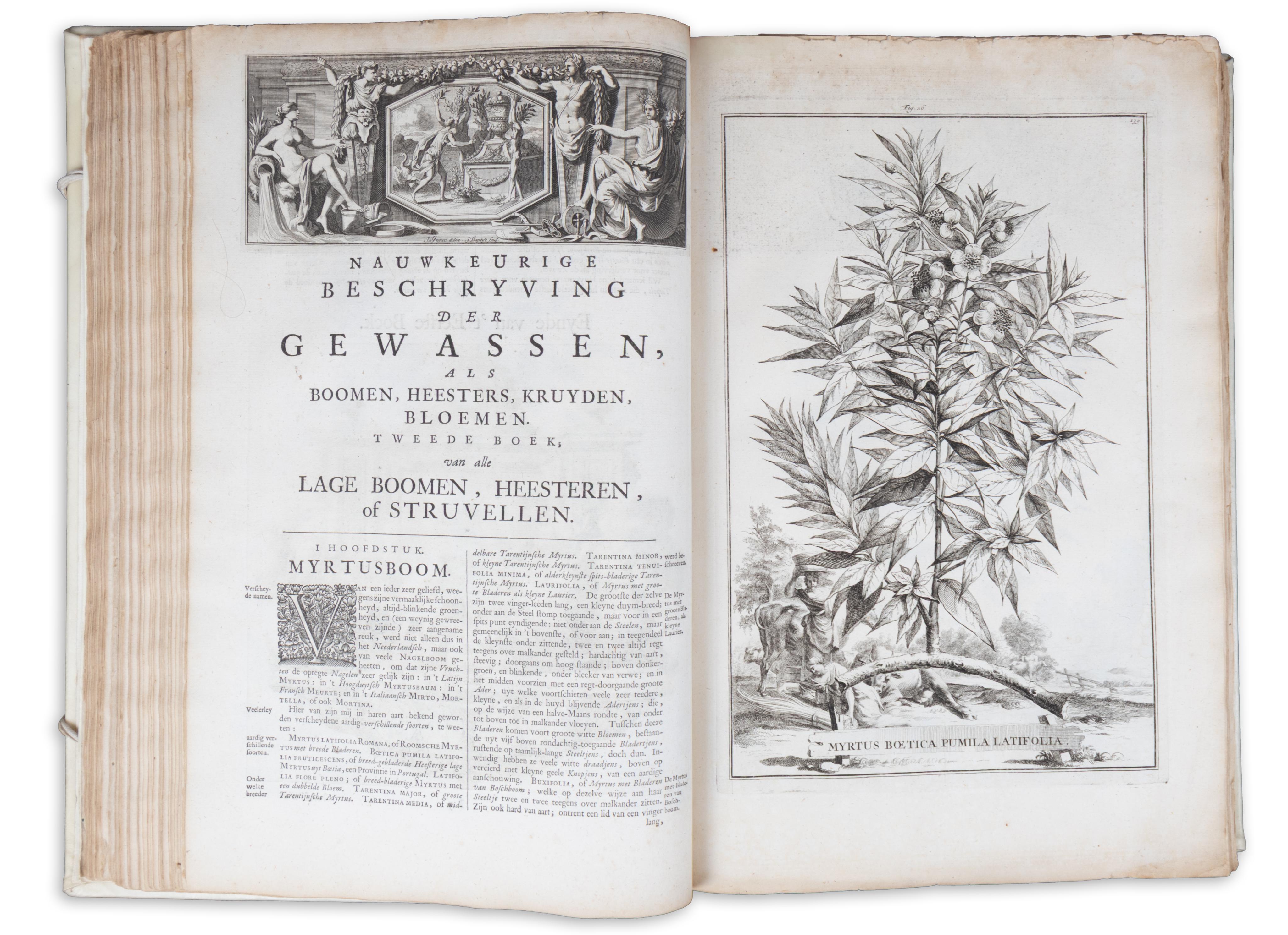 Leiden - Utrecht, 1696. Pieter van der Aa - François Halma,A tizenhetedik század egyik legvonzóbb holland florilégiumának első bővített kiadása. 1 t. (rézmetszetű díszcímlap J. Baptiste Monnoyer által, Jan Goeree után) + [37] p. + 930 (recte 932) hasáb + [60]p. +243 t. (rézmetszetek). Vörös és fekete színnel nyomtatott címlap, metszett vignettával, számos metszett fej- és záródíszek, fametszet iniciálék; Hiányzik az utolsó levél.