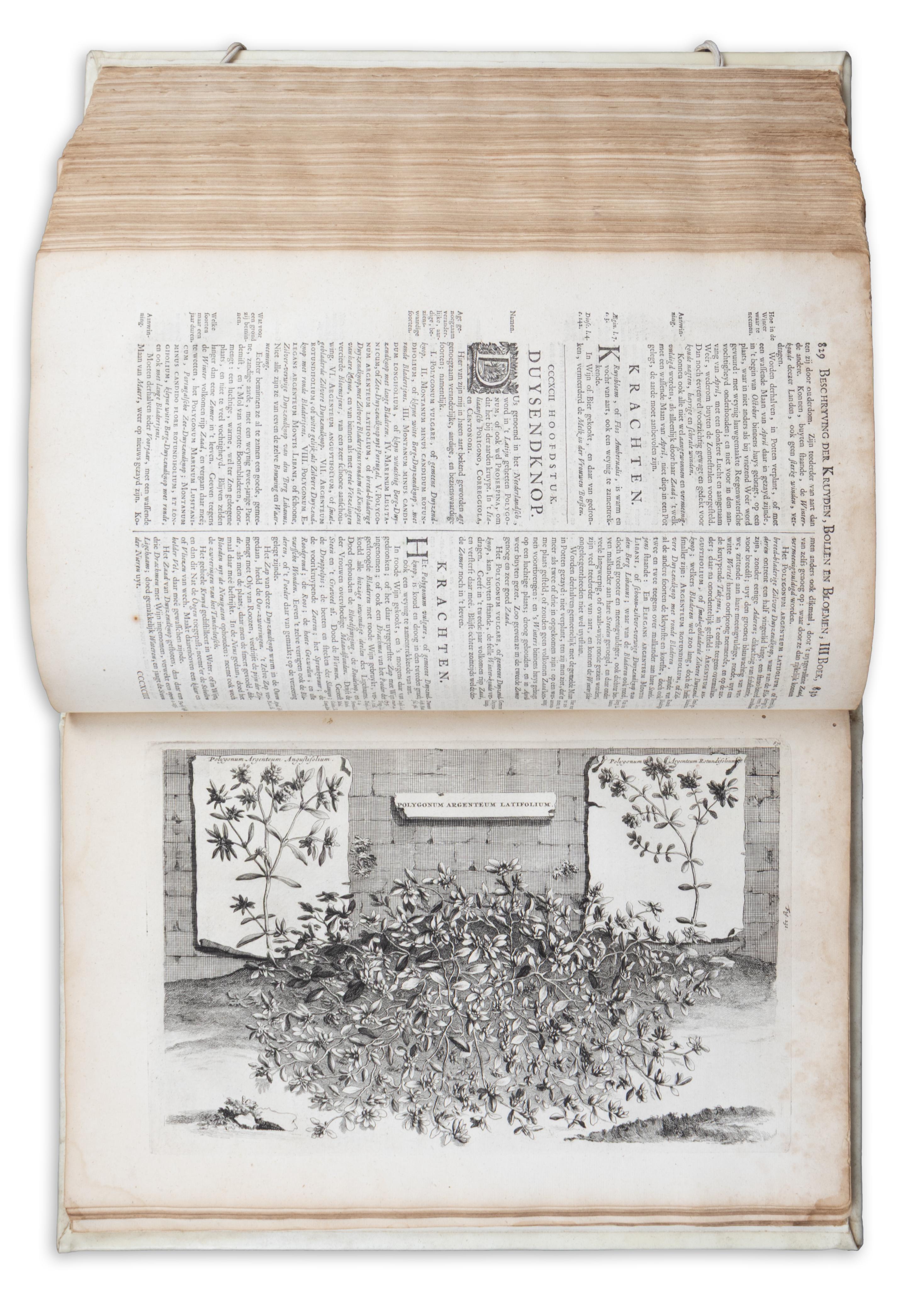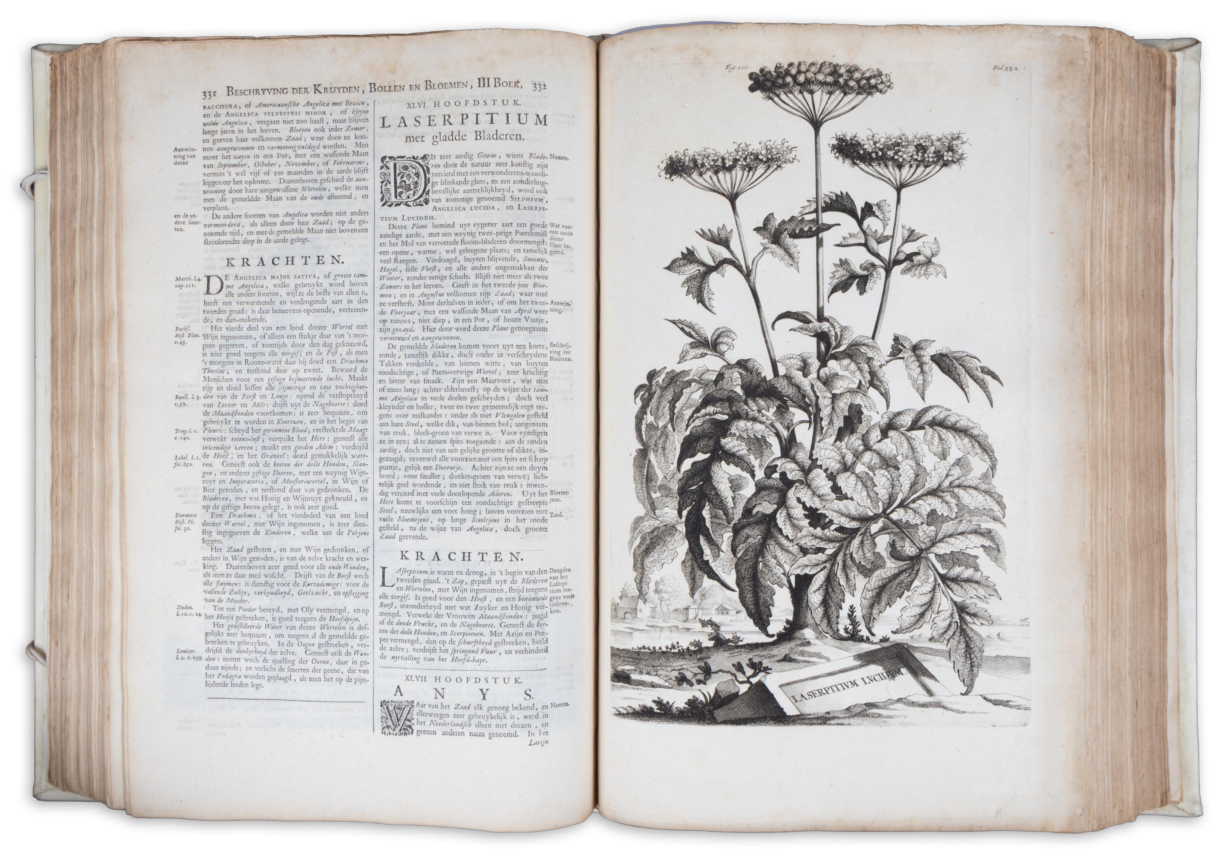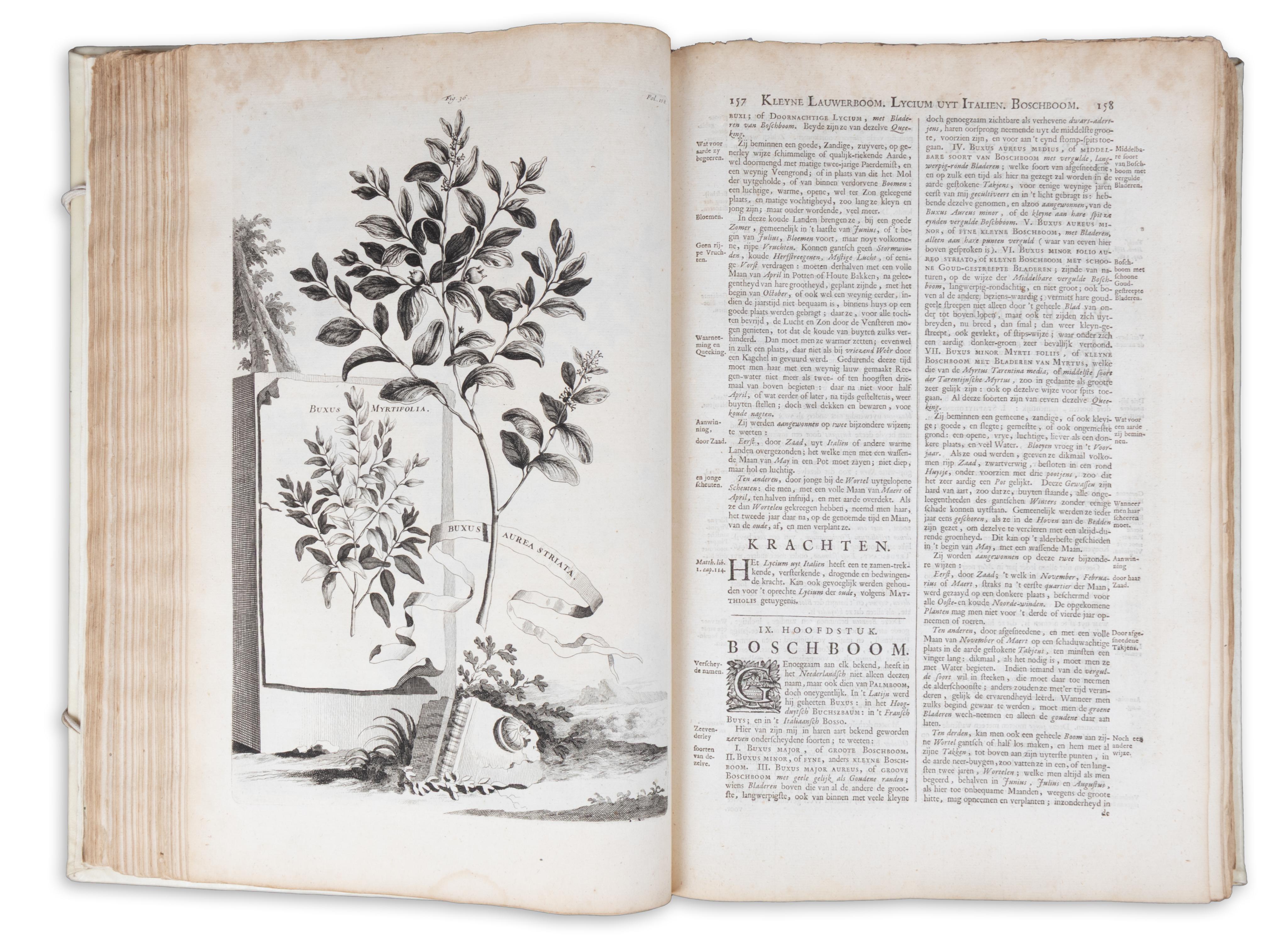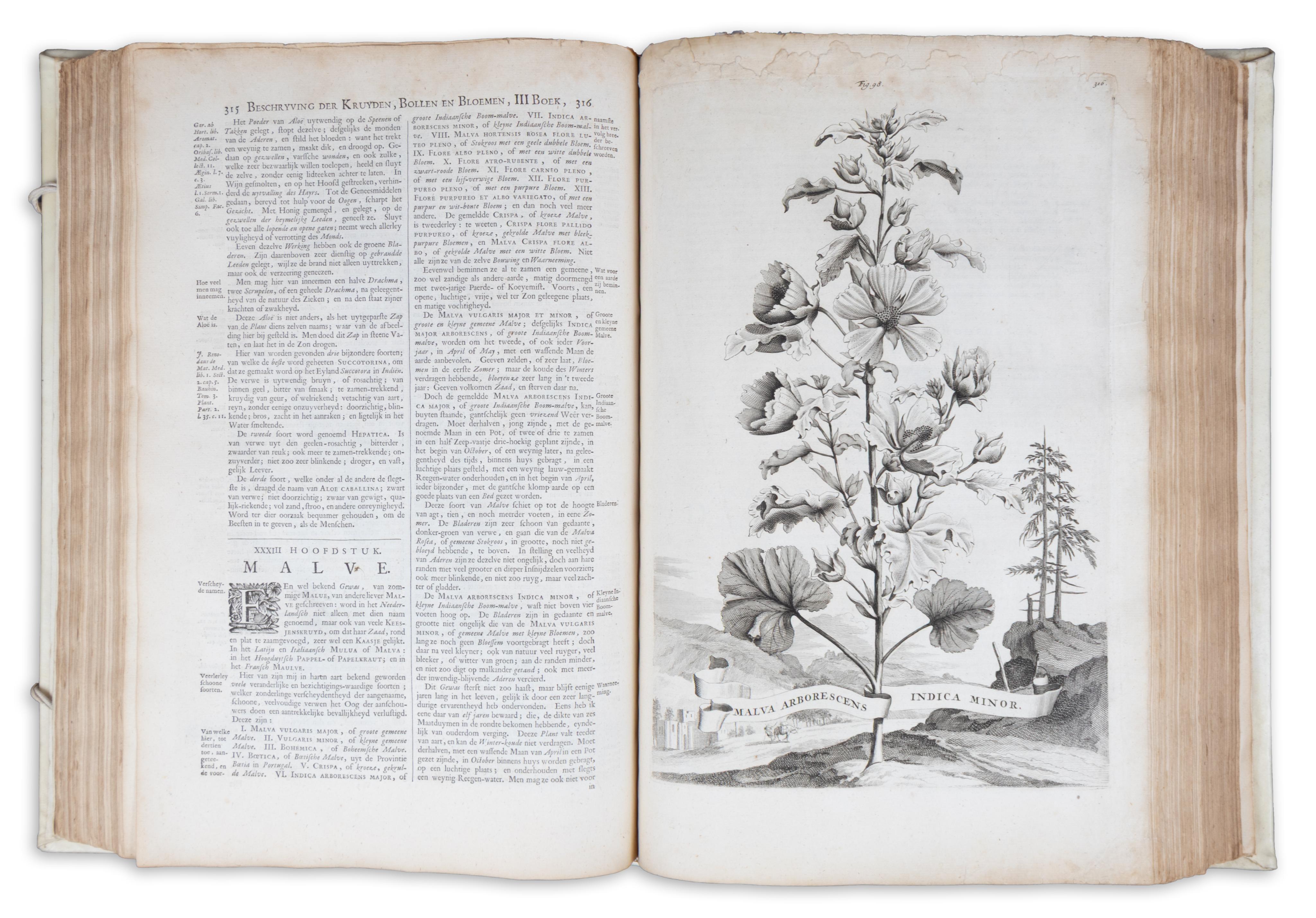 Leiden - Utrecht, 1696. Pieter van der Aa - François Halma,A tizenhetedik század egyik legvonzóbb holland florilégiumának első bővített kiadása. 1 t. (rézmetszetű díszcímlap J. Baptiste Monnoyer által, Jan Goeree után) + [37] p. + 930 (recte 932) hasáb + [60]p. +243 t. (rézmetszetek). Vörös és fekete színnel nyomtatott címlap, metszett vignettával, számos metszett fej- és záródíszek, fametszet iniciálék; Hiányzik az utolsó levél.