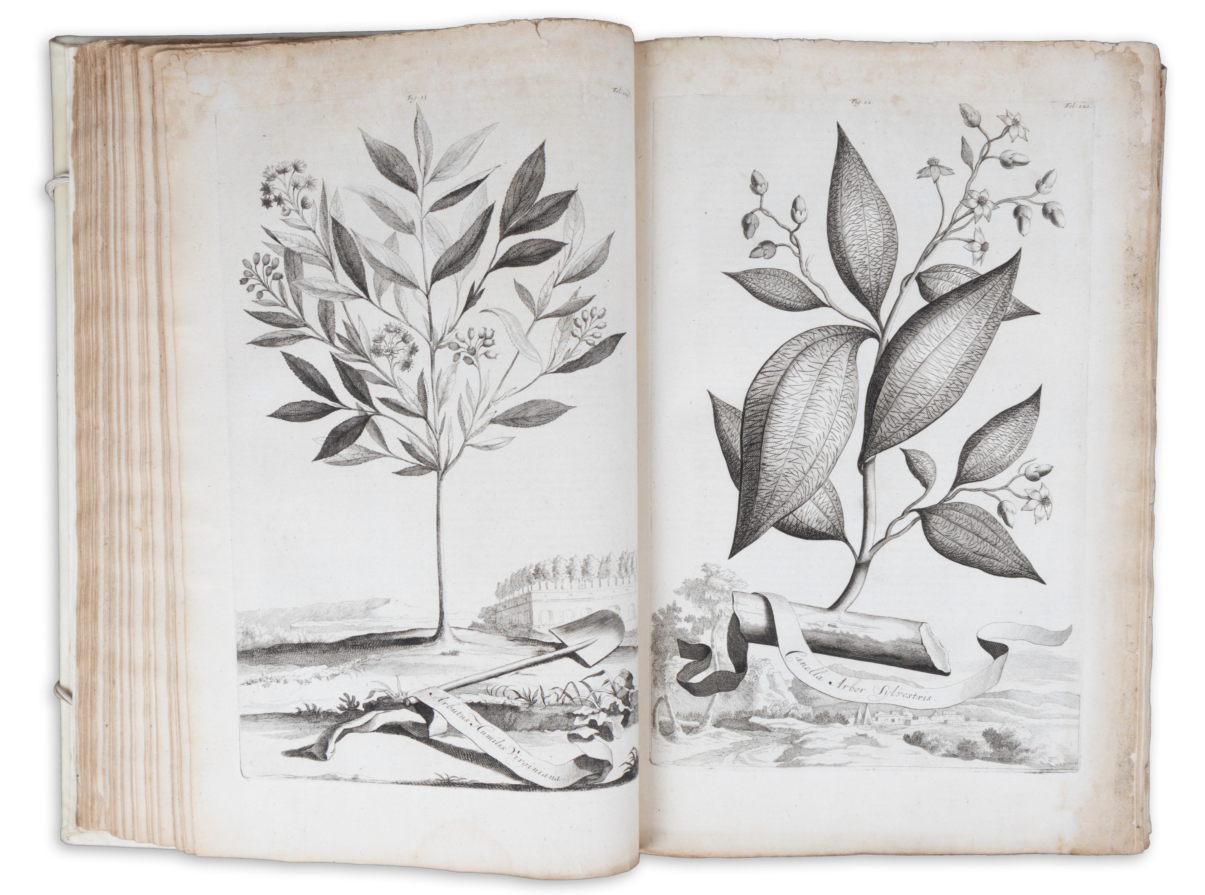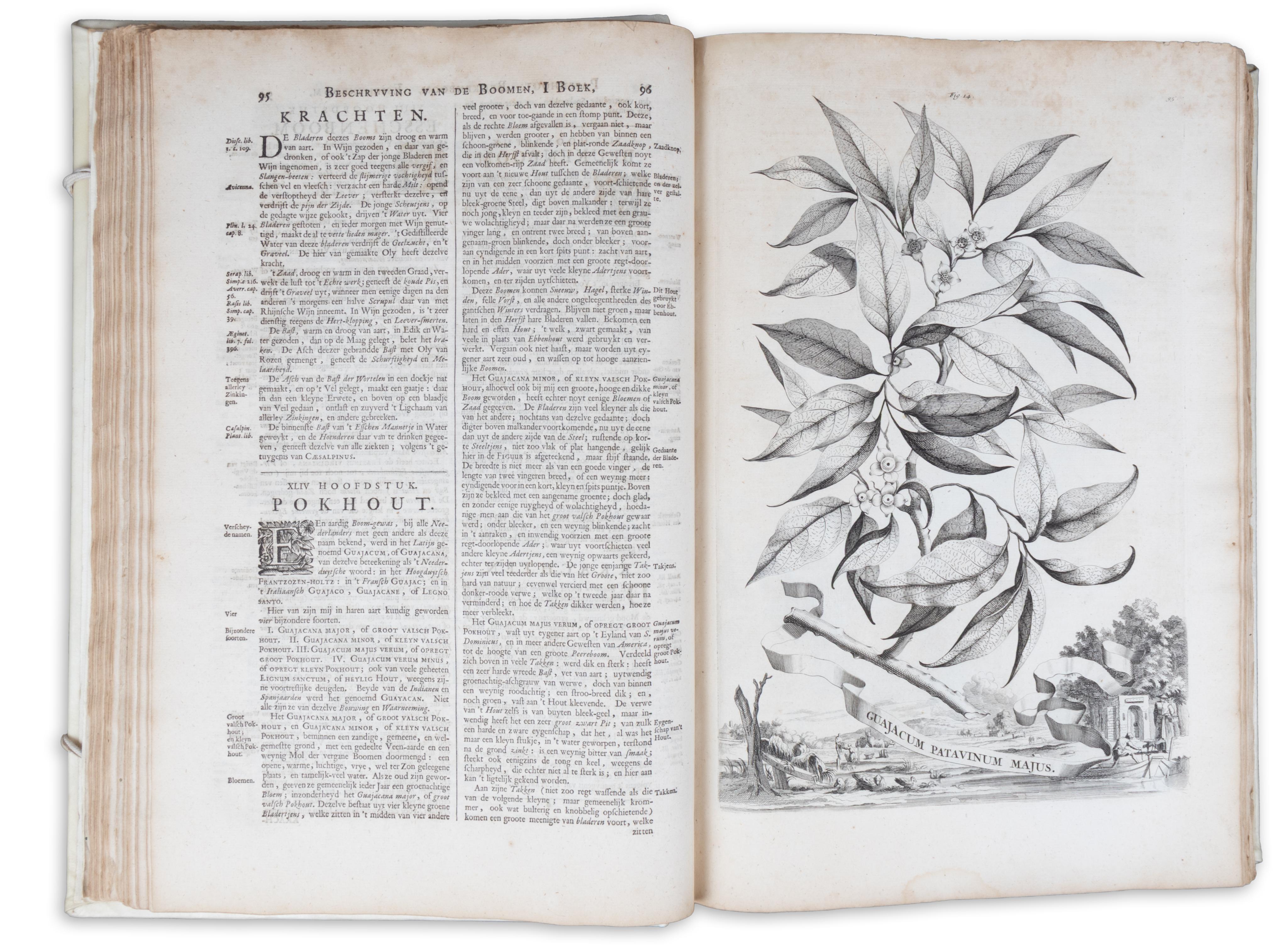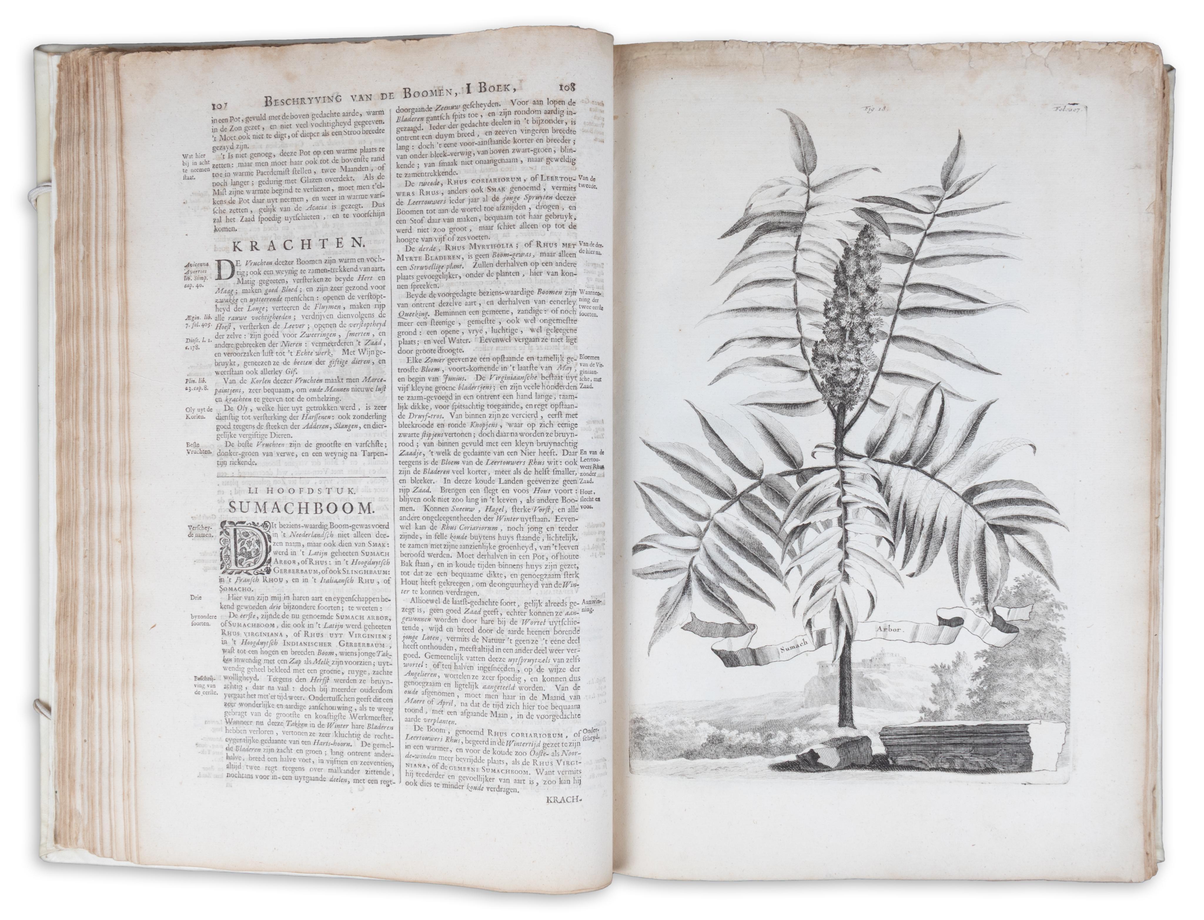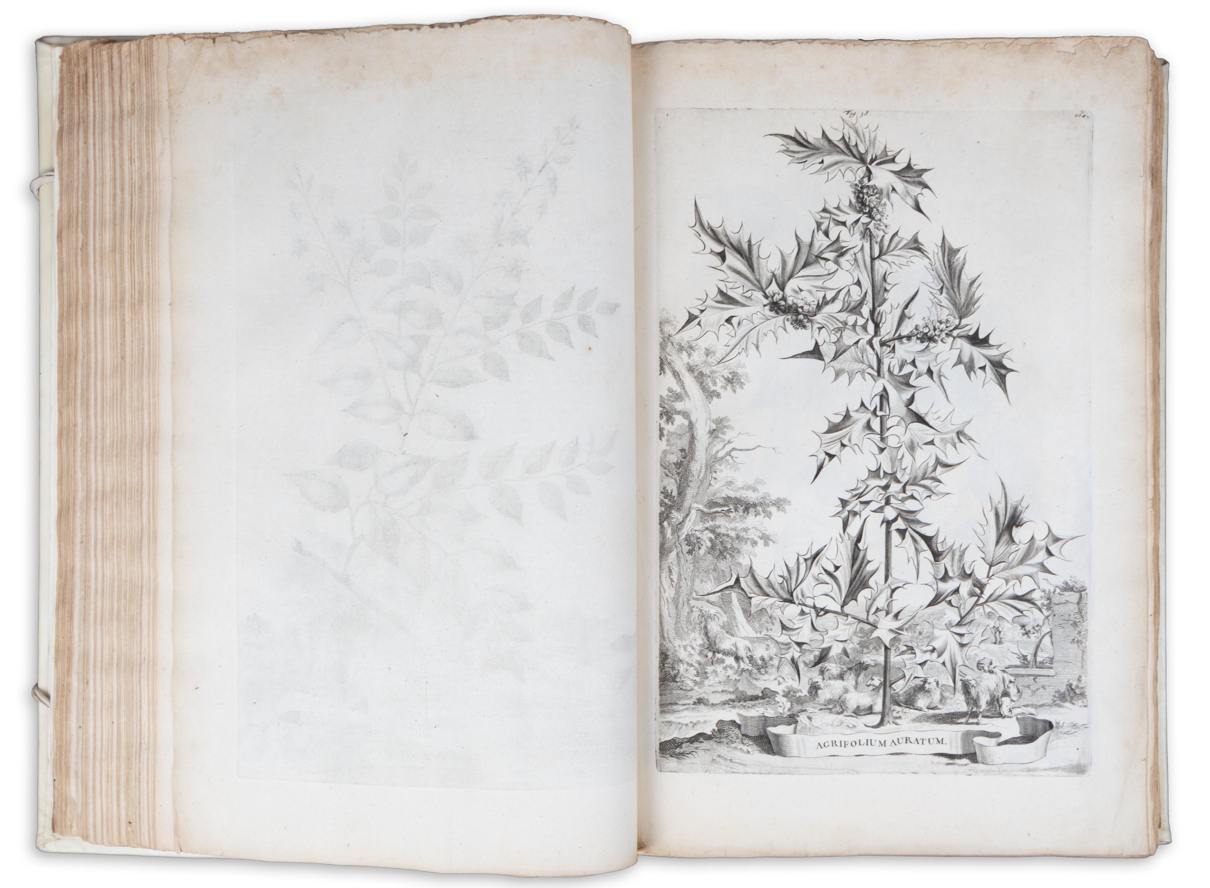Leiden - Utrecht, 1696. Pieter van der Aa - François Halma,A tizenhetedik század egyik legvonzóbb holland florilégiumának első bővített kiadása. 1 t. (rézmetszetű díszcímlap J. Baptiste Monnoyer által, Jan Goeree után) + [37] p. + 930 (recte 932) hasáb + [60]p. +243 t. (rézmetszetek). Vörös és fekete színnel nyomtatott címlap, metszett vignettával, számos metszett fej- és záródíszek, fametszet iniciálék; Hiányzik az utolsó levél.
