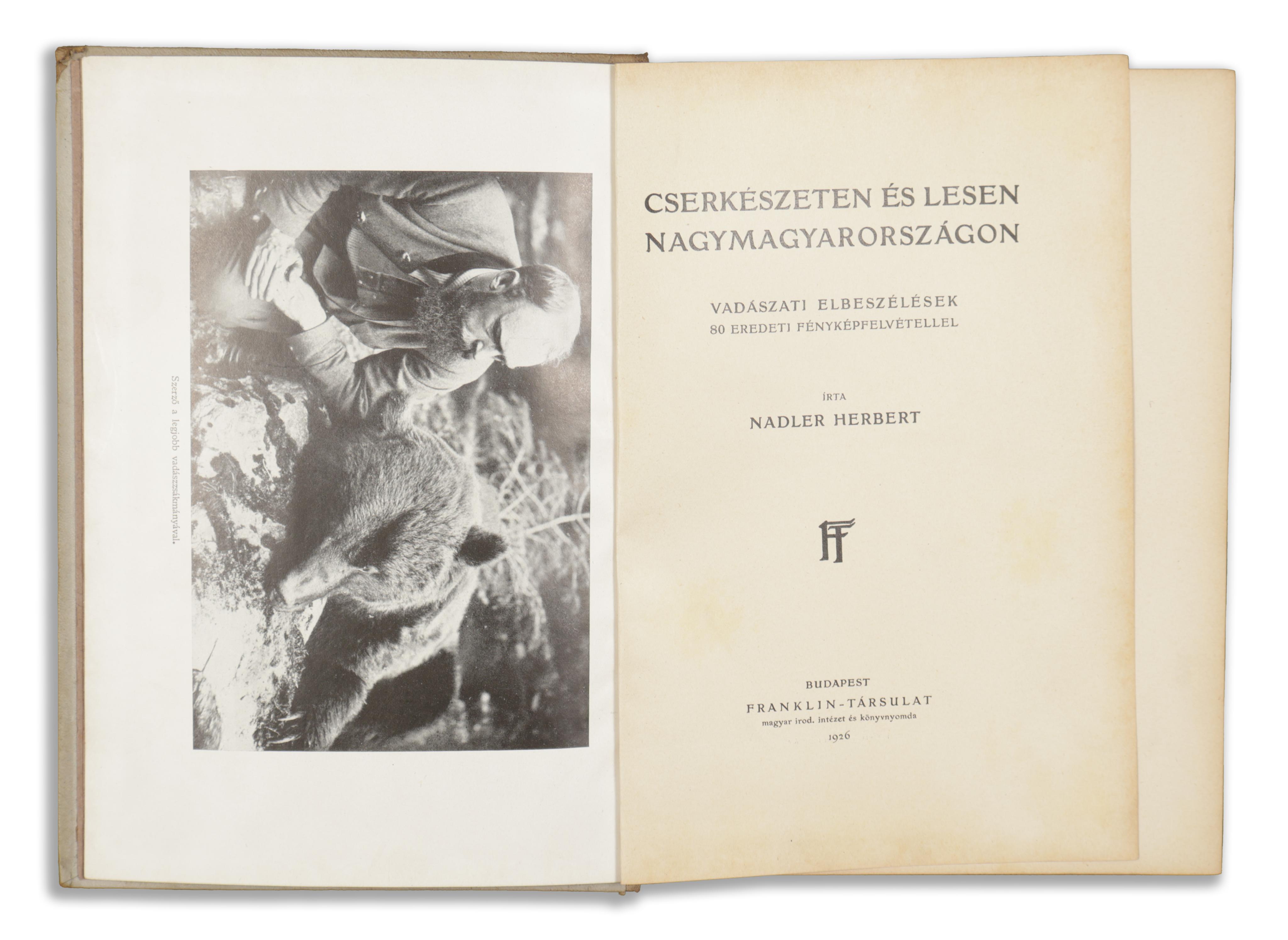 Scouting and reading in Greater Hungary. Hunting narratives with 80 original photographs. Publisher's full cloth binding, with illustration on the front board. Slightly worn copy.