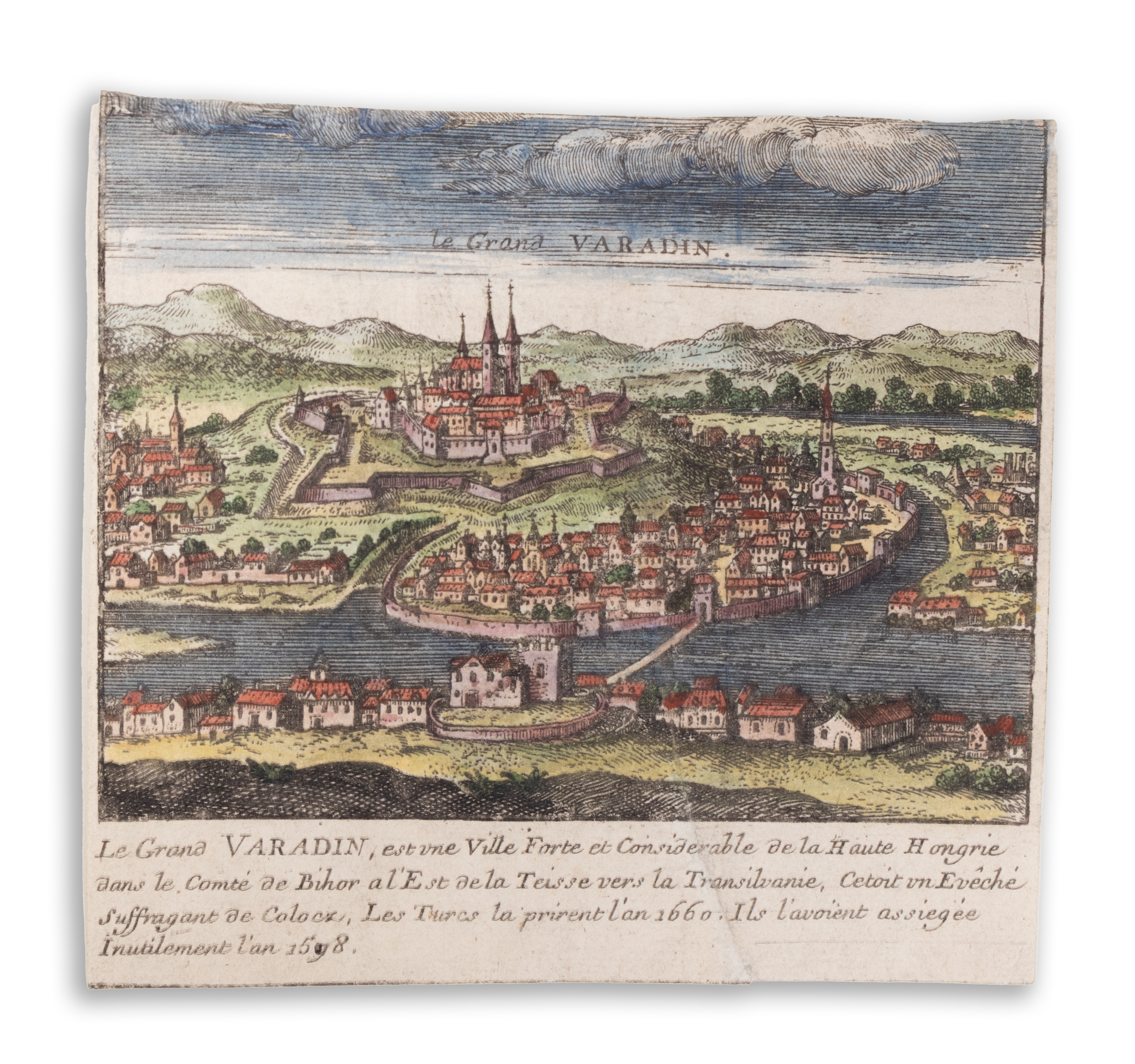 Le grand Varadin. Colored copperplate view of Nagyvárad, Oradea, Gross Wardein. With a small fold mark.