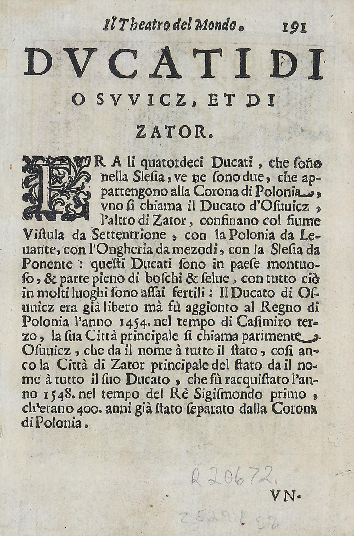 With accompanying text in Italian on the verso to the previous map of the Dukedomes of Oswitz and Zato in Poland (modern-day Auschwitz and Zator). Good condition.