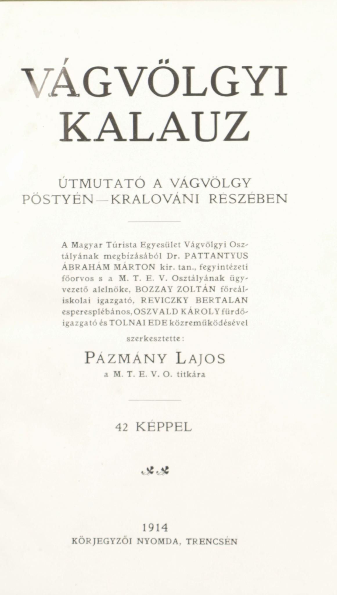 1914, Trencsén, Magyar Turista Egyesület Vágvölgyi Osztályának kiadása (Körjegyzői Nyomda, Trencsén).