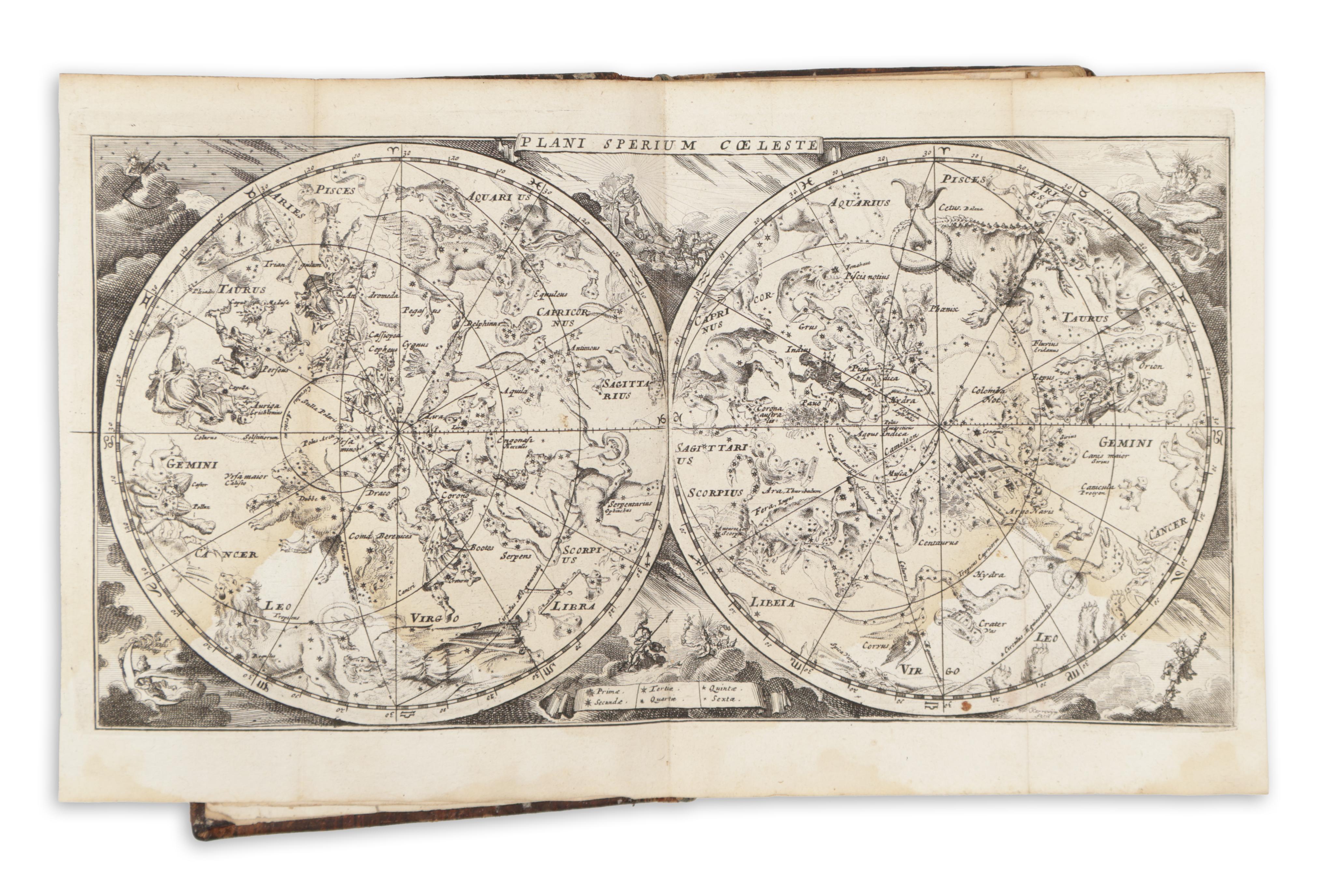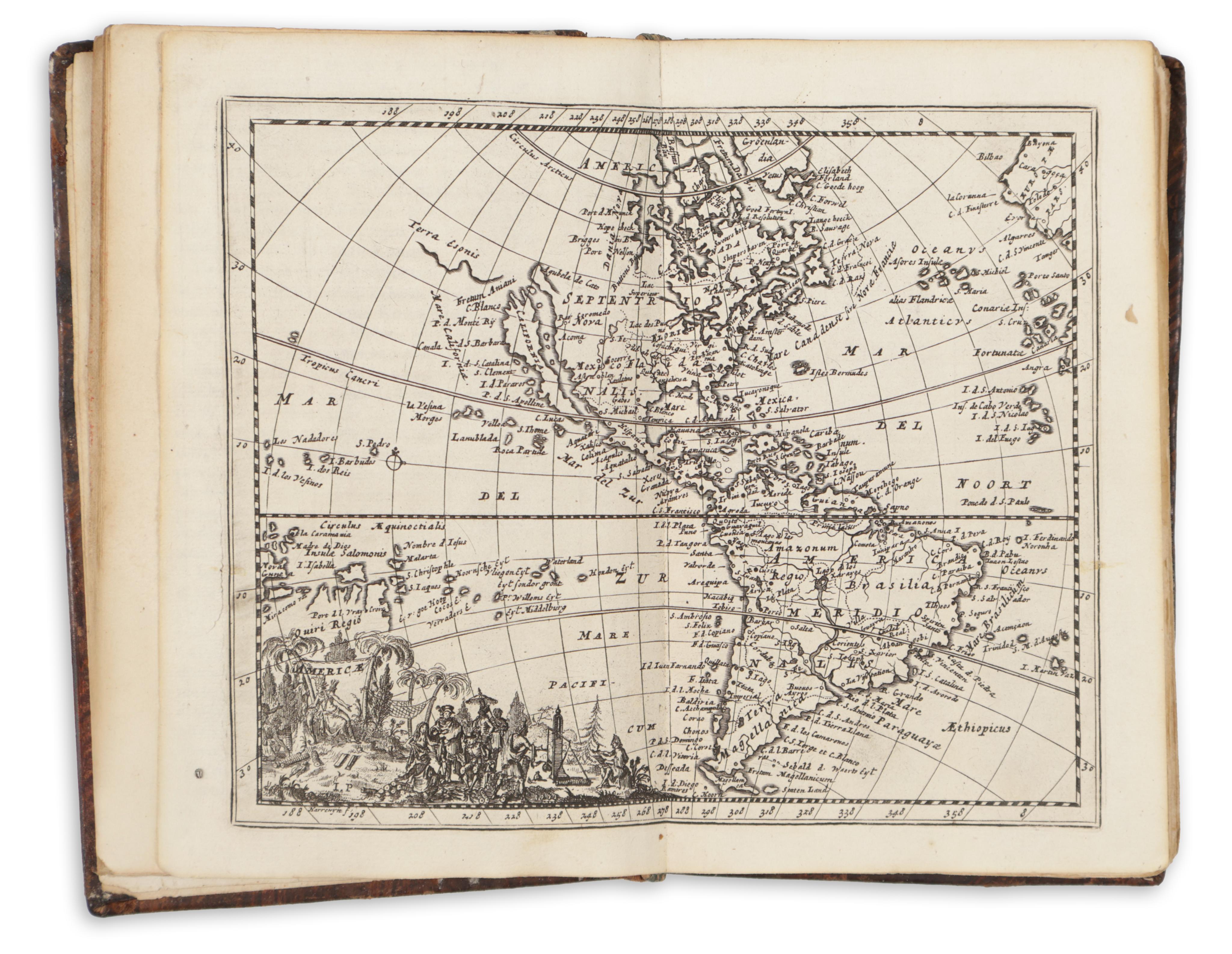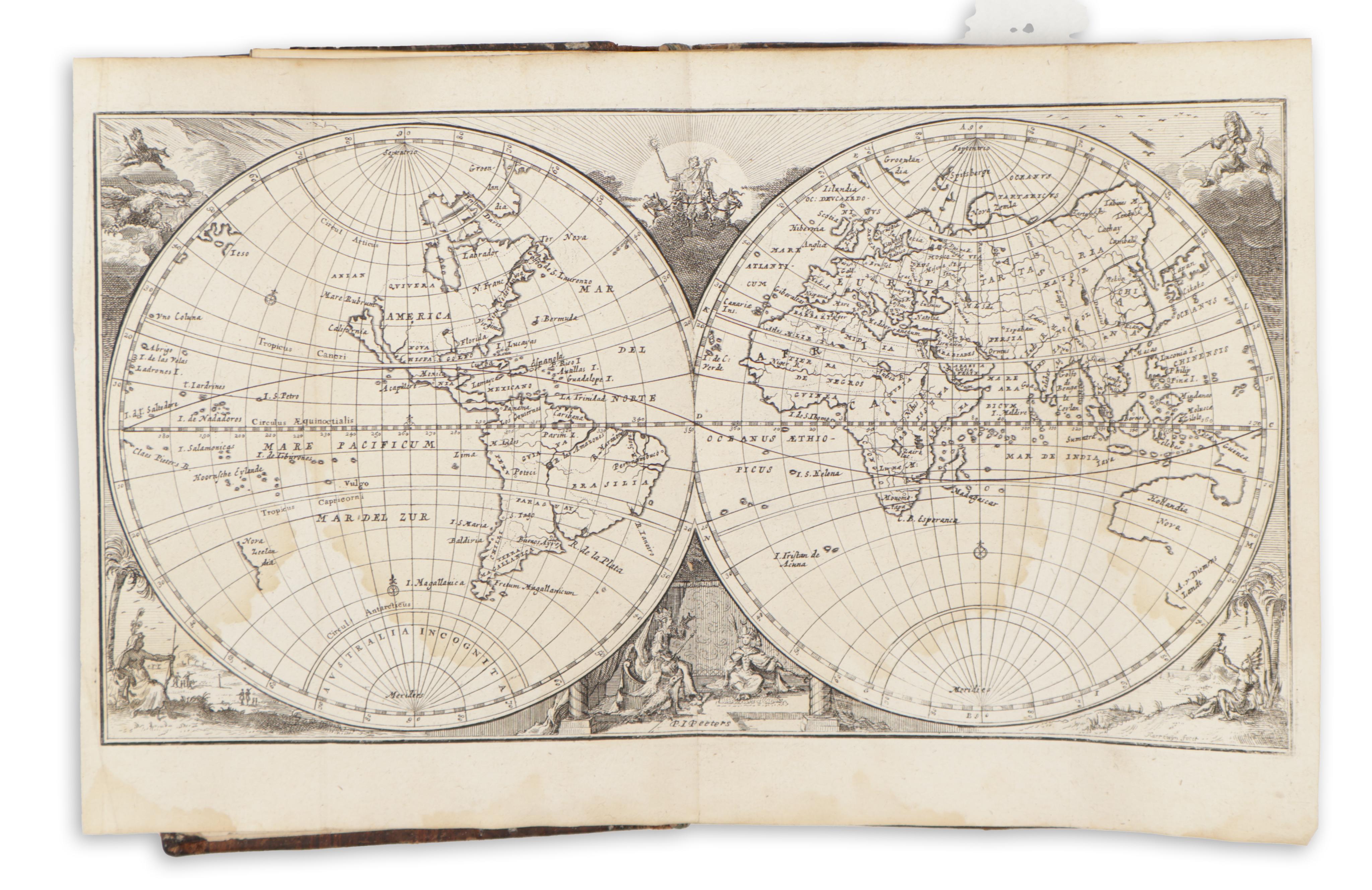 Contains celestial planisphere, world map, globe, four continents (California is an island on the map of America), 17 Provinces of the Netherlands, 12 maps of the main kingdoms of Europe, 7 maps of Asia.
