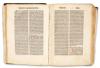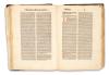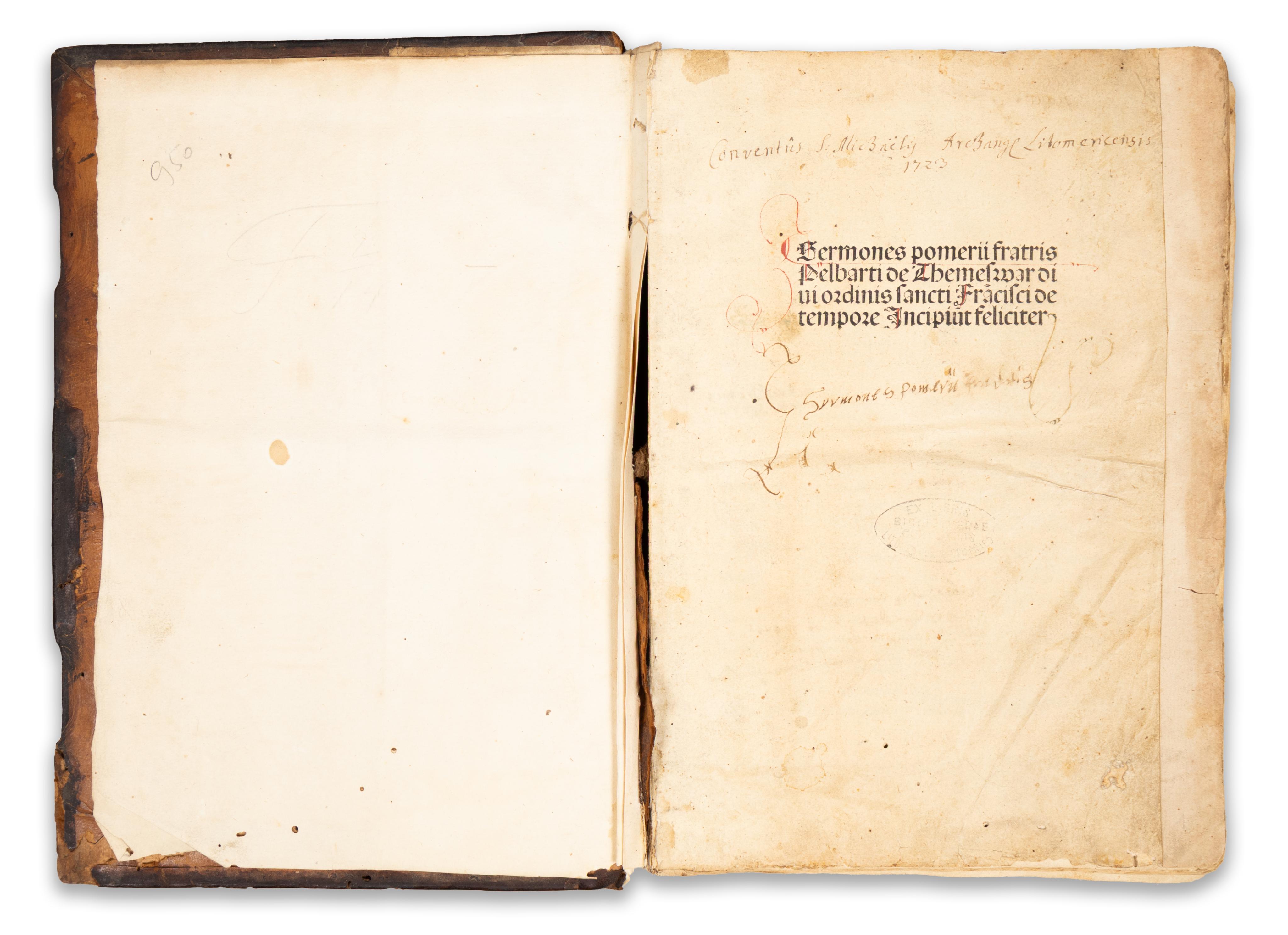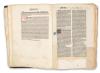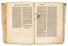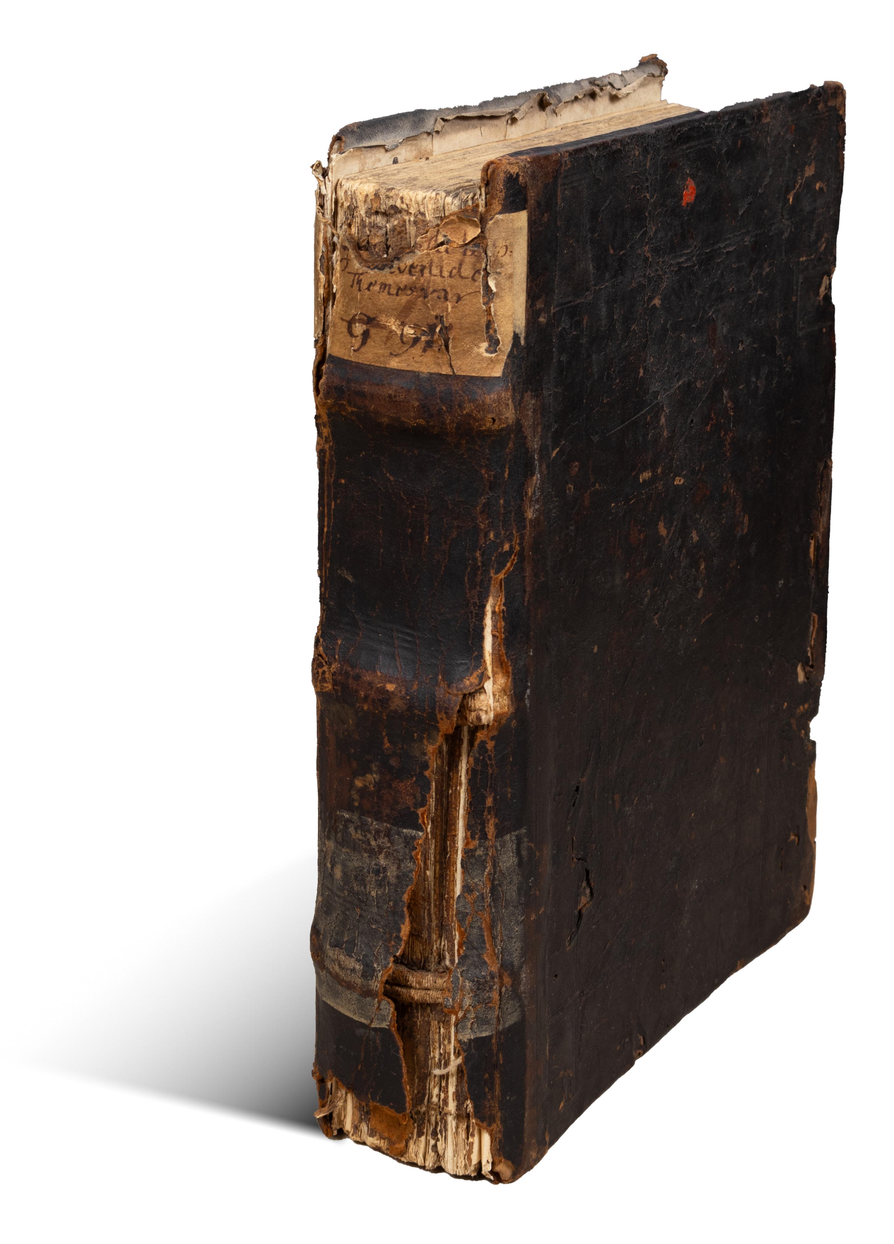 In worn, contemporary Gothic leather binding. Spine is damaged, partially detached from the bookplate, with minor losses to the front and back boards. In need of restoration. Some pages are detached.