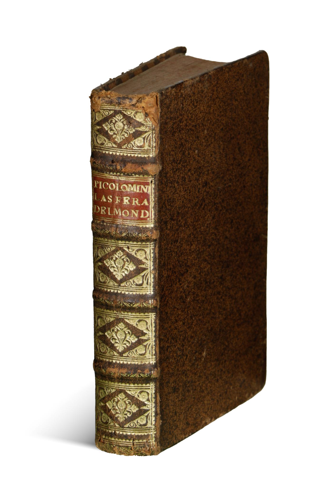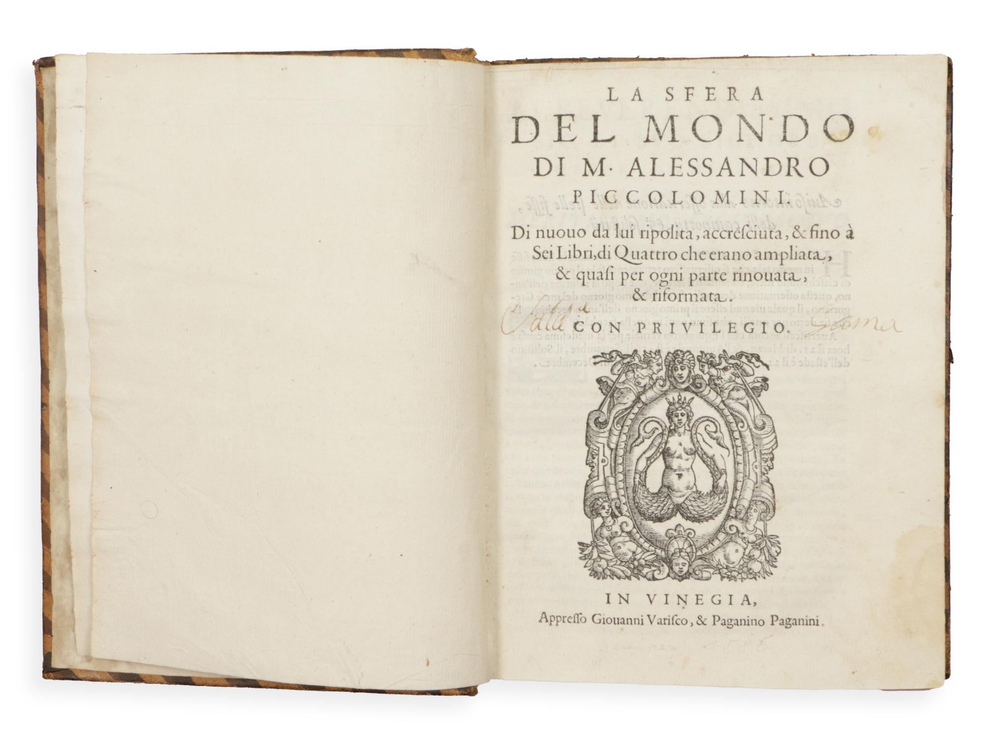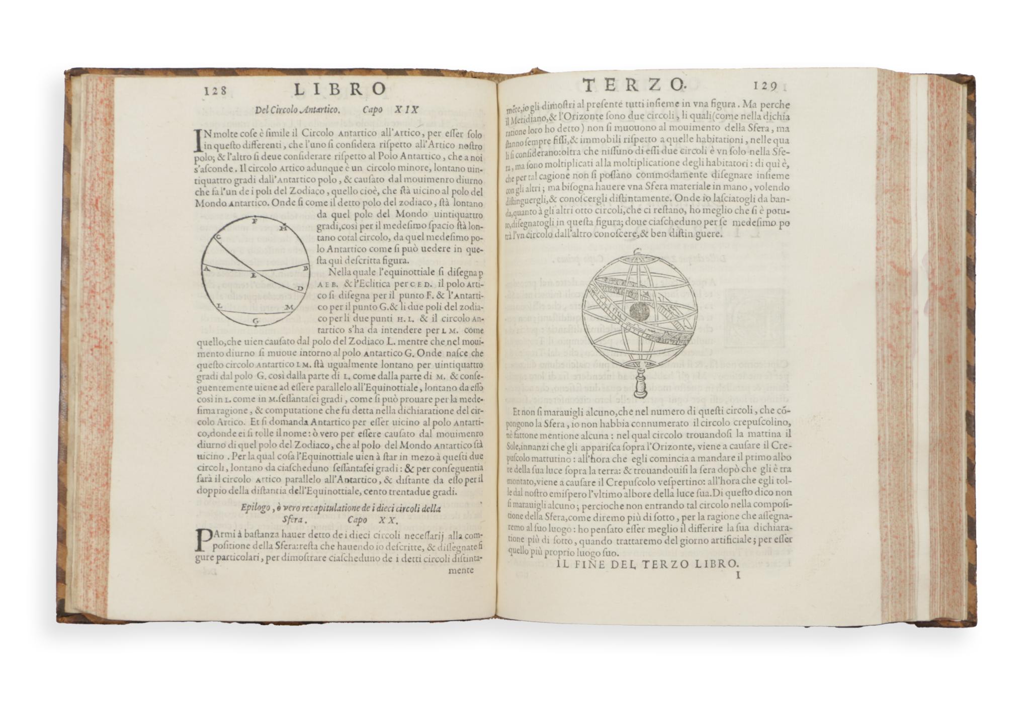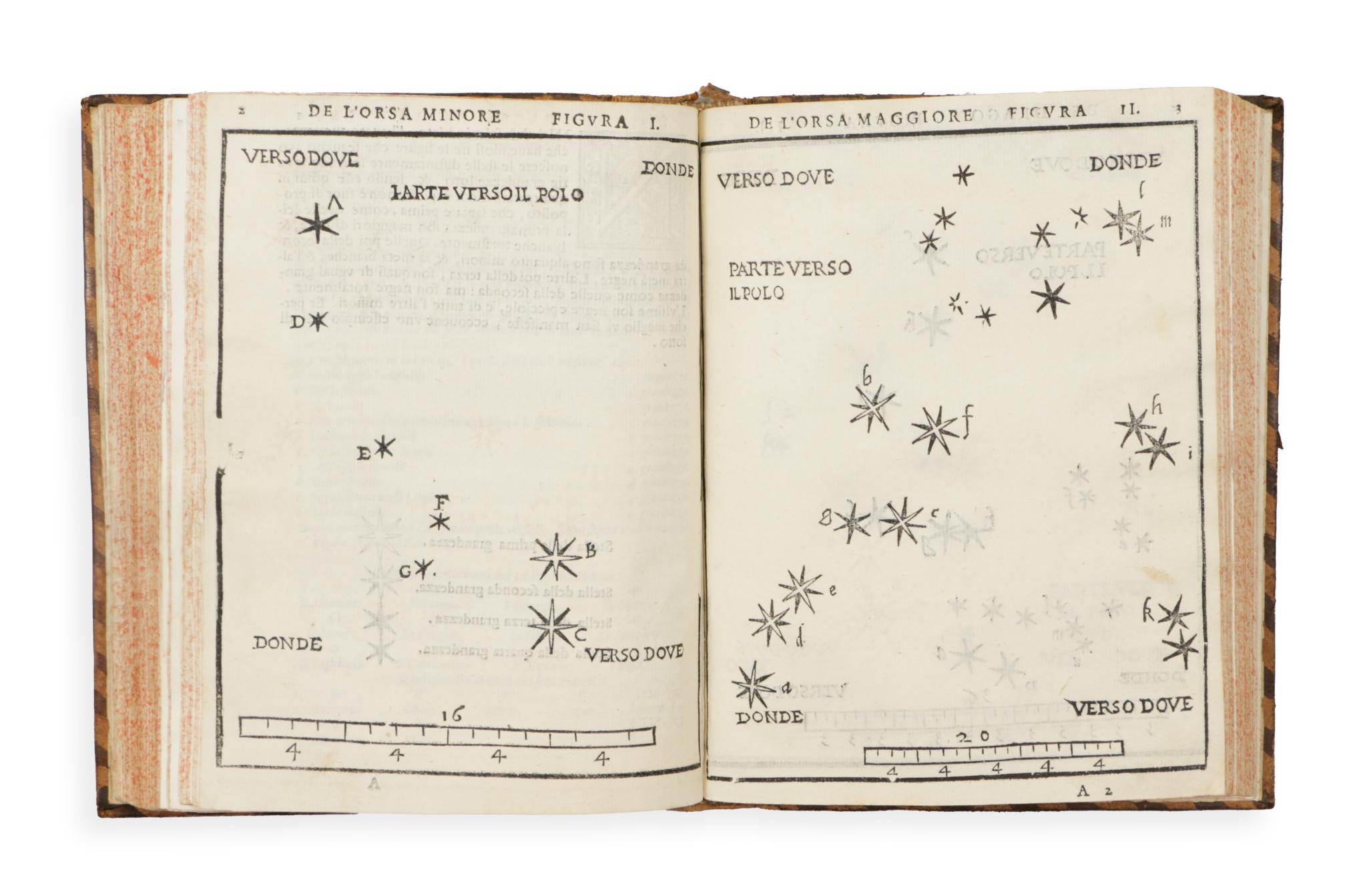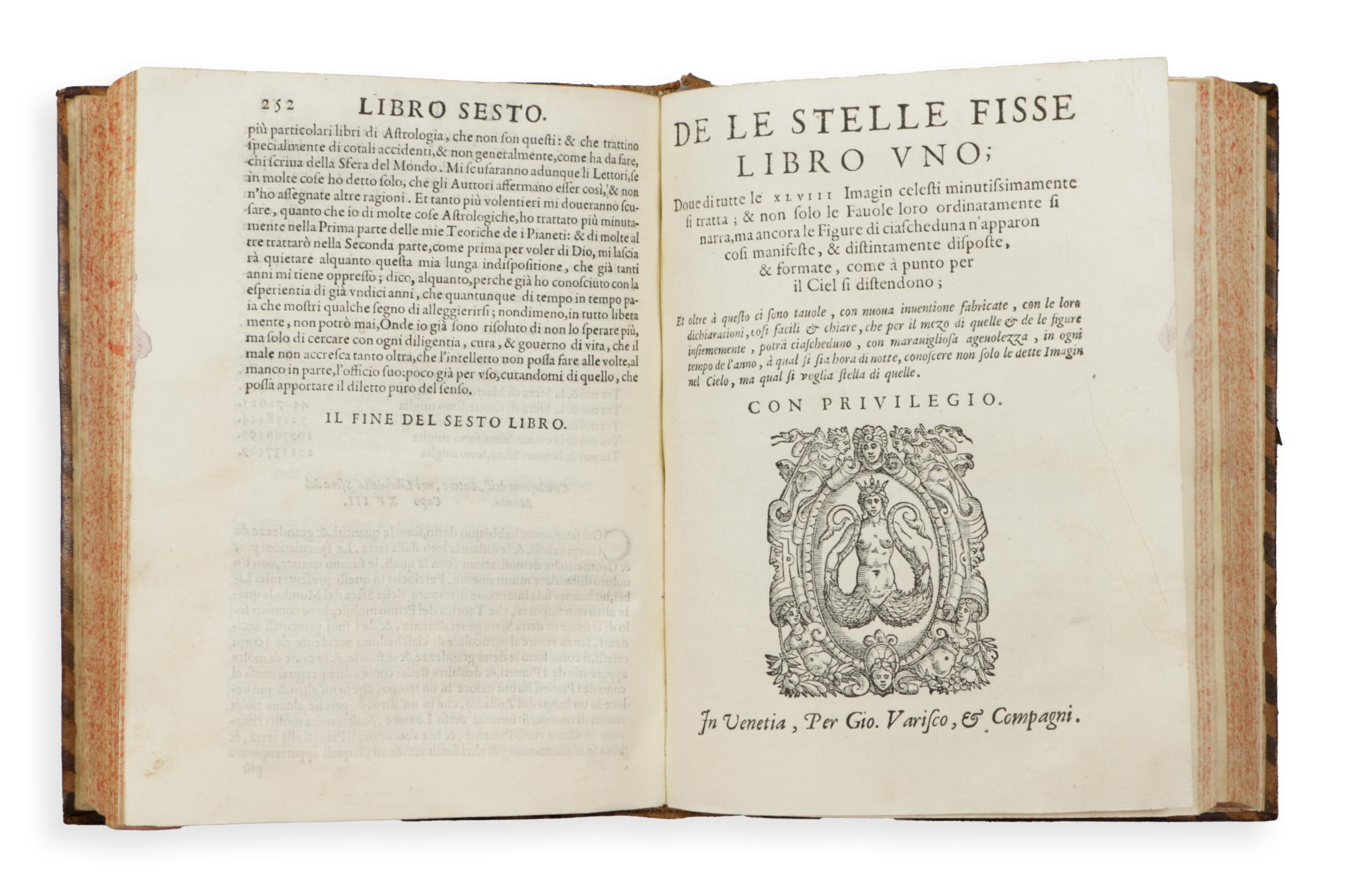 Allessandro Piccolomini (1508-1579), Italian humanist philosopher, astronomer, literary man. De la sfera del Mondo is a remarkable presentation of traditional Ptolemaic-Aristotelian geocentric cosmography. Perhaps even more interesting is the self-numbered appendix of the book, entitled 'De le Stelle Fisse', which is the first star atlas to appear in print. Several features of this work distinguish it from earlier (and later) works. Instead of over-illustrated constellations, which are sometimes difficult to interpret, the individual stars are shown on a blank page, similar to the star charts used today. This book introduced the alphabetical identification of stars and their luminosities, a method later adopted and extended by Johann Bayer in his 'Uranometry'. Very nice gilt leather binding.