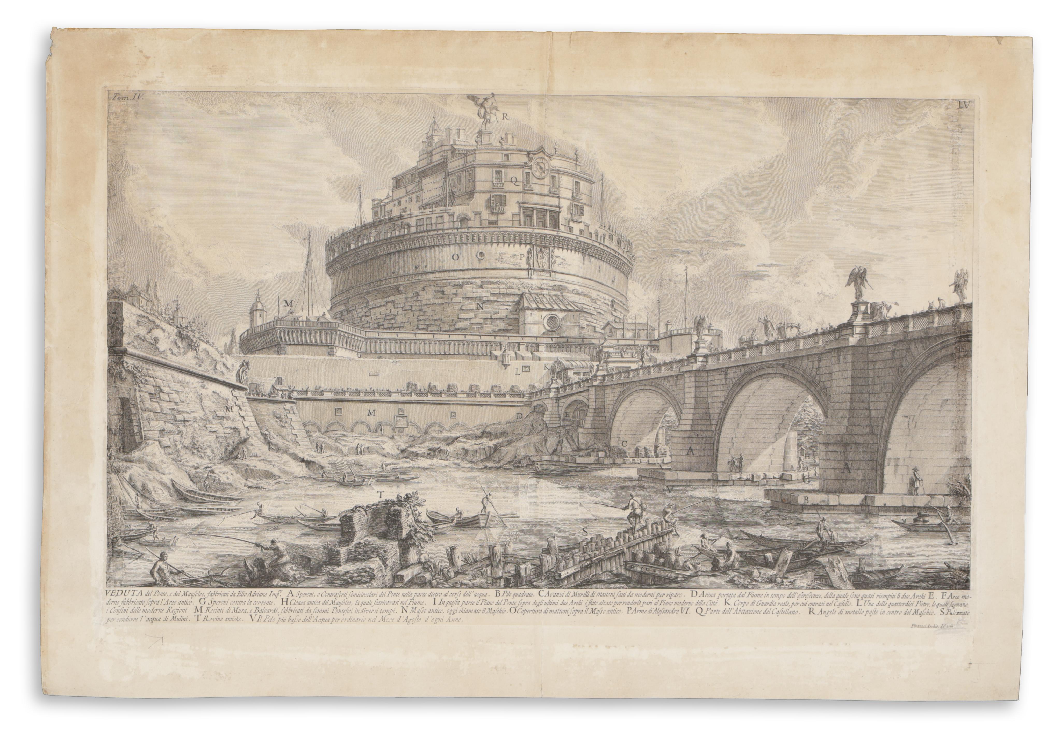 This copper engraving from the famous Piranesi shows a view from the river of the Castel Sant'Angelo with the bridge, Ponte Sant'Angelo, on the right. Rome, Italy. Lightly stained, professionally repaired.