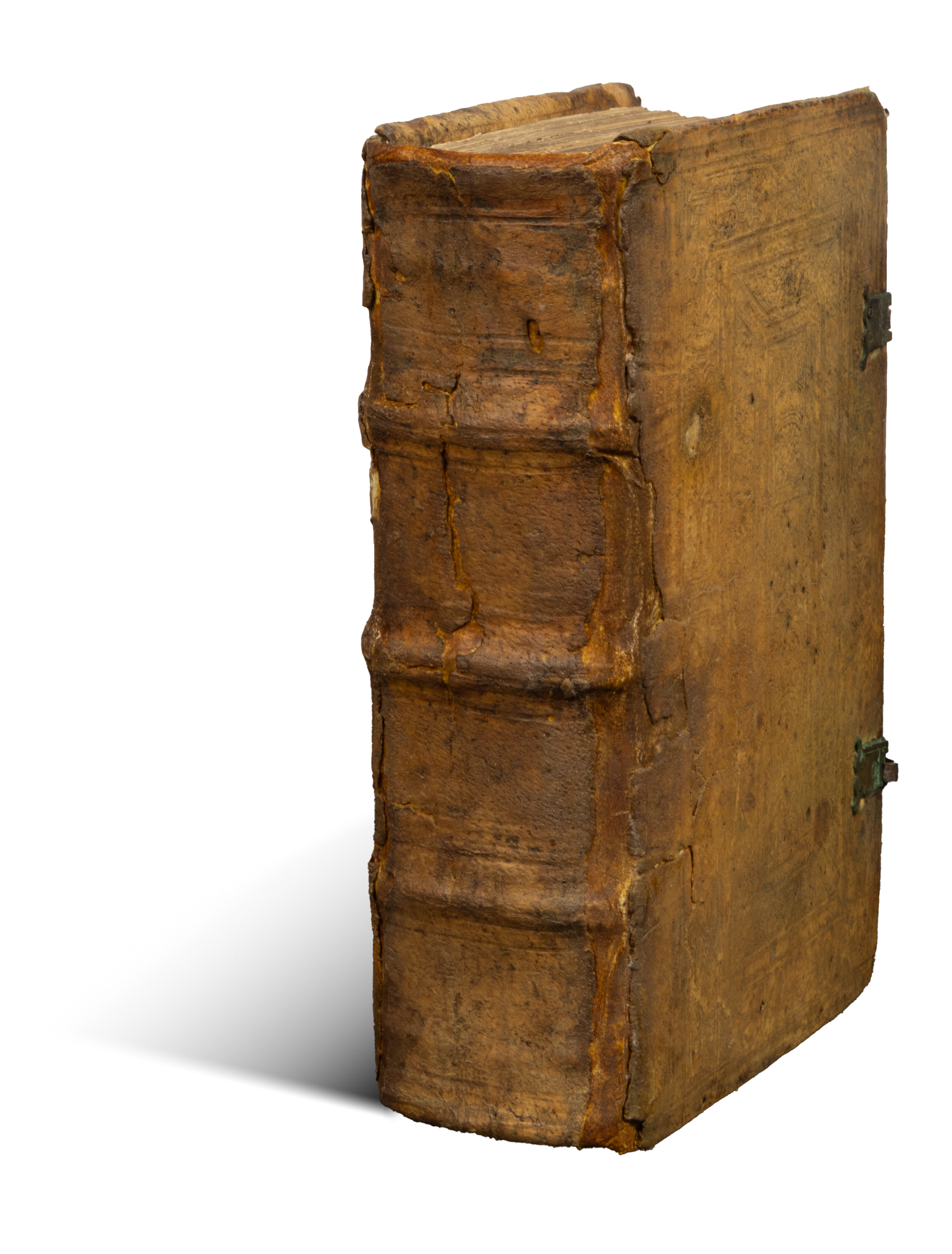 Korabeli javított és pótolt, préselt és vaknyomásos egészbőr kötésben. Előzékén, címlapján és a levelek szélein régebbi tintás rájegyzések. Címlapja fametszetes, utolsó levelén szép nyomdásznyelvény. Csatokkal