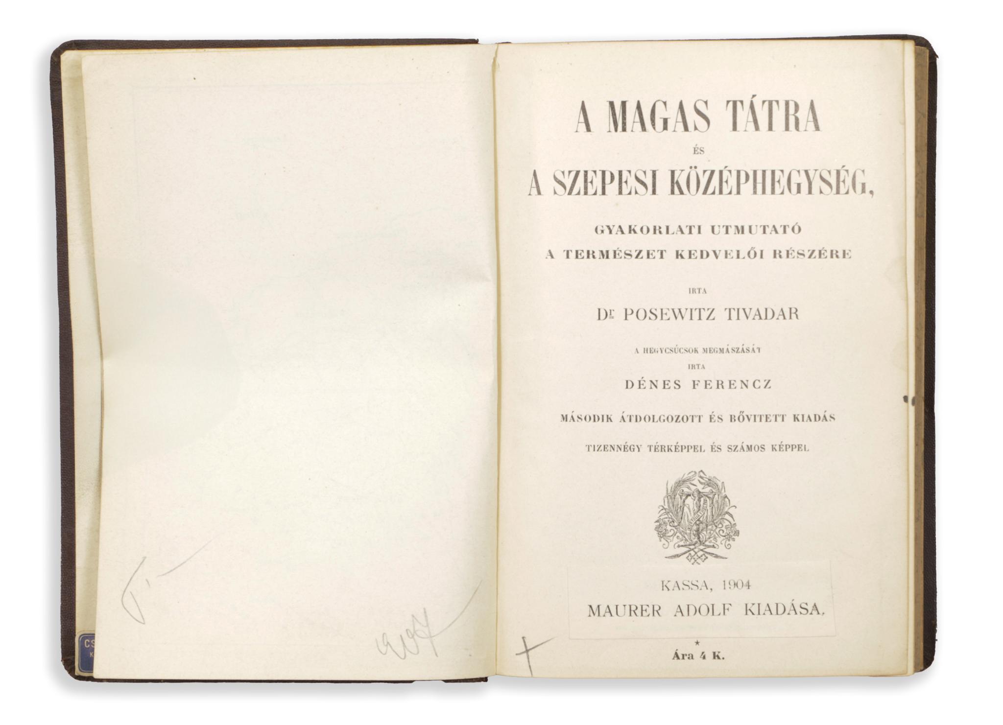 1904 KassaA magas Tátra és a Szepesi Középhegység. Gyakorlati útmutató a természet kedvelői részére. Írta --. A hegycsúcsok megmászását írta Dénes Ferencz. Második átdolgozott és bővített kiadás. Tizennégy térképpel és számos képpel. Kassa, 1904. Maurer Adolf (Franklin).