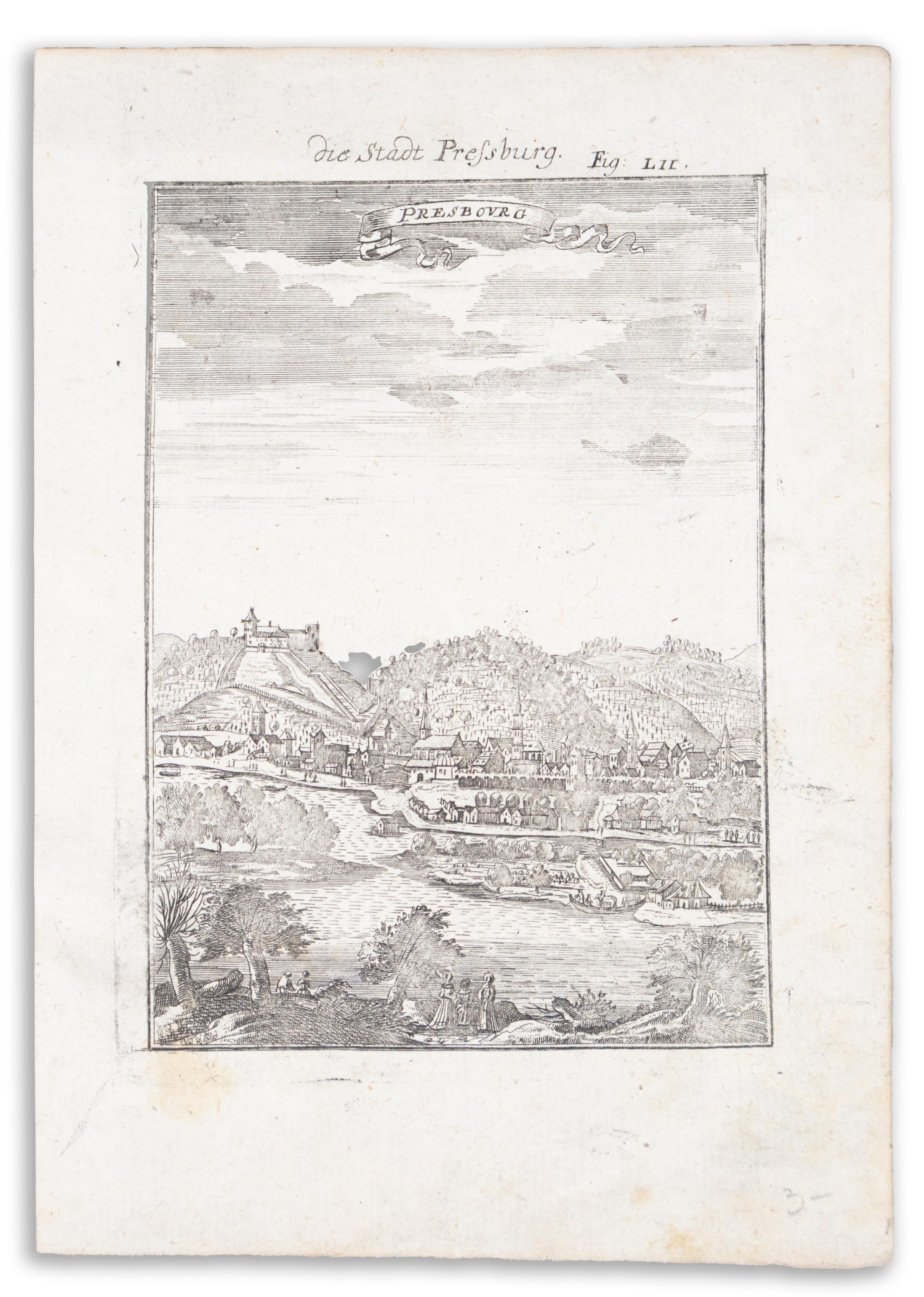 Papír, rézmetszet. Enyhén foltos. Pozsony (szlovákul: Bratislava (1919-ig Prešporok), németül: Pressburg (régiesen Preßburg), latinul: Posonium) vár és város látképe a Duna túlpartjáról felvéve. A kép egy magasan emelkedő kilátóhelyről néz délről a Duna északi partján fekvő városra, a háttérben a Kis-Kárpátok emelkednek. Balra a vár áll egy dombon, a város pedig a lábát szegélyezi.