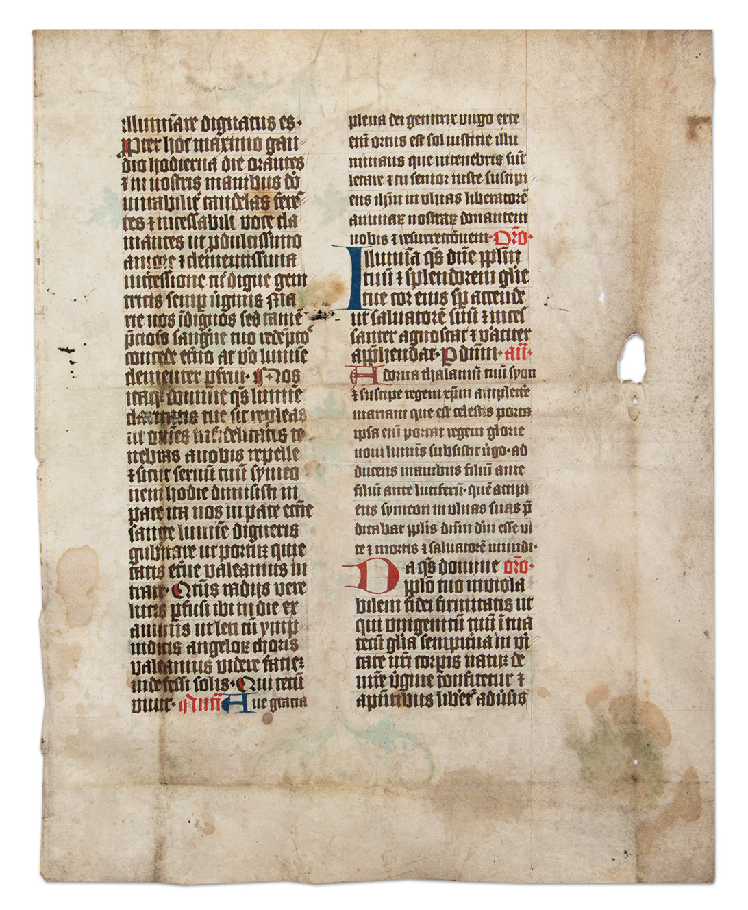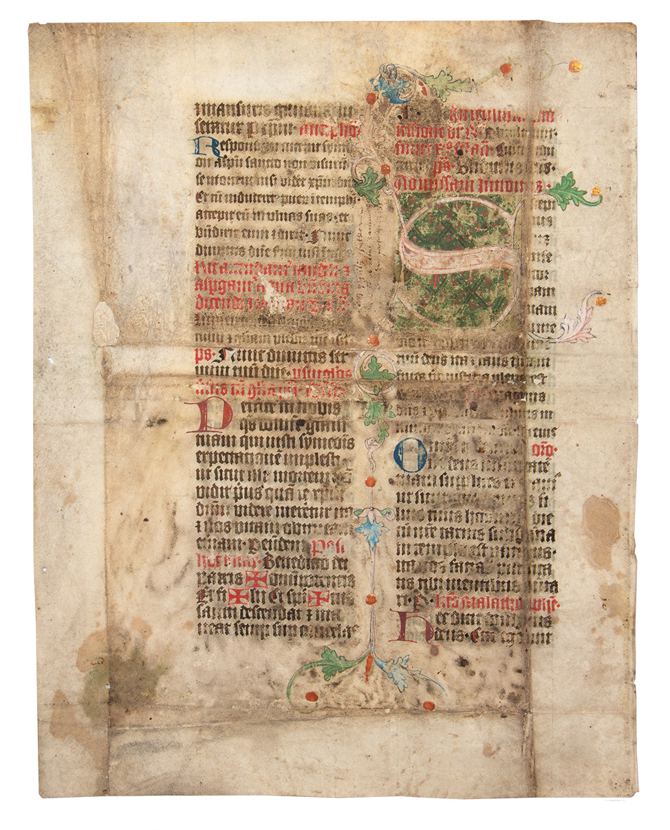 A XV. század első feléből származó misekönyv egy lapja, kódextöredék. A hajtásnyomok és a verso kopásai alapján később felhasználták egy másik könyv kötéséhez, a kopás mértékéből ítélve az őrzőkönyv gyakori használatnak lehetett kitéve. Egy folio, 31×40,2 cm, két hasábban (8,2×28 cm hasábméretben) barna csertintás gótikus könyvírás, a műfajból adódóan eltérő betűnagysággal, átlagosan 31 beírt sorral, a rectón vörös-kék, a versón pedig vörös-kék- zöld díszítéssel. A rectón a szöveget vörös és kék iniciálék illetve vörös színű, a hasáb jobb oldalán elhelyezett rubrikák (antiphona, oratio, psalmus), továbbá a barna nagy kezdőbetűk vörös vonásos kiemelése, míg a jobb hasábban a betűnagyság váltakozása tagolja. A versón mindezeken túl hosszabb, vörös tintás rubrumok (a szertartás végrehajtására vonatkozó gyakorlati utasítások, pl. „Hic accendantur candele et aspergantur aqua benedicta” [„Itt meggyújtják a gyertyákat és meghintik szenteltvízzel”], stb., az áldások szövegében a Szentháromság nevei előtt vörös keresztekkel), valamint egy gazdagon díszített, fedőfestékes „S” iniciálé látható. Az iniciálé sarkaiból térkitöltő akantuszleveles díszítés indul ki, amelyekből a szövegtest felé esők hangsúlyosabbak, lényegében a hasáb vonalának díszítését alkotják. Az iniciálé mellett a középkori szövegre merőlegesen nehezen olvasható kora újkori feljegyzés.