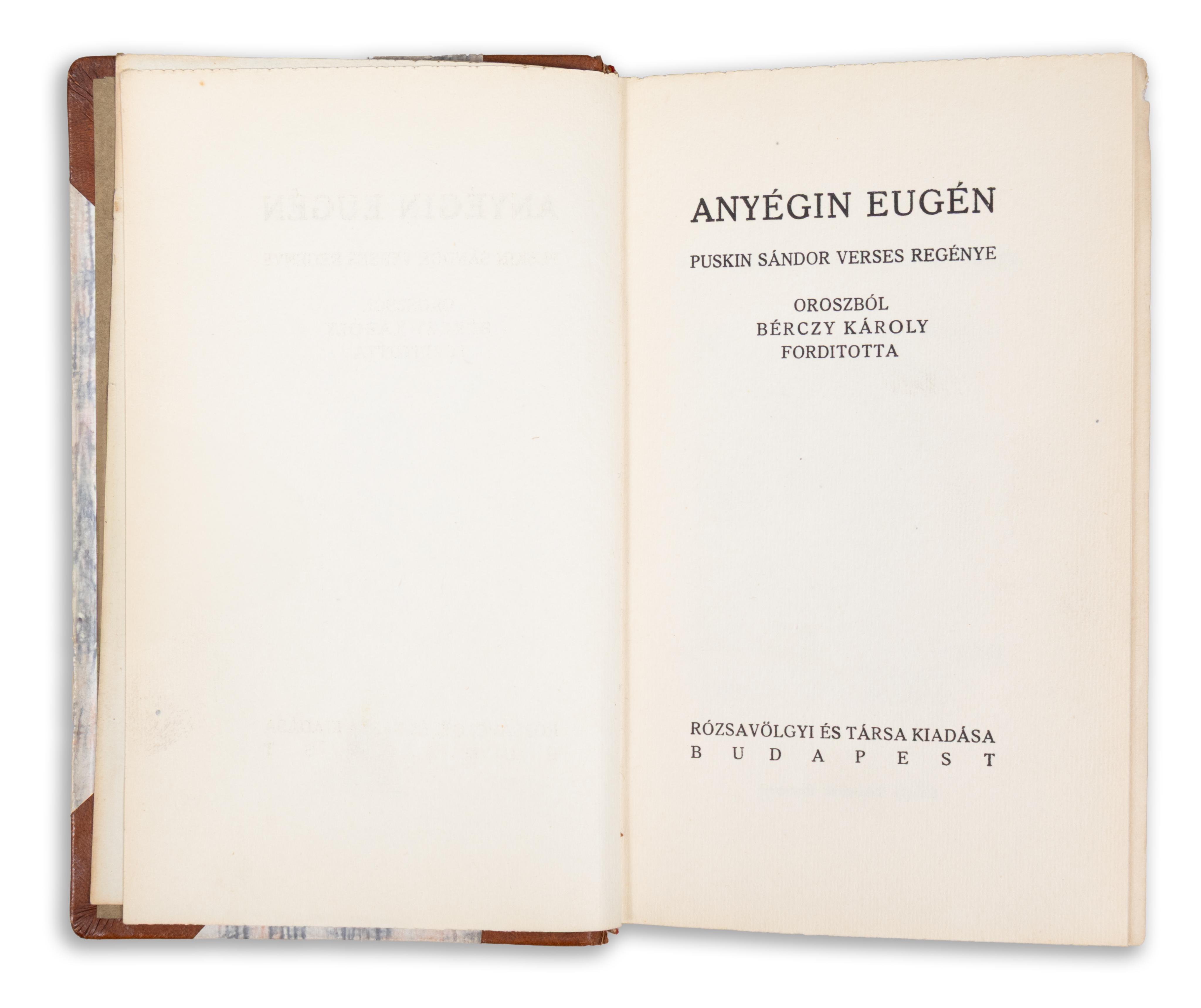 Kolofon: „Puskin Sándor: Anyégin Eugén teljes magyar jegyzetes kiadását Bárczy Gusztáv rendezte sajtó alá. Szedték Korvin Testvérek Linotype-szedőgépen Nordisch-antiqua betűivel. Nyomták 3055 példányban, 1000 példányt simitatlan fehér famentes papiron, 2000 példányt antique papiron, 55 példányt pedig könyvbarátok részére meritett papiron. Ezt az 55 példányt kézzel irott sorszámokkal láttuk el. Ez a példány [a] 24. számot kapta.”