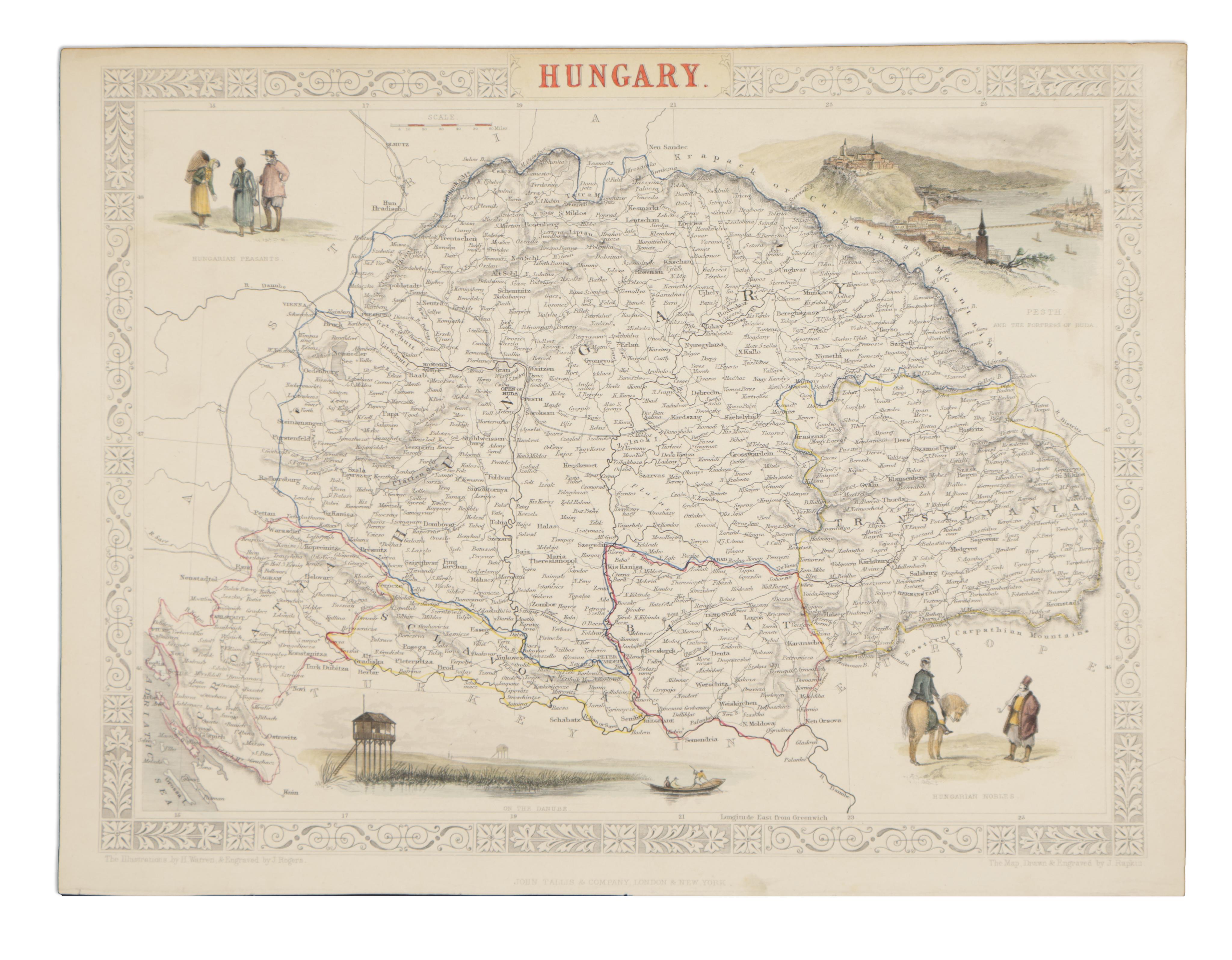 ca.1851.Egy díszes és részletgazdag, a 19. század közepéről származó Magyarország-térkép (beleértve Horvátországot és Erdélyt is), amelyet J. Rapkin rajzolt és metszett (a képeket H. Warren és J. Rogers készítették). Színezett acélmetszet.