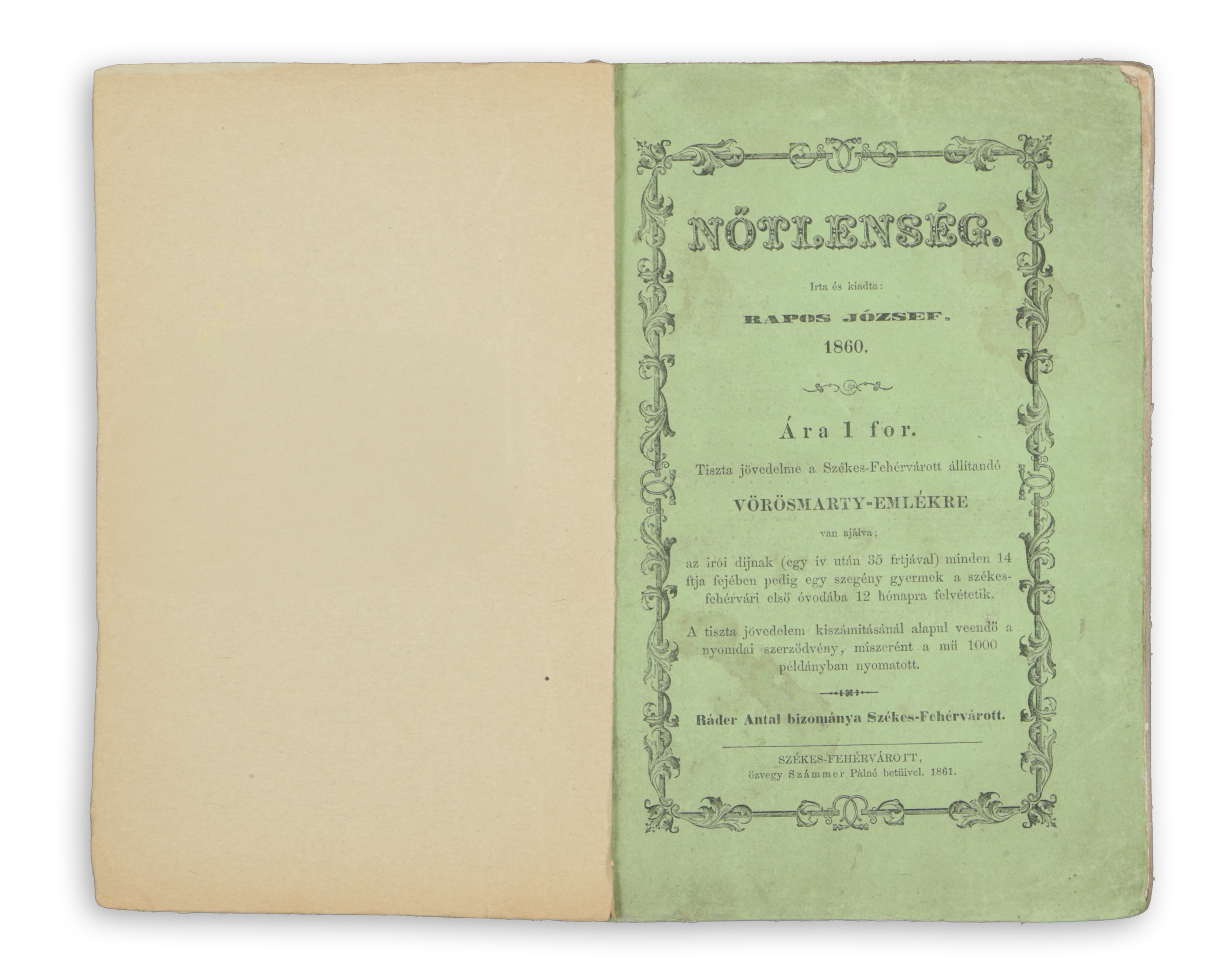 Székes-Fehérvárott, 1861. Özv. Számmer Pálné betűivel.Ár