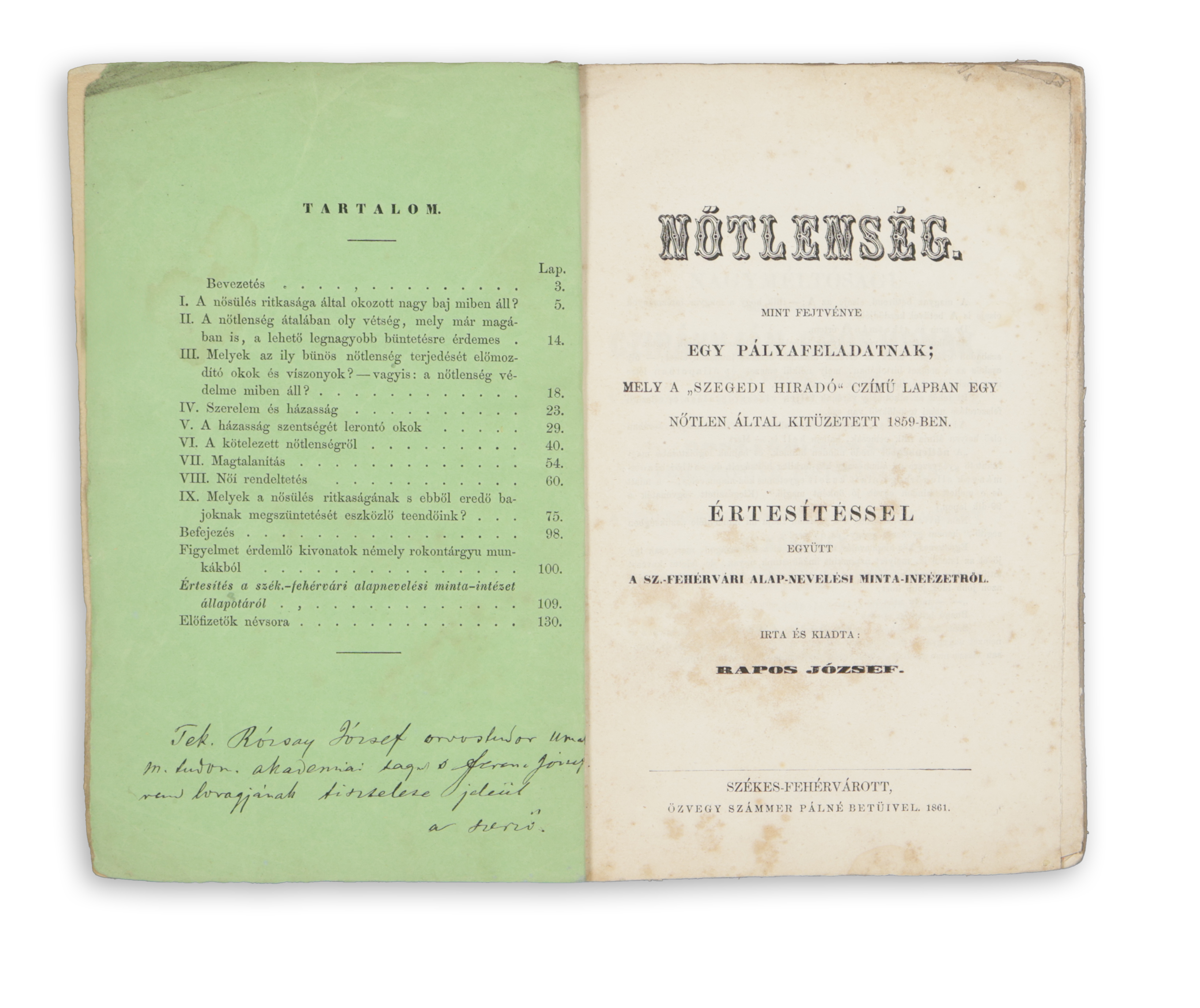 Nőtlenség. Mint fejtvénye egy-egy pályafeladatnak, mely a Szegedi Hiradó czímű lapban egy nőtlen által kitüzetett 1859-ben, Értesítéssel együtt a sz.-fehérvári alapnevelési minta-intézetről.