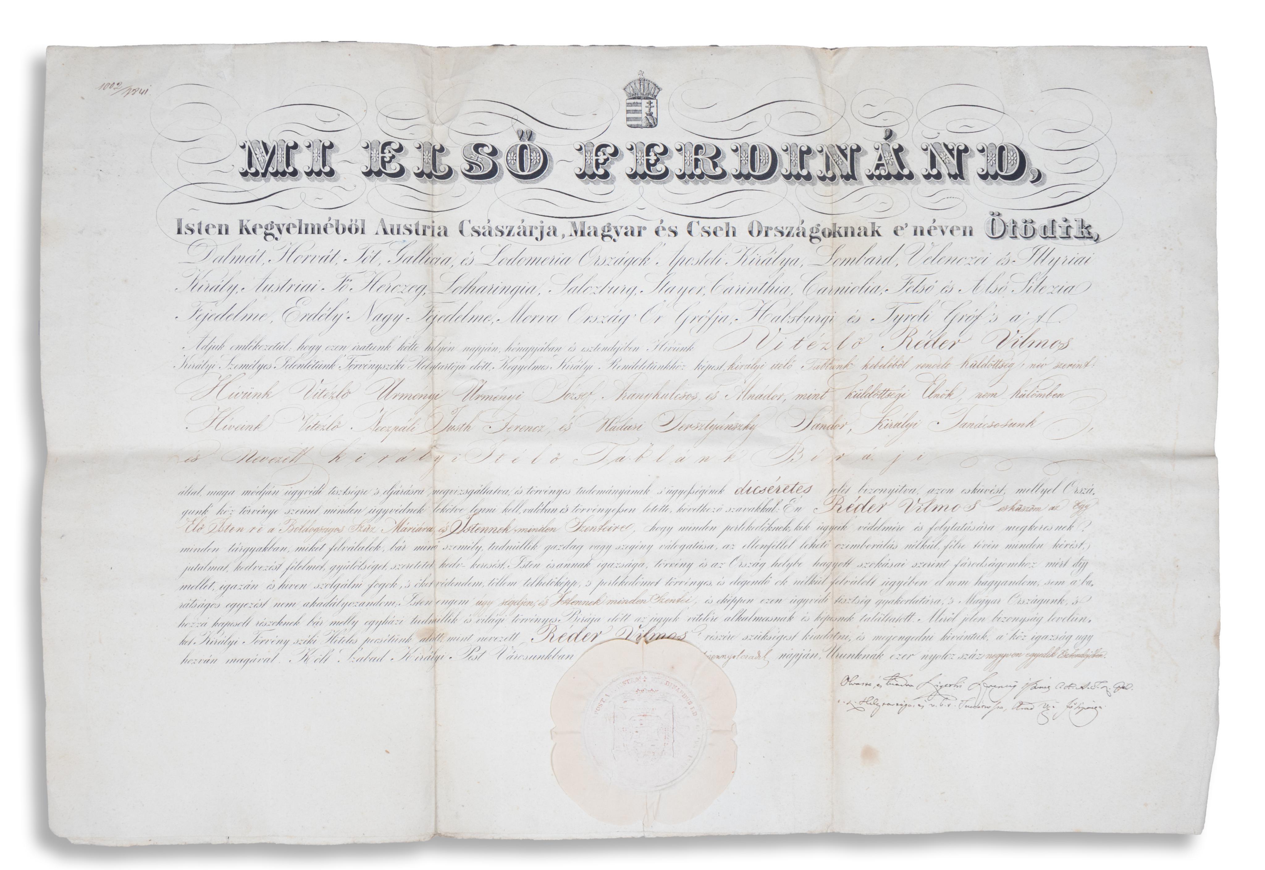 Réder Vilmos ügyvéddé neveztetik ki V. Ferdinánd, Ausztria Császárja, Magyar és Cseh Országoknak ... Királya és Vitézlő Réder Vilmos Királyi Törvényszéki Helytartója előtt, valamint Urményi József Aranykulcsos és Alnádor mint küldöttségi ülnök, Neczpáli Justh Ferencz és Nádasi Tersztyánszky Sándor királyi tanácsosok és a királyi ítélő táblabírói által. A dokumentum tartalmazza Réder Vilmos (ca. 1817-1883) törvényszéki bíró, főszolgabíró ügyvédi esküjének szövegét is. Az oklevél alján két magas rangú császári hivatalnok kézi ellenjegyzése található, egyikük [báró Sándor Mihály] Arad főbírája.