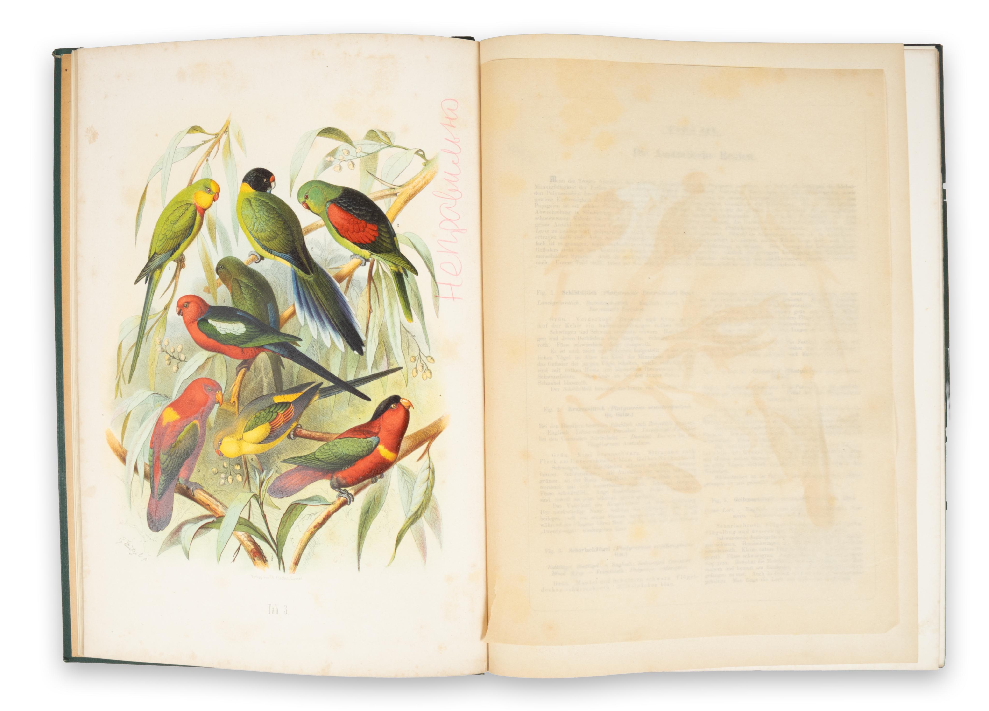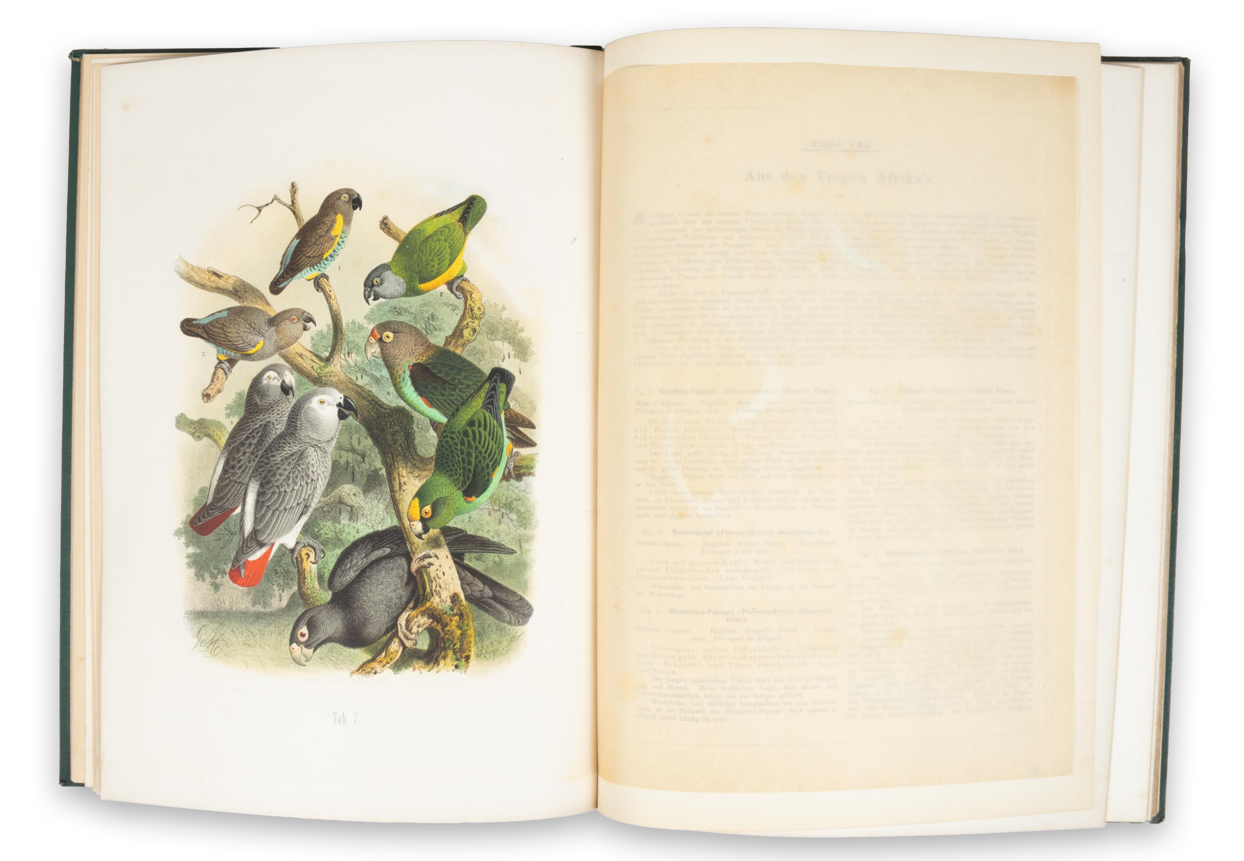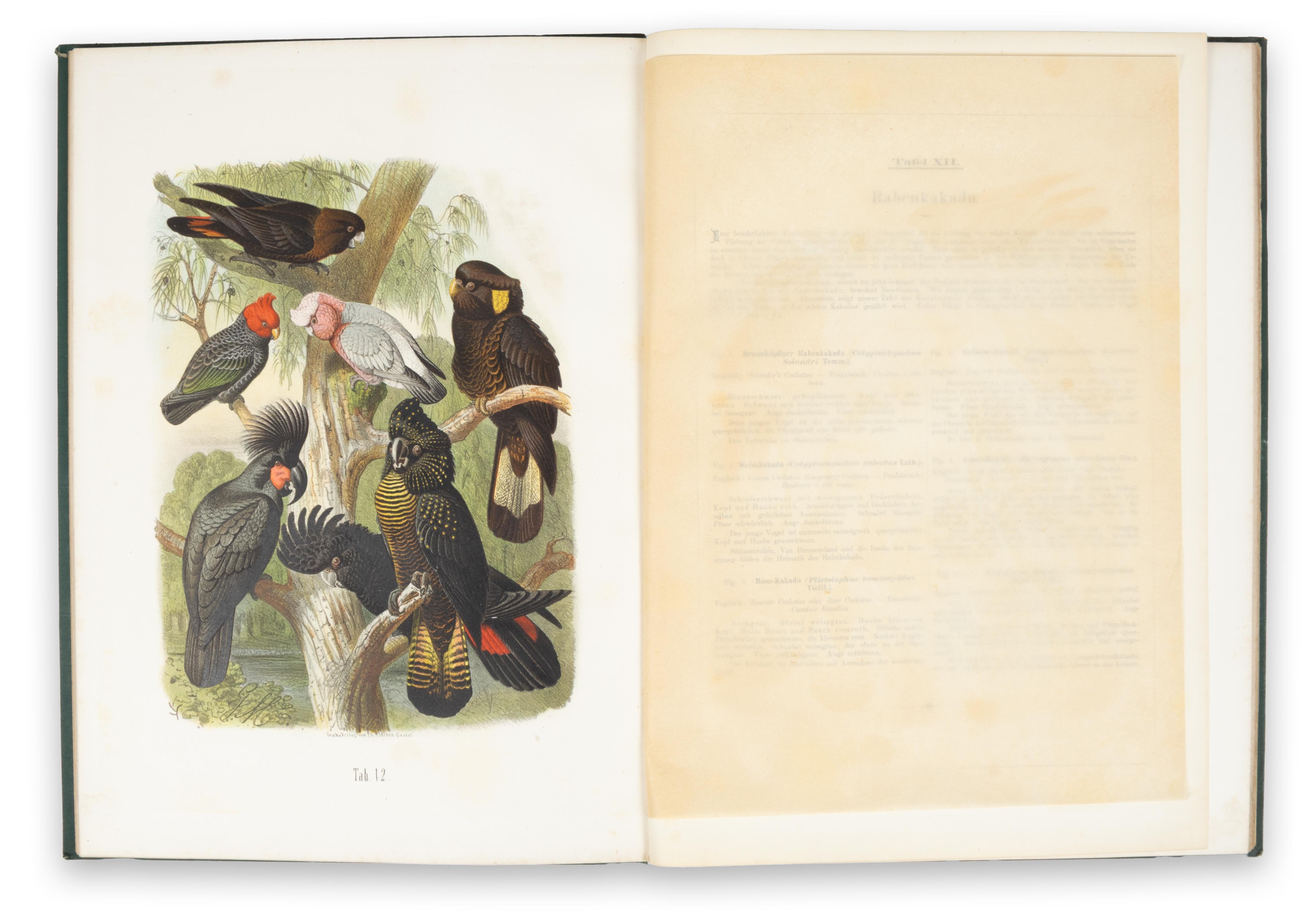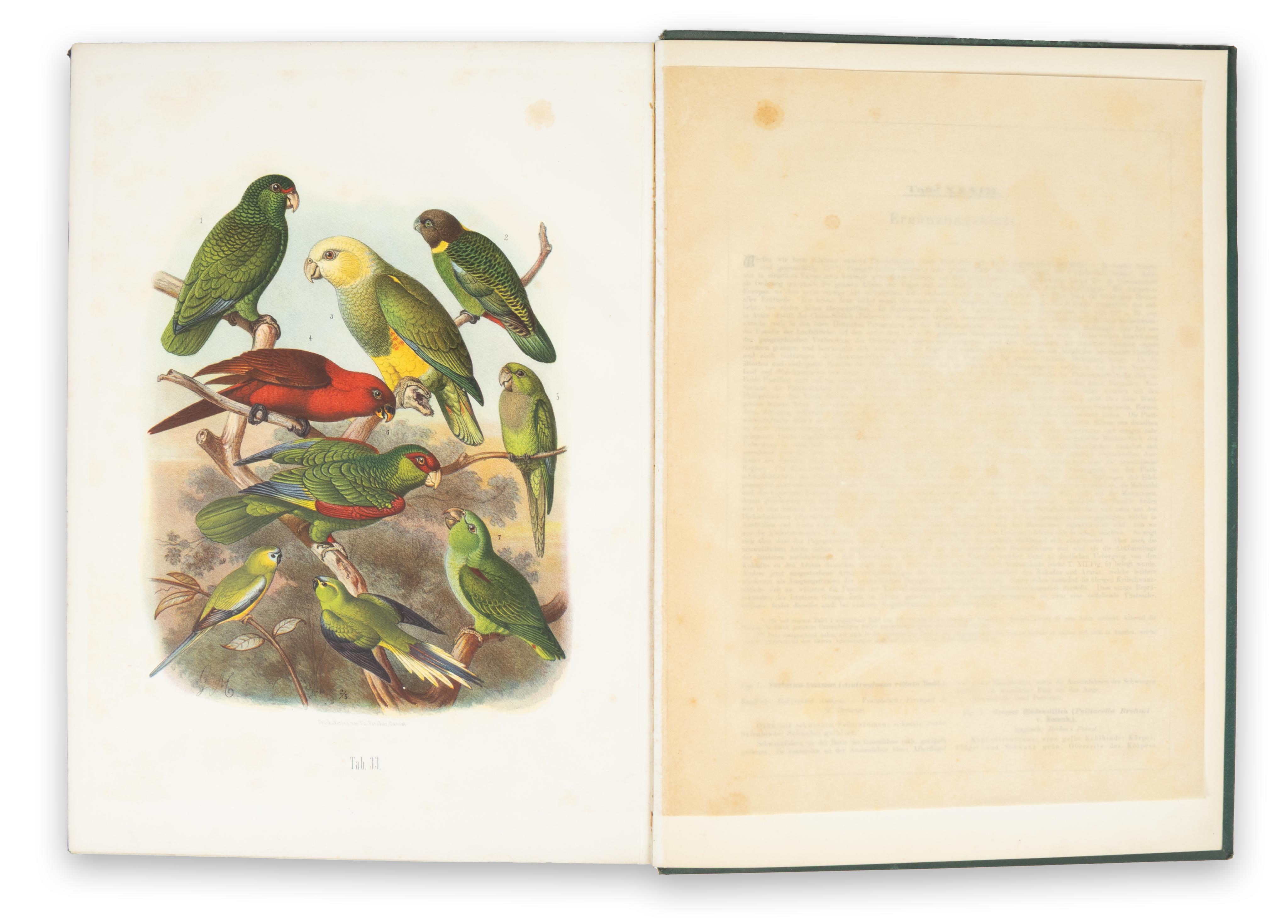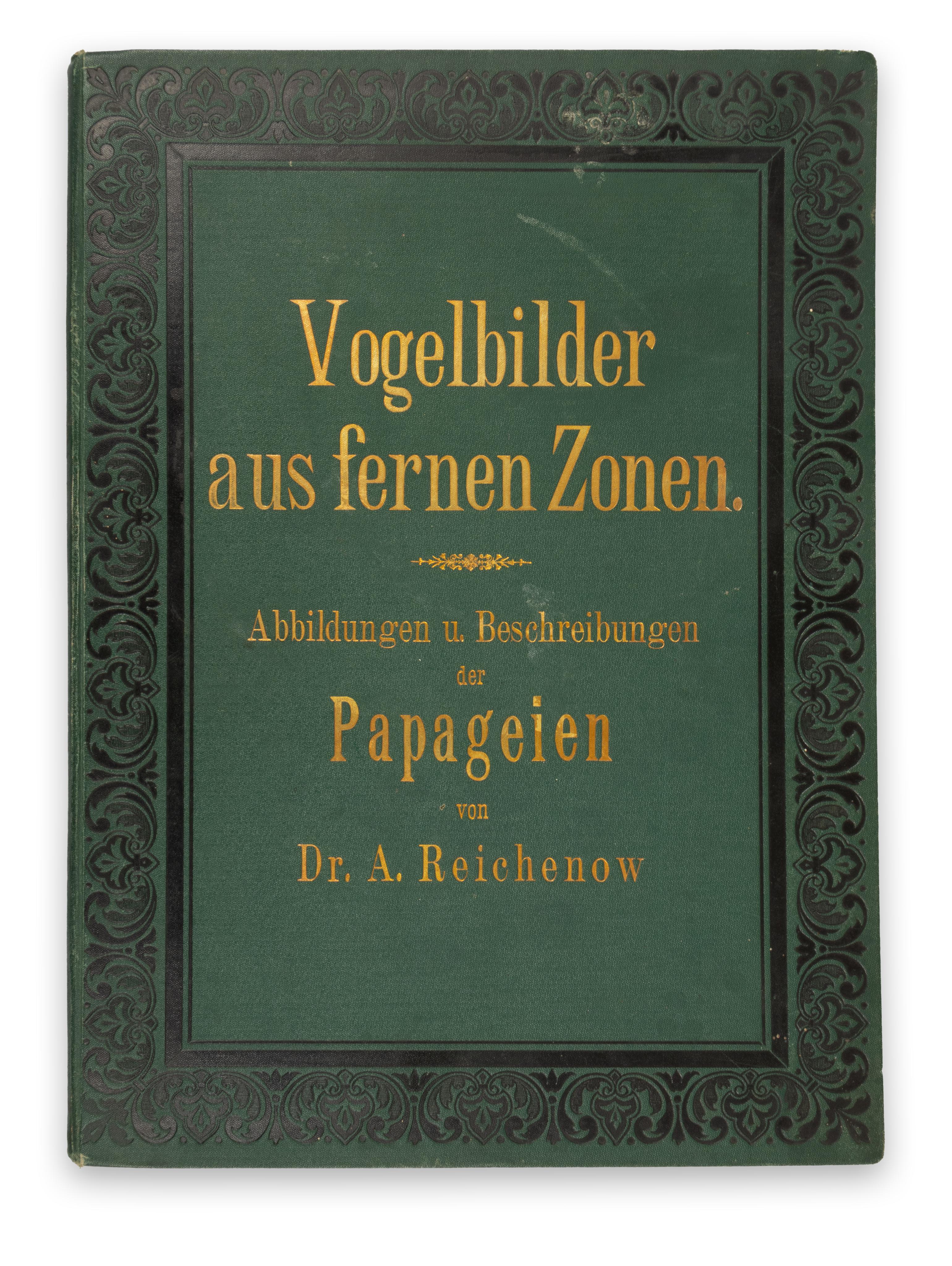 The Vogelbilder... is not just an extraordinary survey of the parrots of the world, but a most comprehensive system of classification, cataloguing the parrots by region of origin and species, together with 33 fine-detailed and accurate chromolitography plates, finished by hand after Gustav Mützel. The work was edited by Anton Reichenow (1847–1941), one of the most prominent ornithologists and herpetologists of his time, after whom several birds were named.
