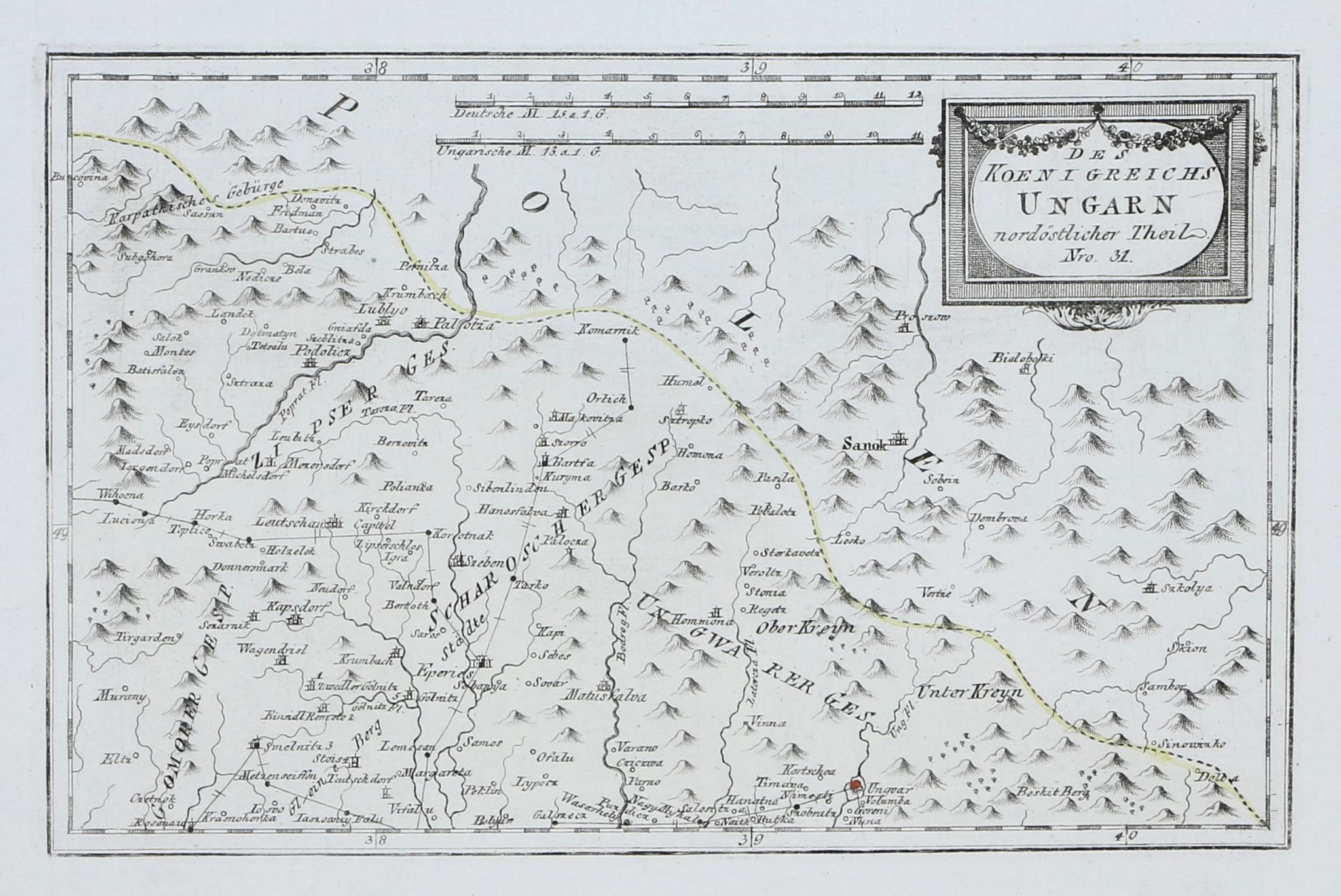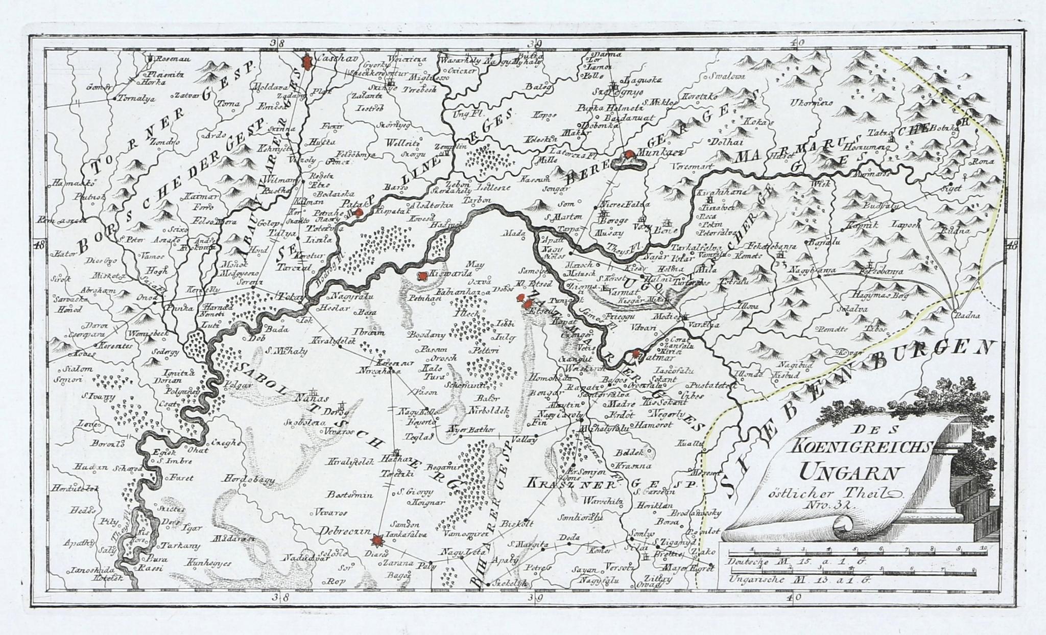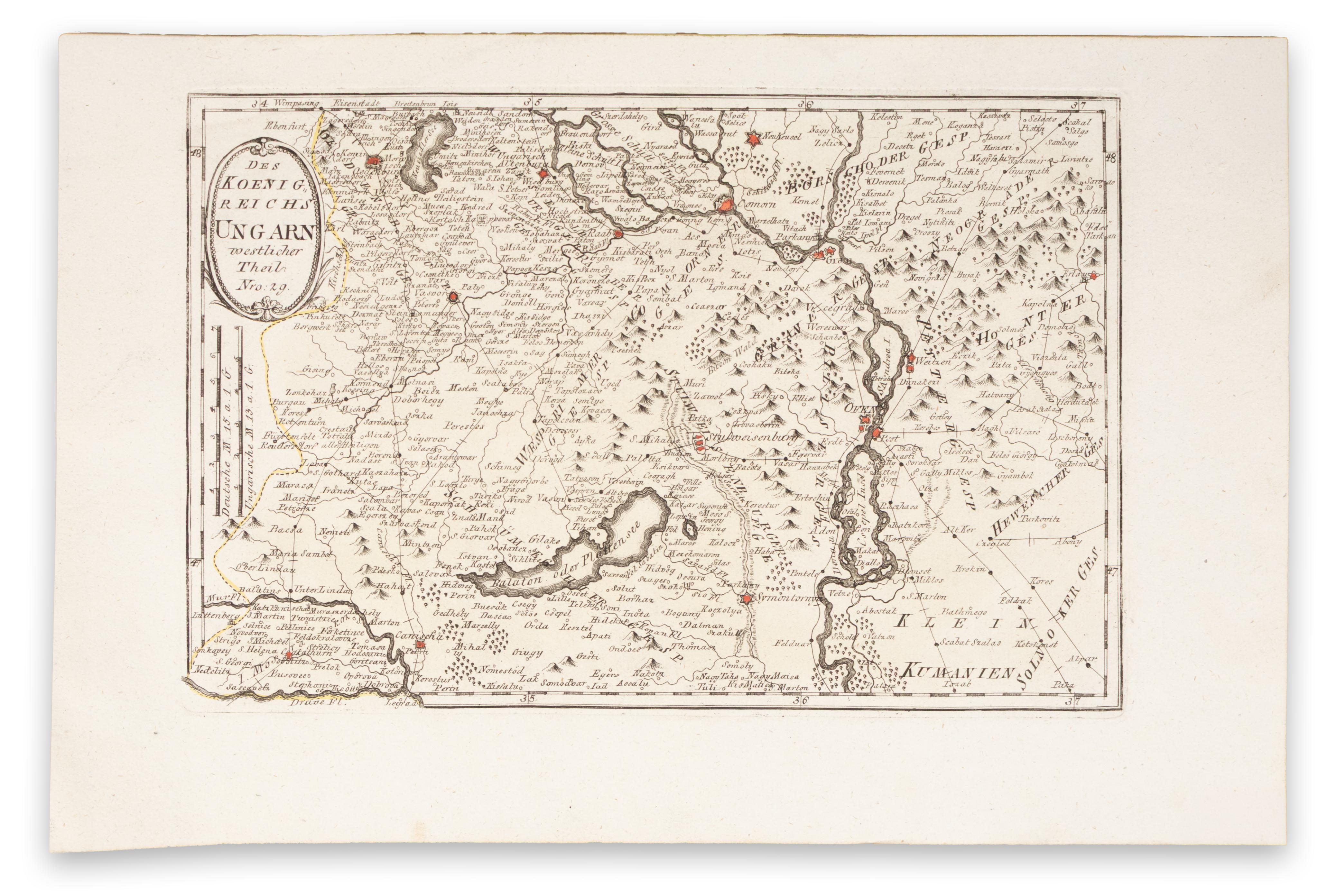 Copperplate maps of the parts of the Kingdom of Hungary divided into territories. Engraved by Franz Johann Joseph von Reilly. In Schauplatz der fünf Theile der Welt. Five copperplates of the seven. Size: 20,5×28,5 cm.