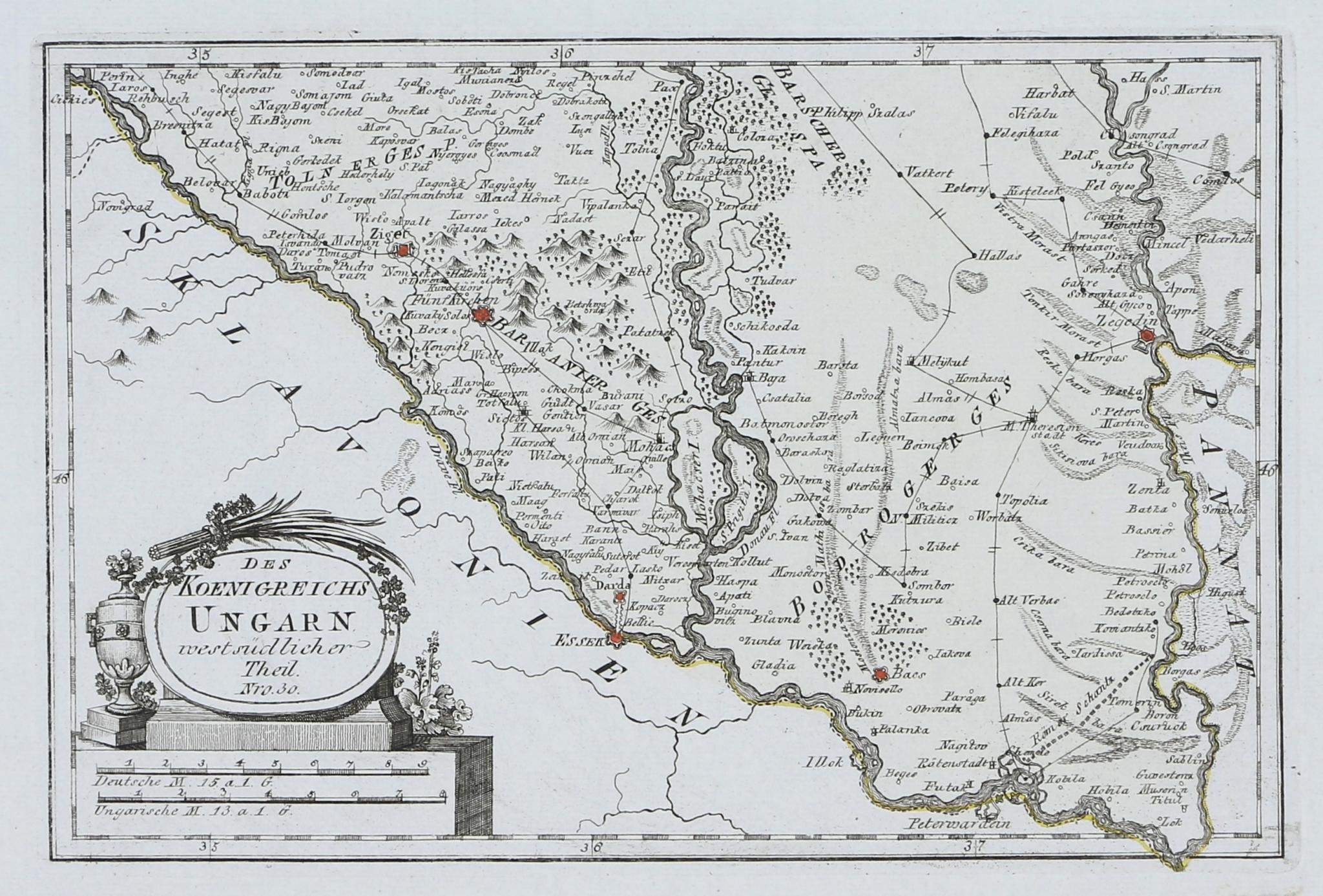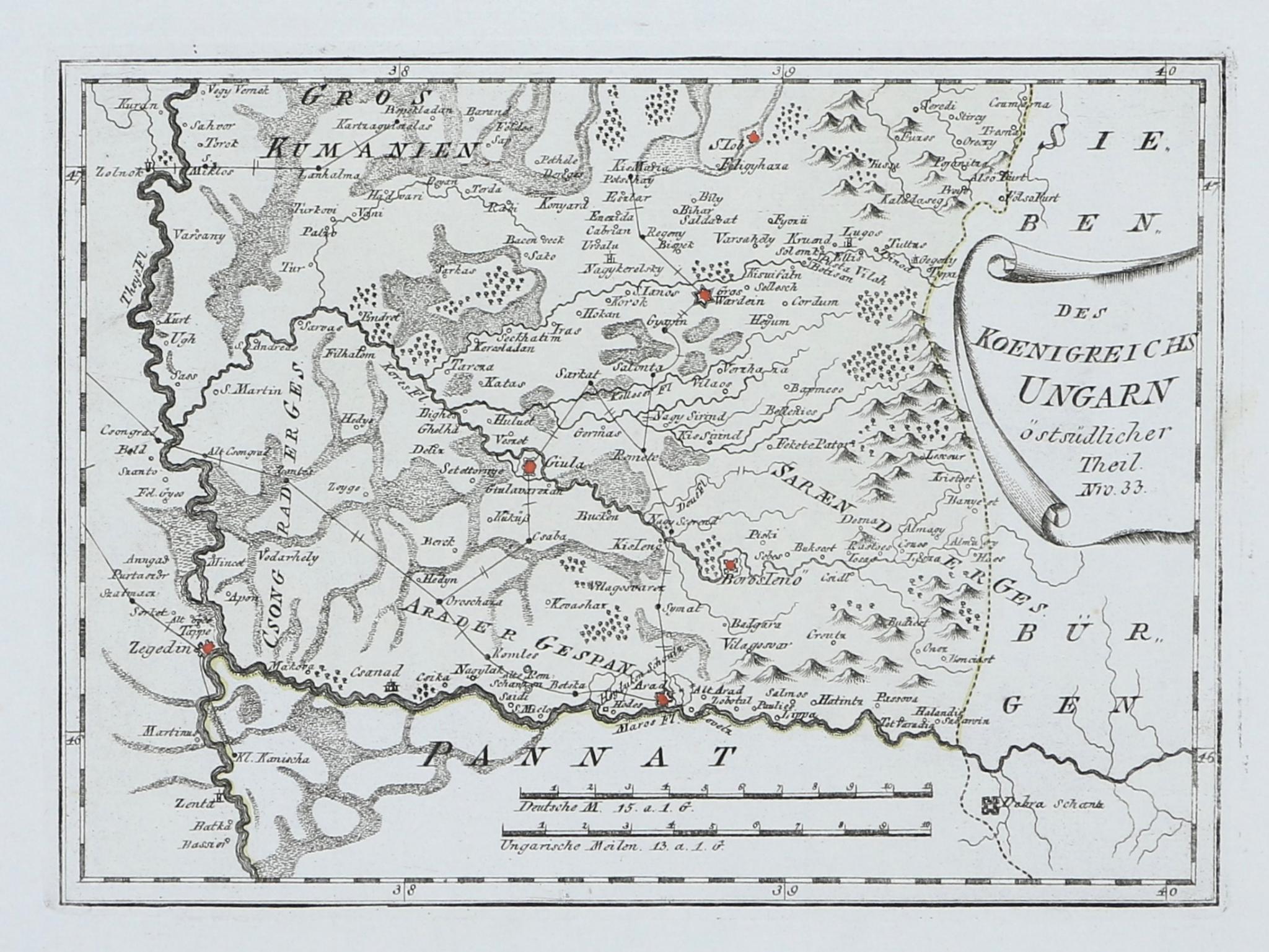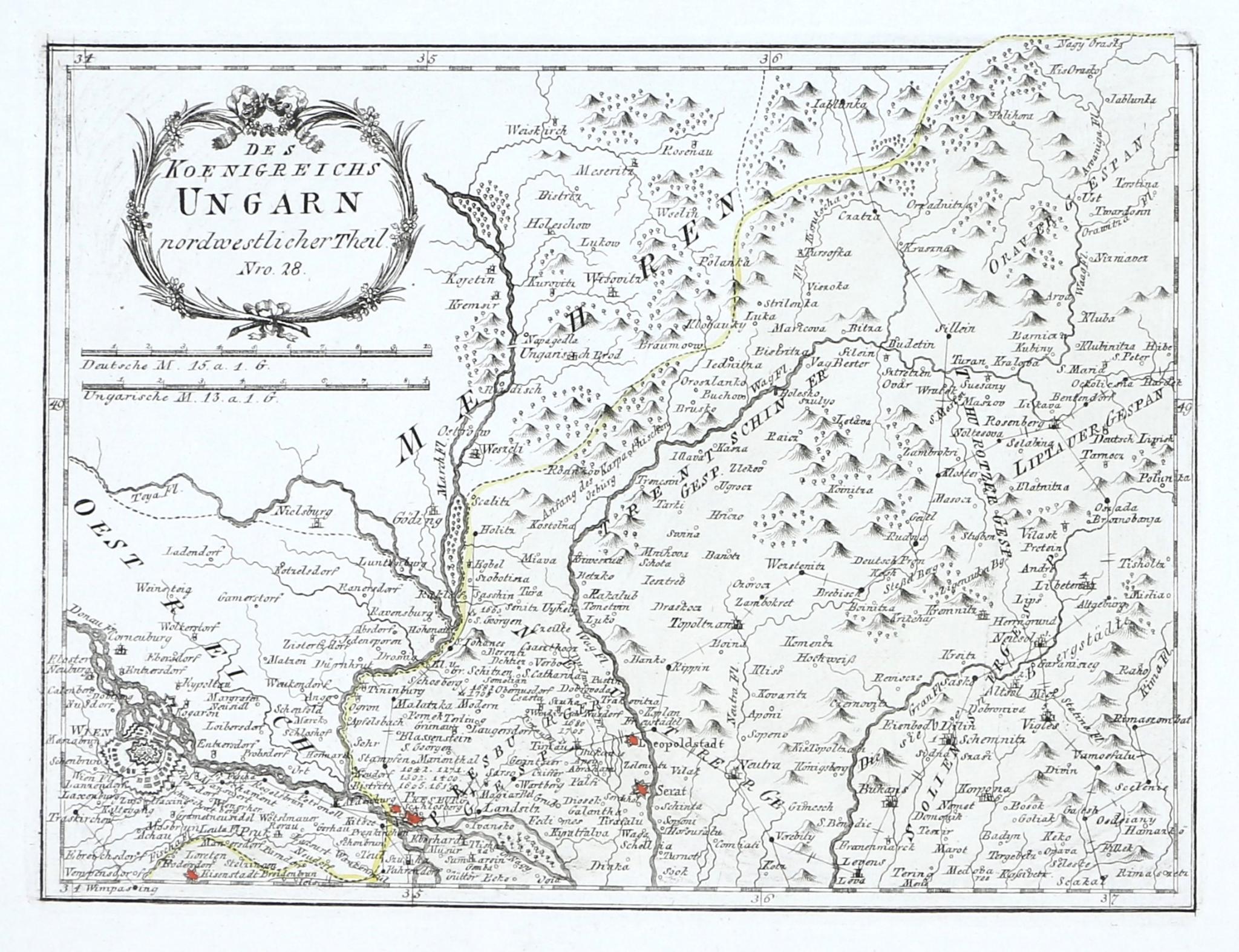 Copperplate maps of the parts of the Kingdom of Hungary divided into territories. Engraved by Franz Johann Joseph von Reilly. In Schauplatz der fünf Theile der Welt. Five copperplates of the seven. Size: 20,5×28,5 cm.