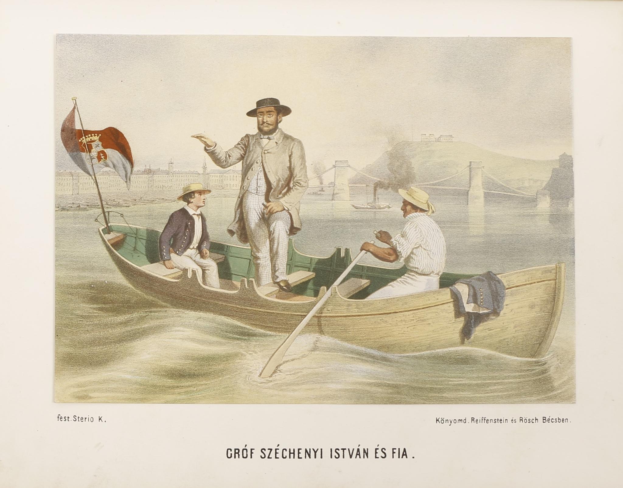 A díszalbumot ékesítő acélmetszeteken külföldi látképek és egy vaddisznó-vadászat jelenete látható, a színes kőnyomatok egyikén gróf Széchenyi István híres ábrázolását találjuk, amelyen egy csónakban áll, mellette egyik fia, a háttérben a Lánchíd, előtte gőzhajó. Szüry: 3815.