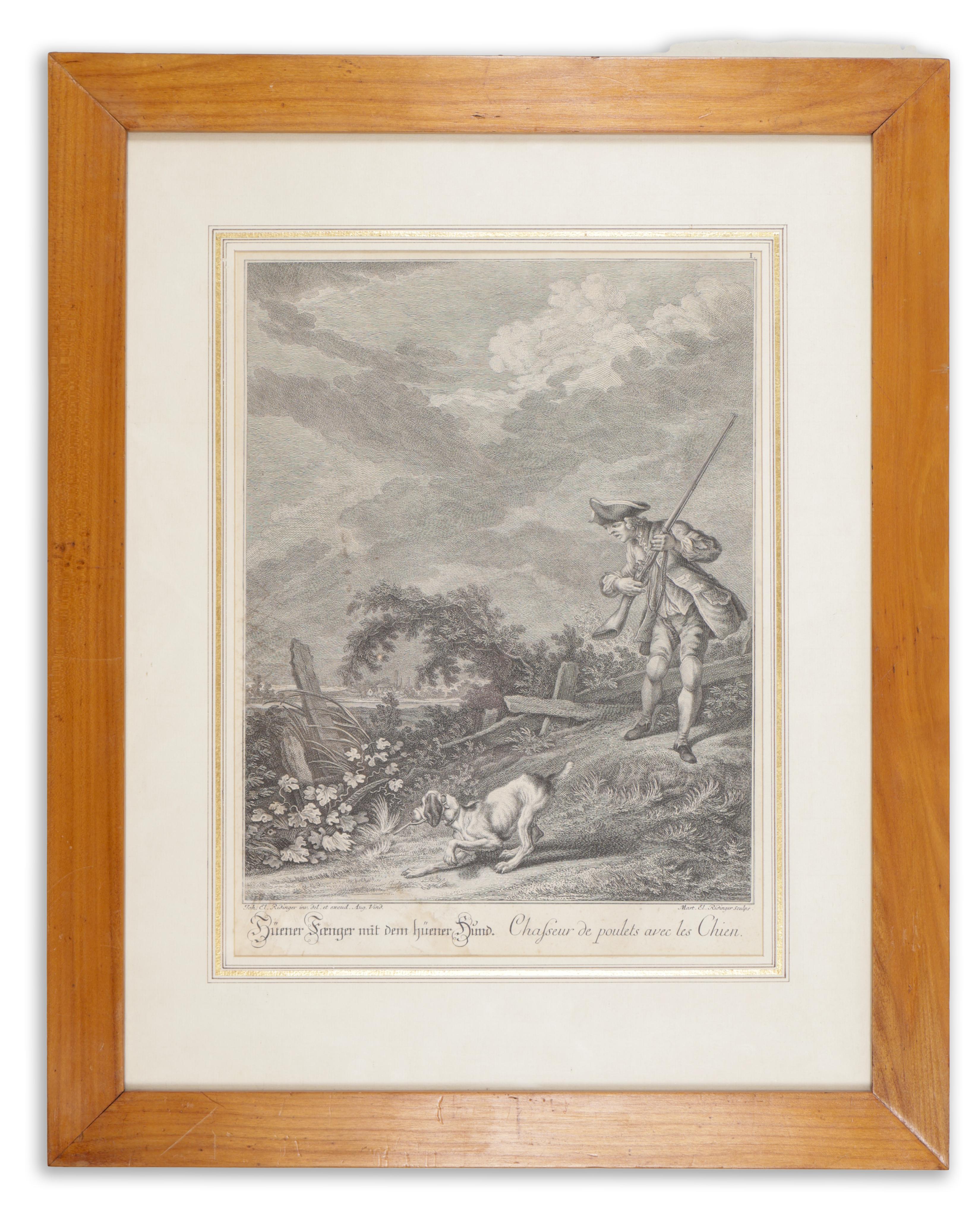 A Jaeger und Falkoniers mit ihren Verrichtungen". I-jelölésű lapja. Martin Elias Ridinger rézmetszete Johann Elias Ridinger nyomán, 1760 körül. Chasseur de poulets avec les chien.