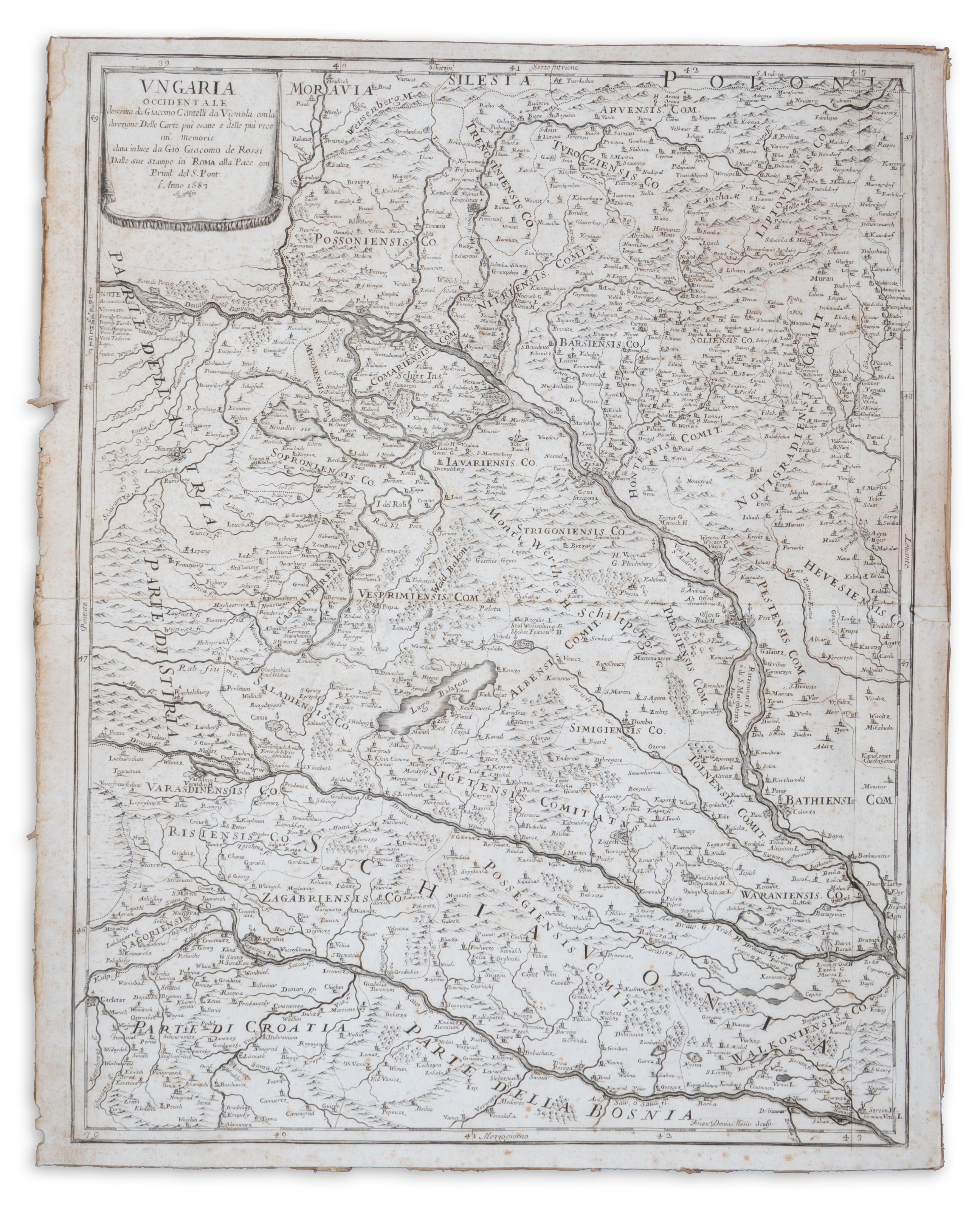 Map of the western part of Hungary in 1683. Woodcut. Slightly rusty, reinforced with paper tape at the edges at the back.