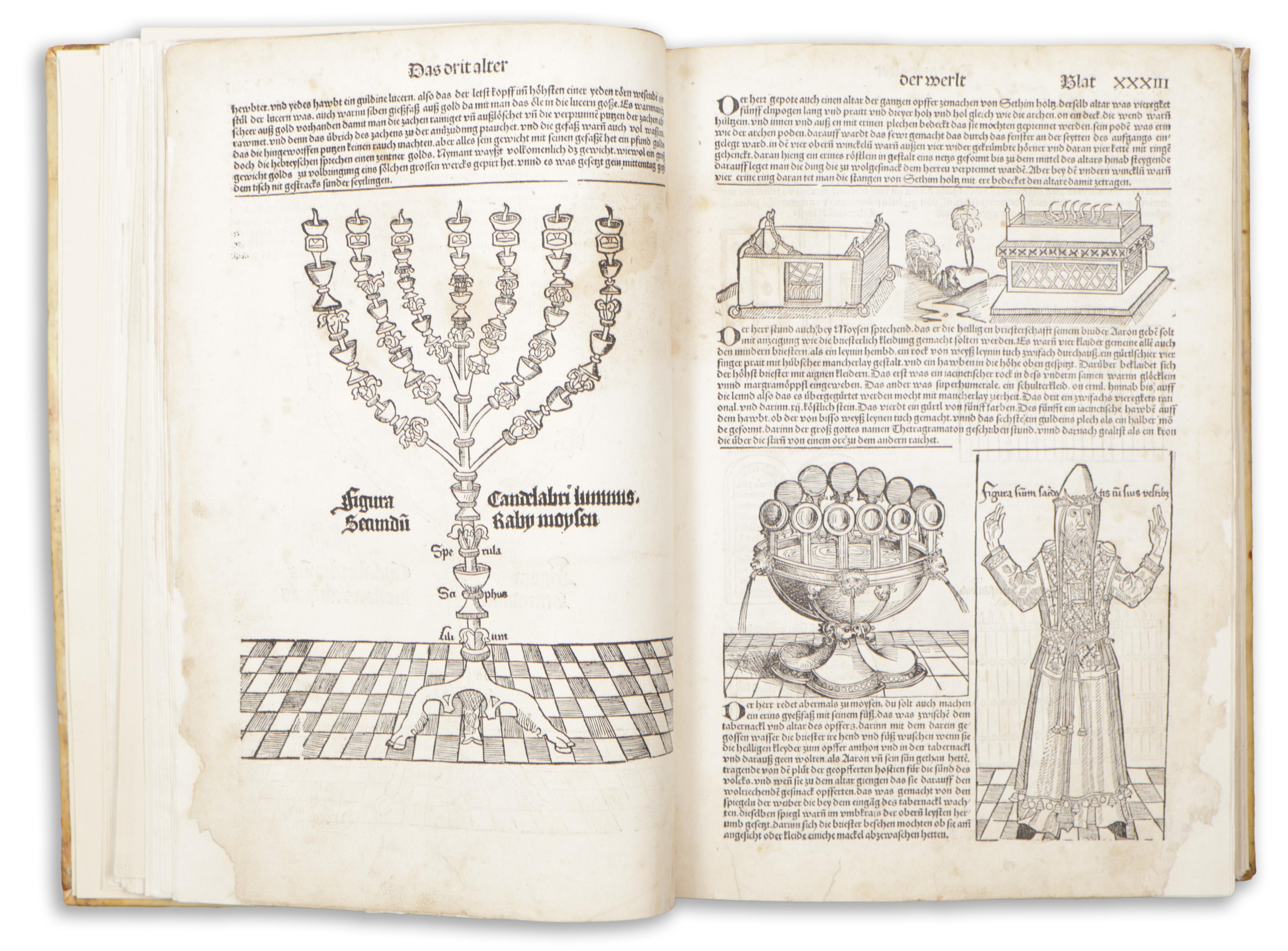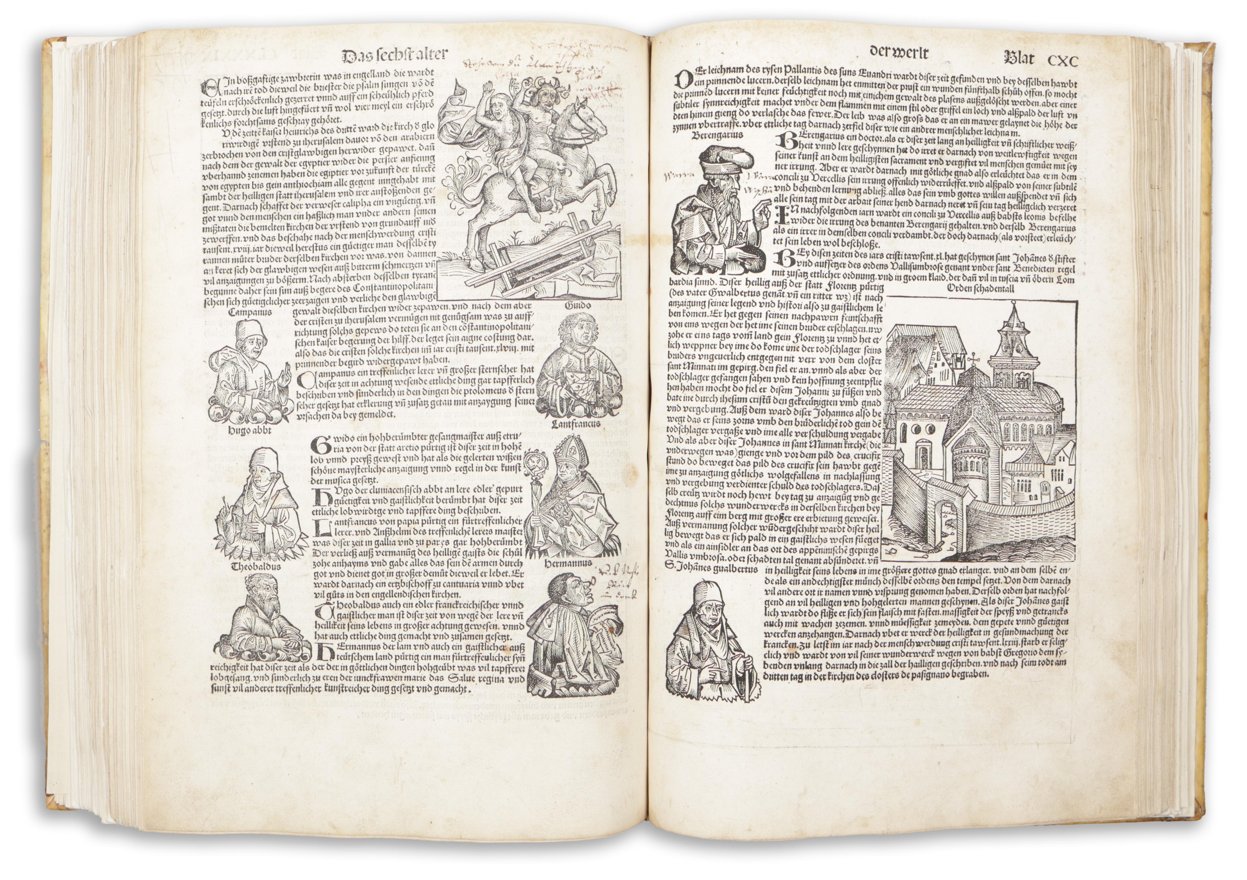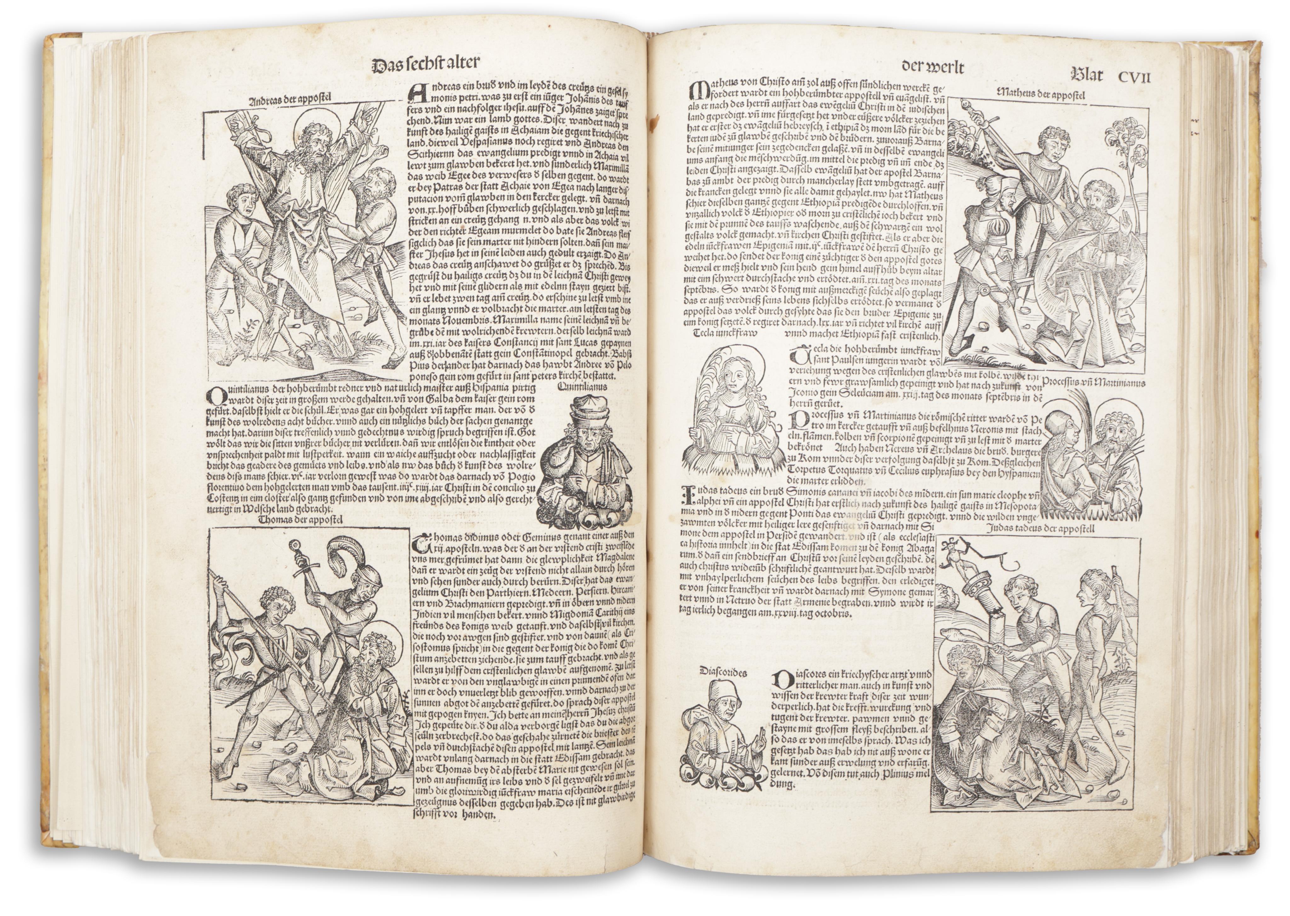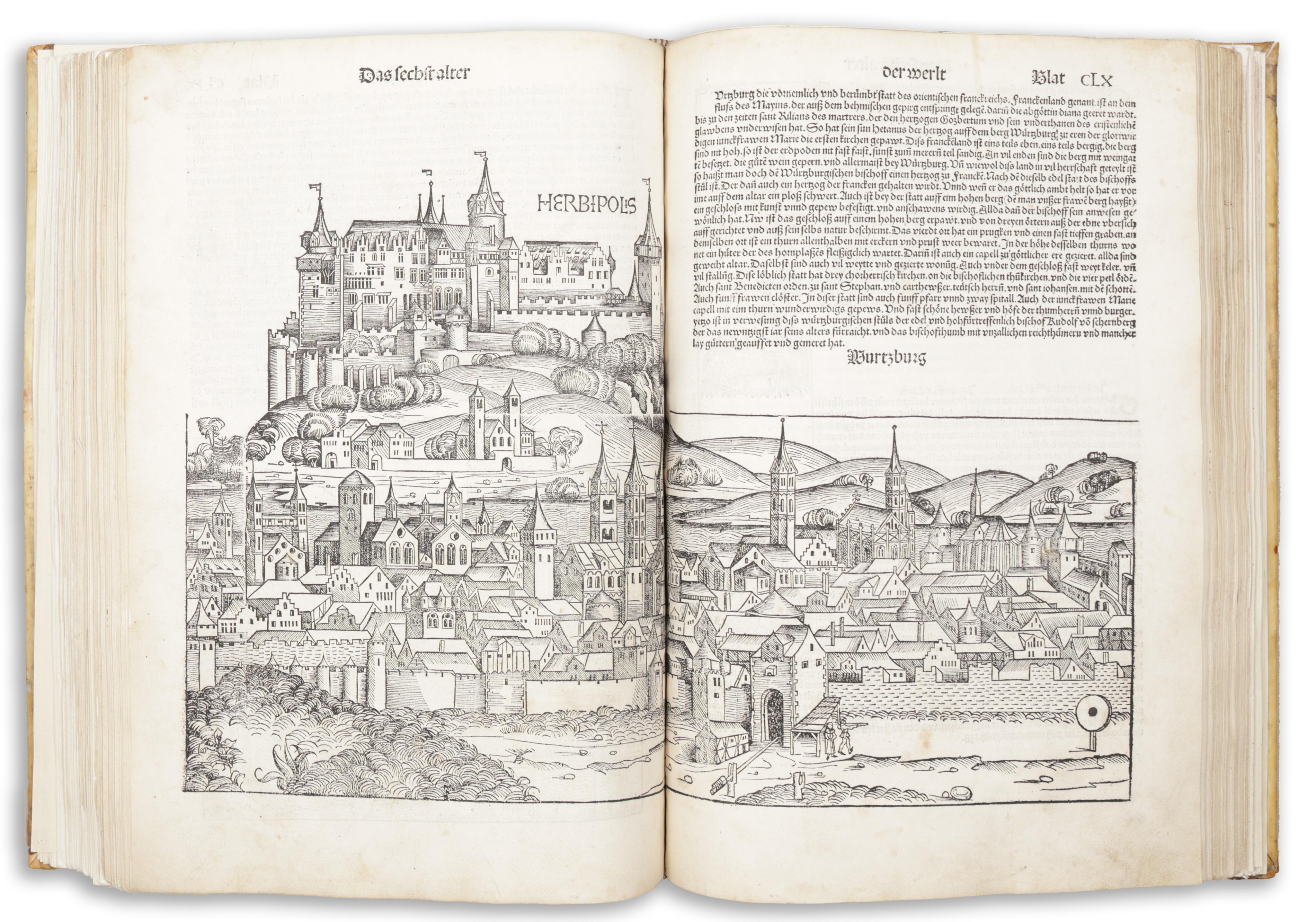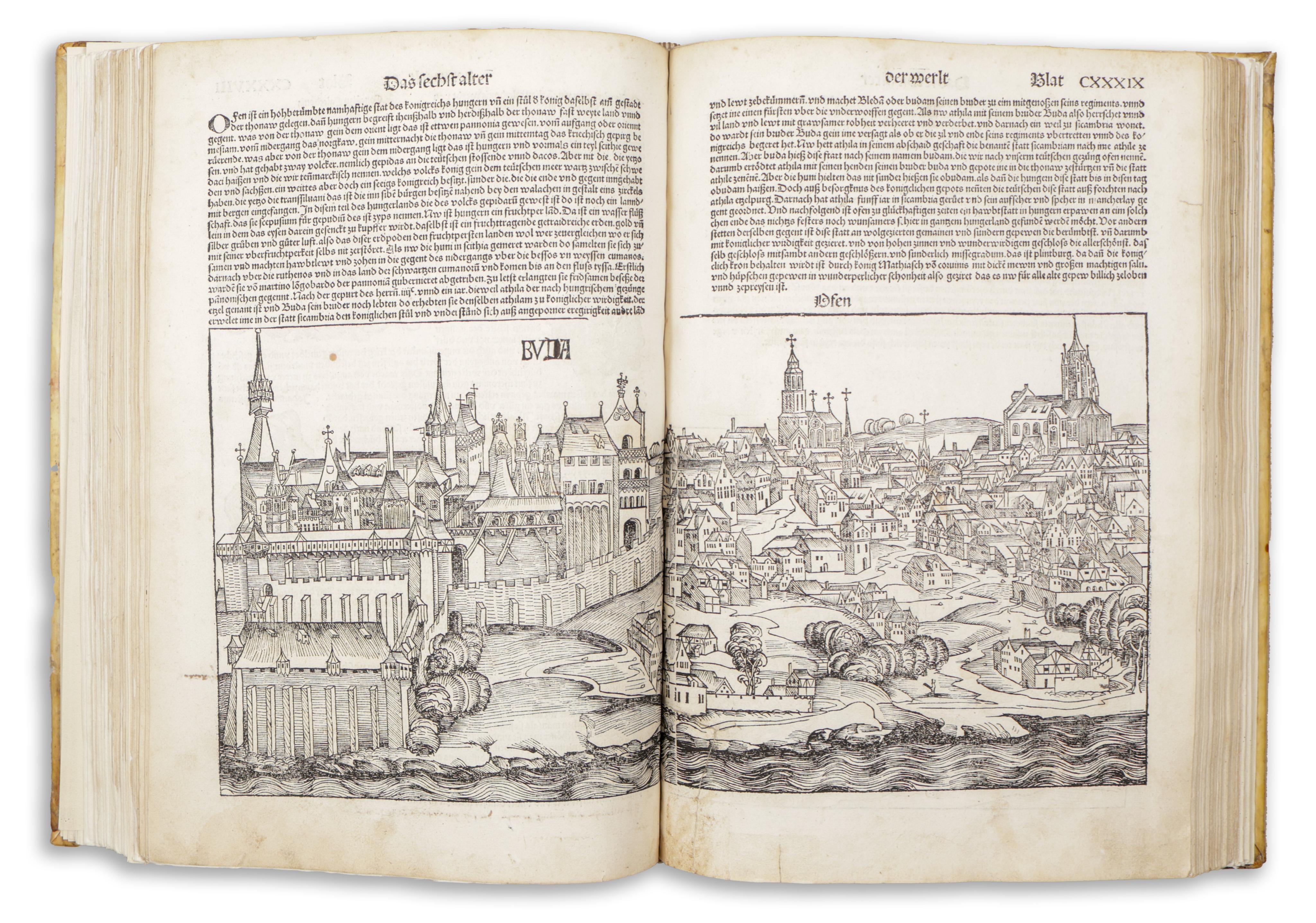 Erste deutsche Ausgabe von Hartmut Schedels berühmter Weltchronik, der reichsten illustrierten Inkunabel überhaupt. Mit allen Städteansichten, das Register rubriziert mit 23 teils mehrfarb. illuminierten Initialen. Gemeinsam mit Aldus' Hypnerotomachia Poliphili das größte Buchunternehmen der Inkunabel-Zeit.