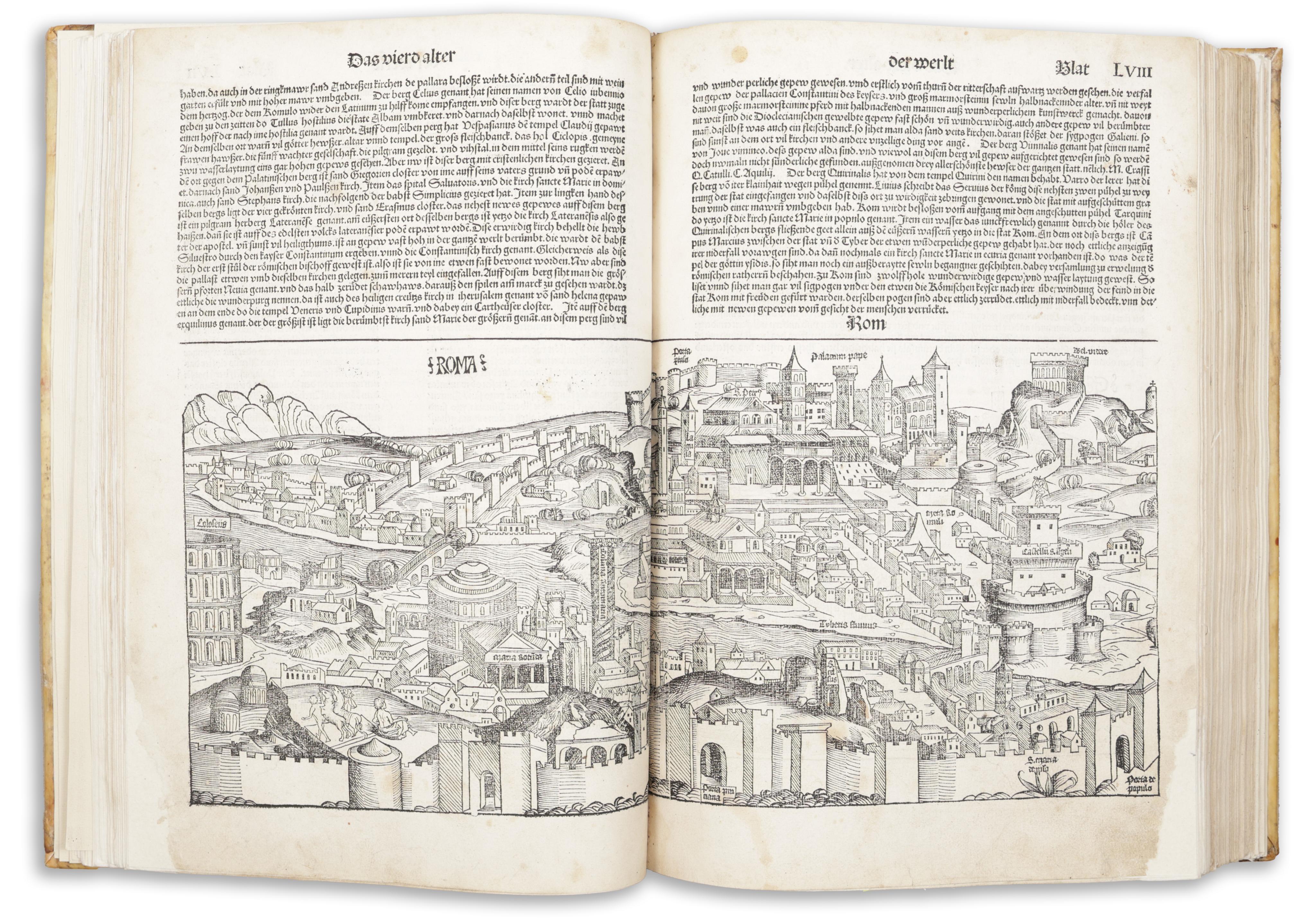 Hervorzuheben sind die Ansichten von Rom, Florenz, Venedig, Köln, Mainz, Augsburg, Regensburg, Wien, Nürnberg, Konstantinopel, Buda, Straßburg, Salzburg, Erfurt, Würzburg, Bamberg, Prag, Breslau, Konstanz, Basel, Lübeck u. Krakau. - Es fehlen die Bl. CCLXVII, CCLXVIII u. CCLXIX. Die letzten beiden Bl. K1 u. K2 mit Kolophon und Europa-Karte gemeinsam mit Bl. 1a (Einleitung zum Register) vorgebunden. - 20 Bl. als faksimilierte Reproduktionen eingebunden (1a, K1, K2, VI, VII, XI-XIII, XVI, CI-CII, CIIII-CV, CCLIX, CCLXI, CCLXXI, CCLXXIX, CCLXXXIII-CCLXXXIIII, CCLXXXVI). Einige Marginalien von alter Hand im Text. - Zahlreiche der rund ersten 100 Bl. mit Fehlstellen, teils mit zumeist kleinem Textverlust im Bereich Fußsteg u. Seitensteg, dieselben meist mit Japanpapier hinterlegt, einige wenige Blätter braun-, schmutz-, stock- und fingerfleckig.
