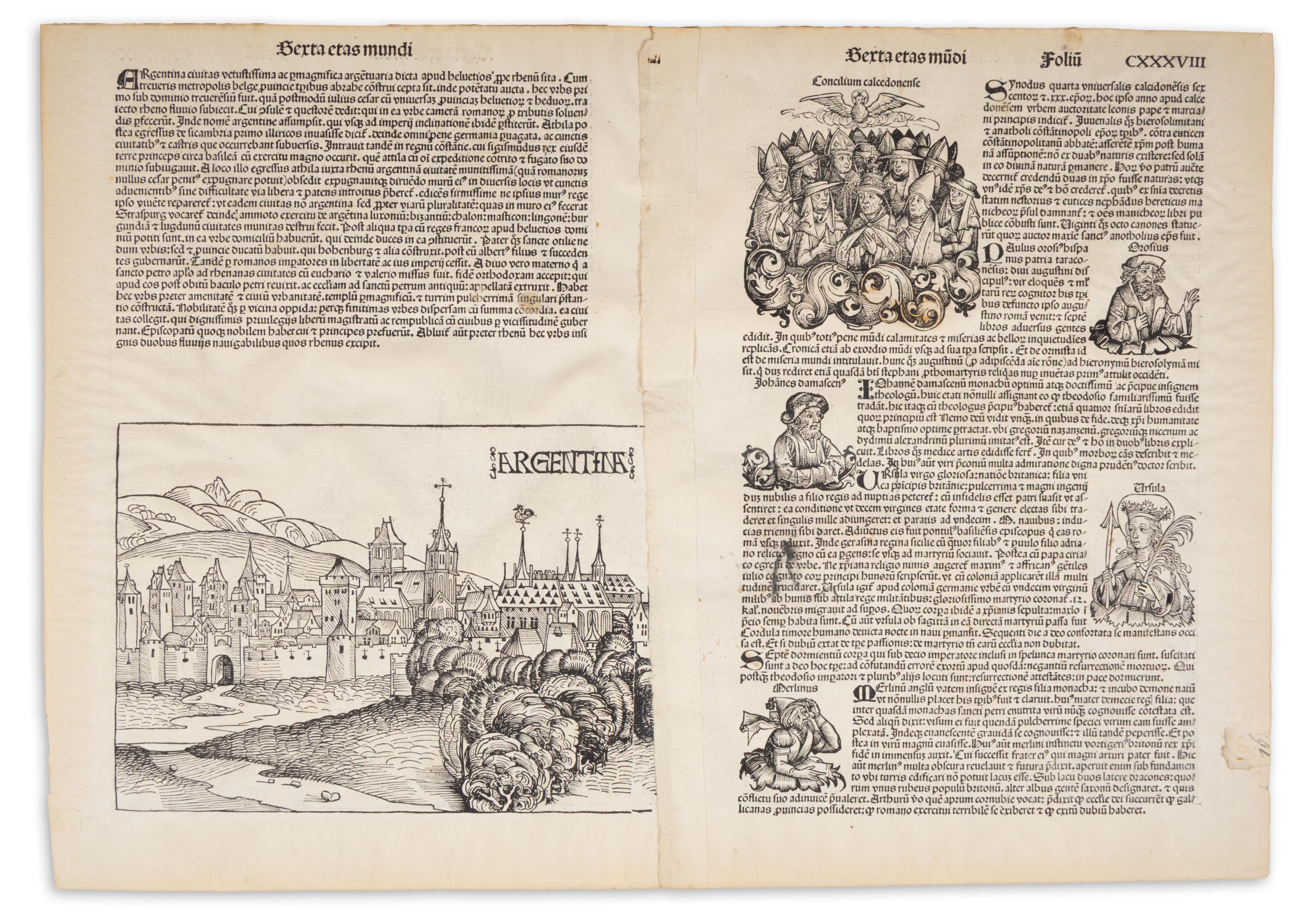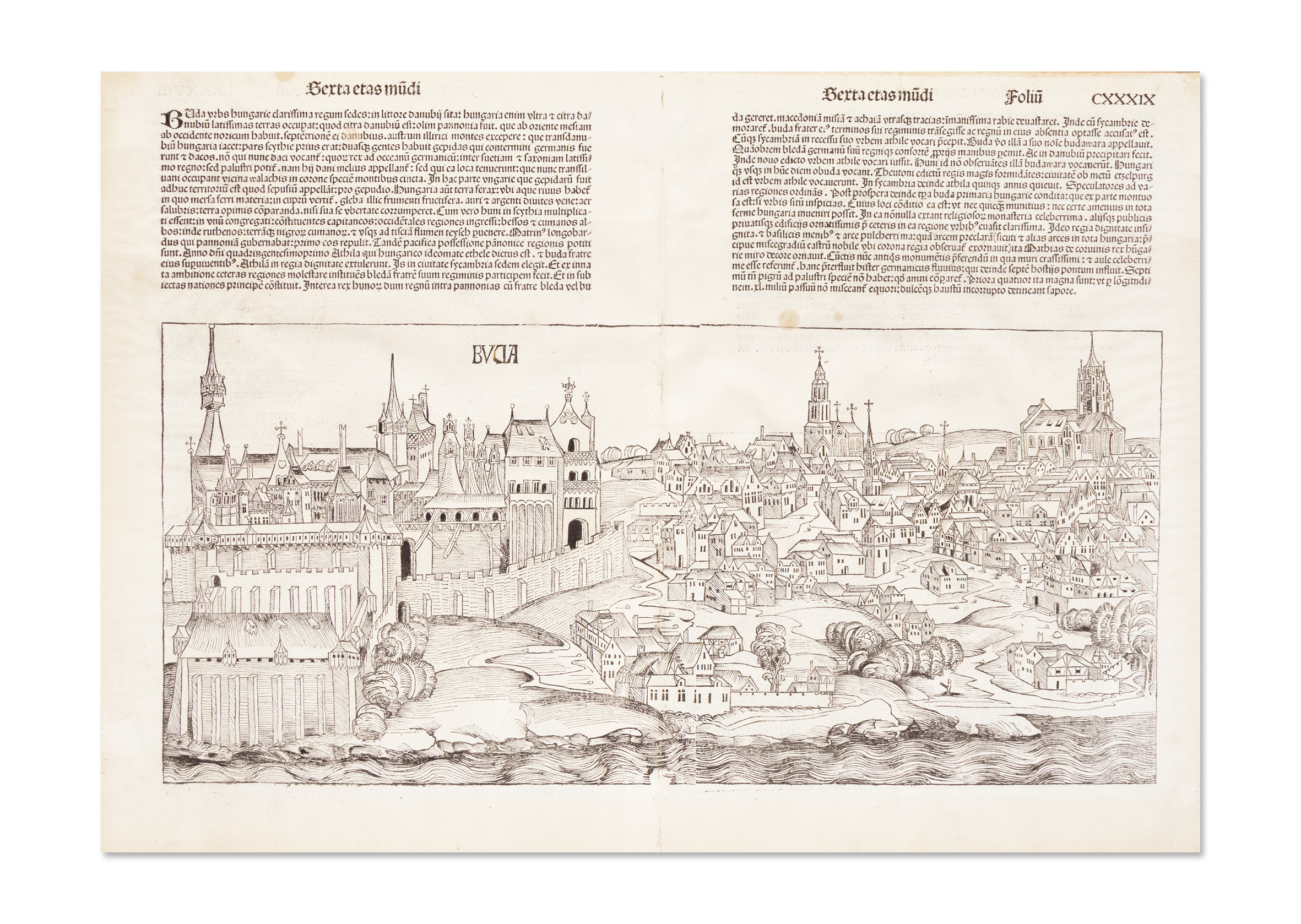 Nürnberg, 1493.Buda fametszetű látképe Hartmann Schedel: Liber Chronicarum (Nürnberg, 1493) című munkájának latin nyelvű első kiadásából. Két dúcról nyomott, színezett fametszet, Buda első ismert ábrázolása.