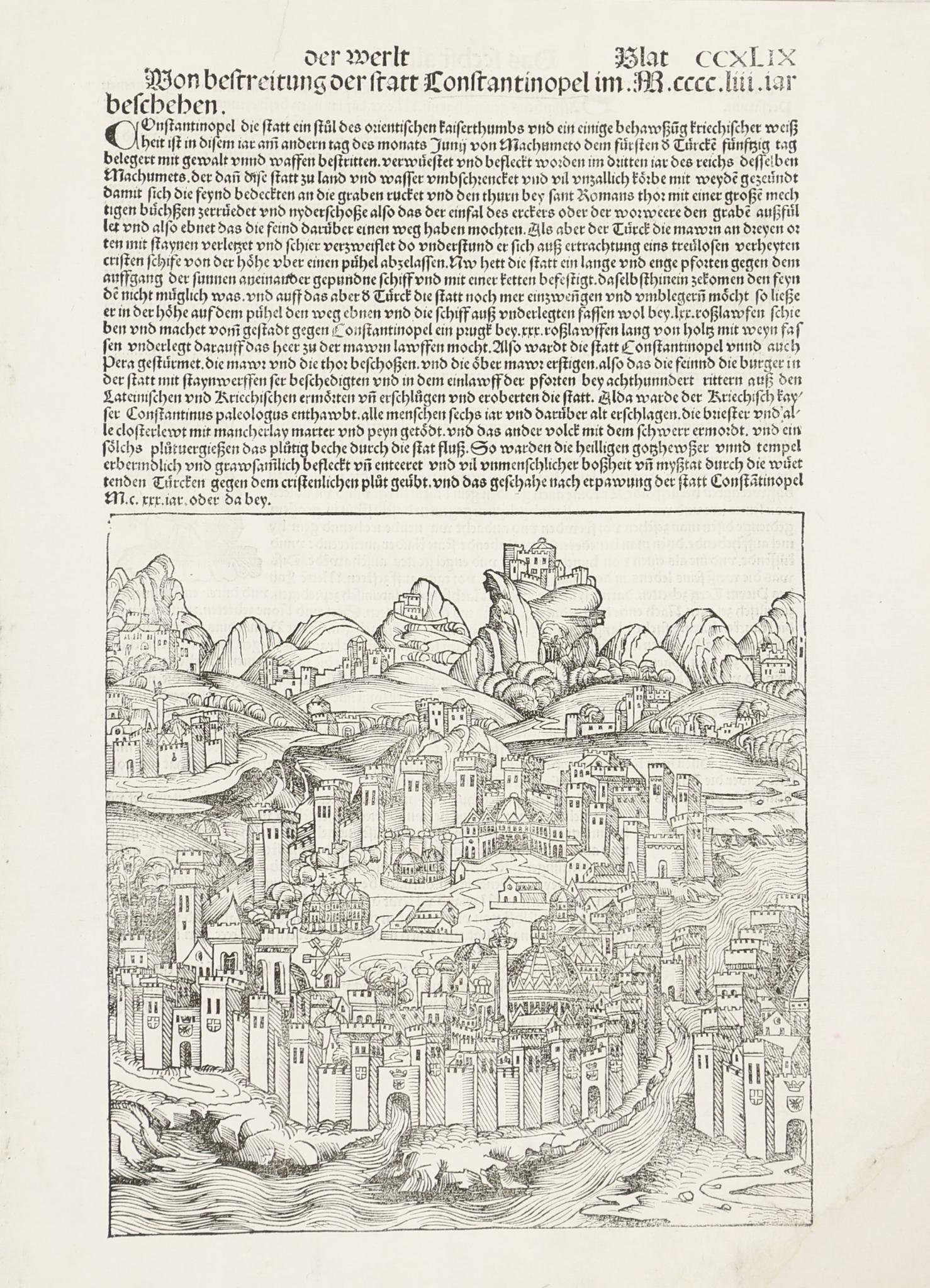 Hartmann Schedel, Konstantinápoly (Isztambul) dekoratív fametszete az egyik legrégebbi hiteles ábrázolás Isztambulról. Folio CCXLIX. A híres Liber chronicarum vagy Nürnbergi Krónika, (Des buchs der Croniken...) német nyelvű kiadásából, amely 1493-ban jelent meg, abban az évben, amikor Kolumbusz Amerika felfedezése után visszatért Európába.