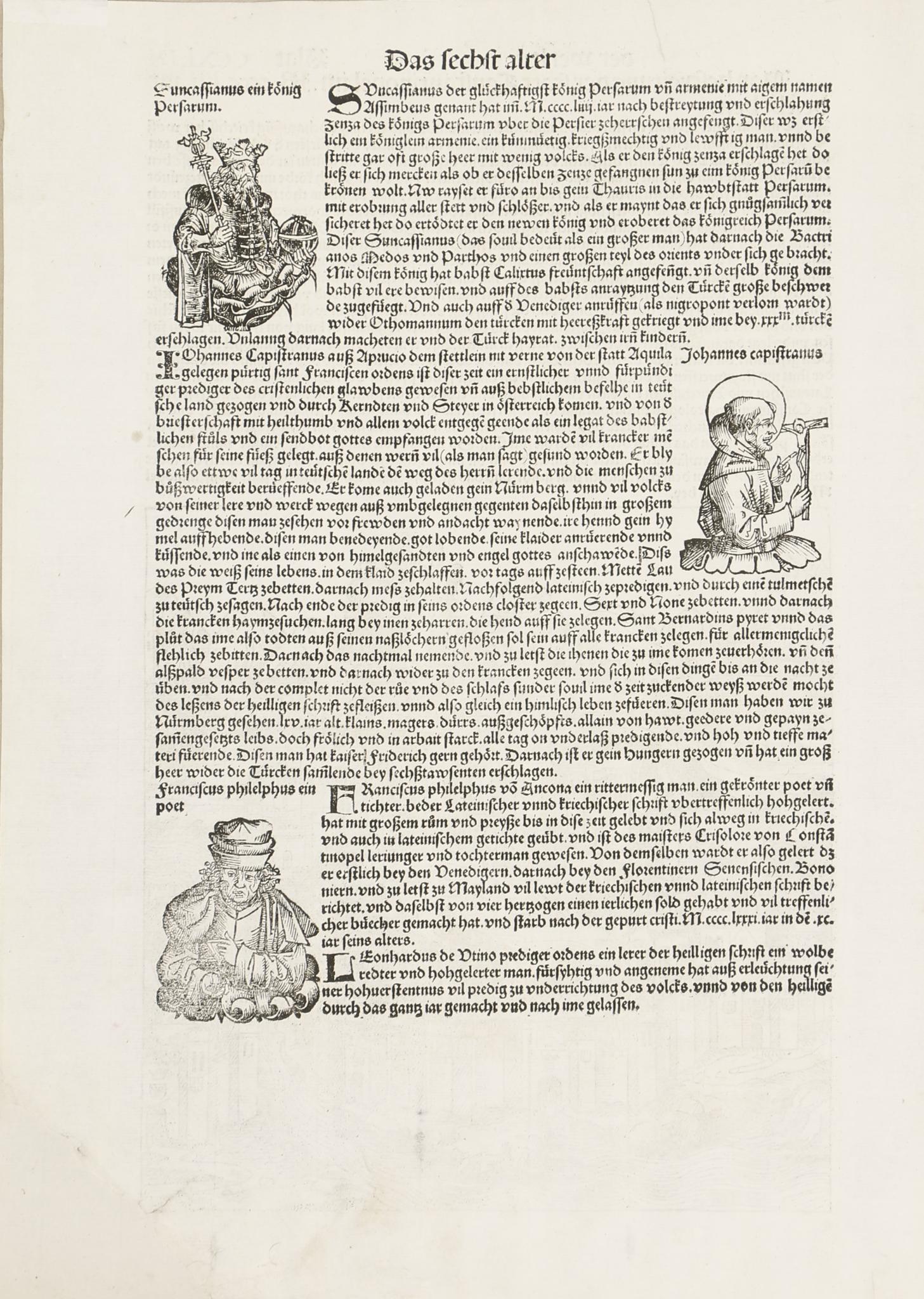 A fametszetek készítői Michael Wolgemut, Albrecht Dürer ismert tanára és mostohafia, Wilhelm Pleydenwurff voltak. Wohlgemut 1486-90 között Albrecht Dürer tanára volt. Mivel a fiatal Dürer Wohlgemut nyomdájában tevékenykedett abban az időben, amikor a Nürnbergi Krónika fametszete készült, ő is közreműködhetett, mivel néhány metszet feltűnően hasonlít az ő Apokalipszis-illusztrációira. Sarka restaurálva. Lapméret: 31×43,5 cm. Lemezm: 22,7×23,4 cm.