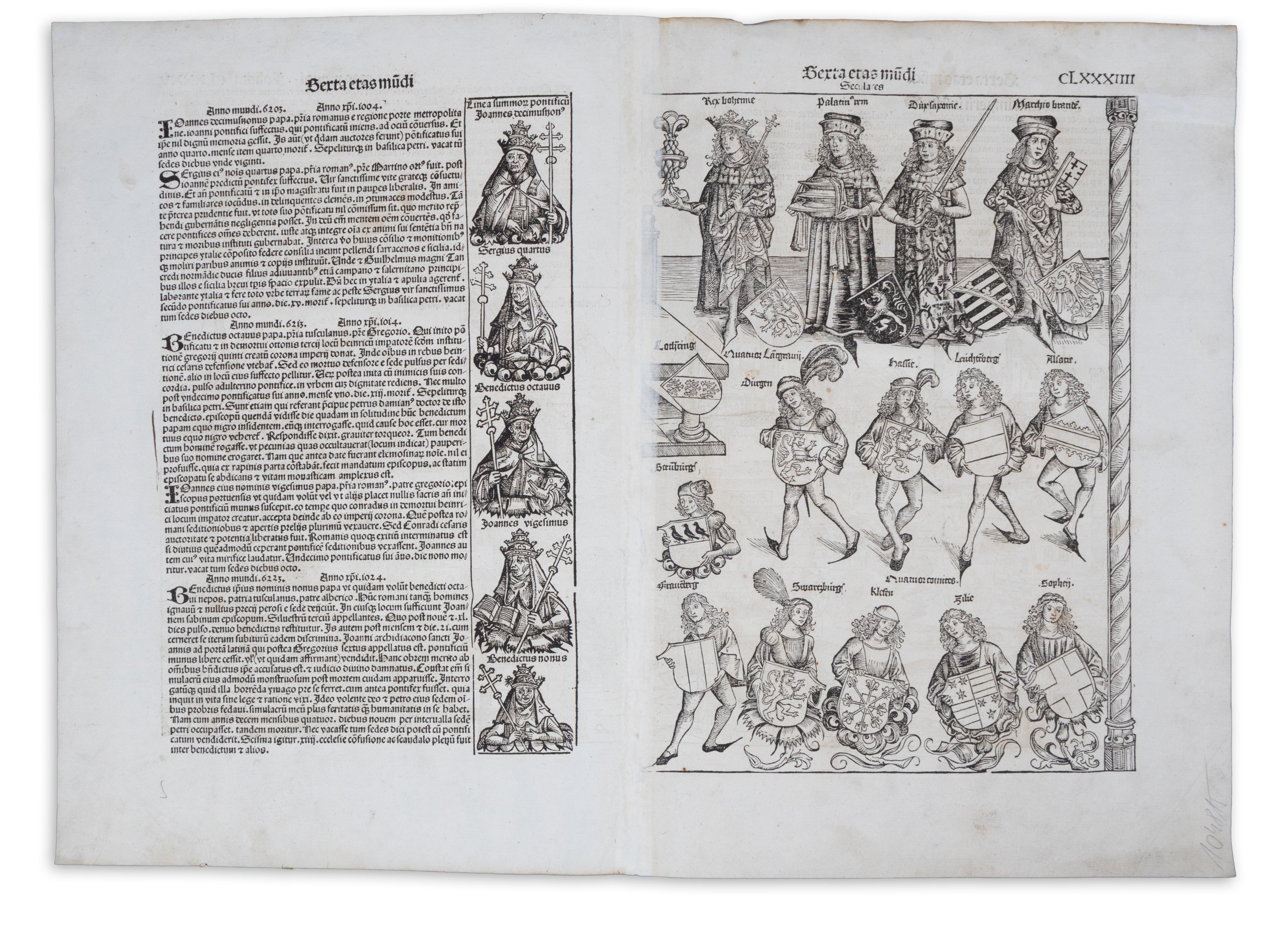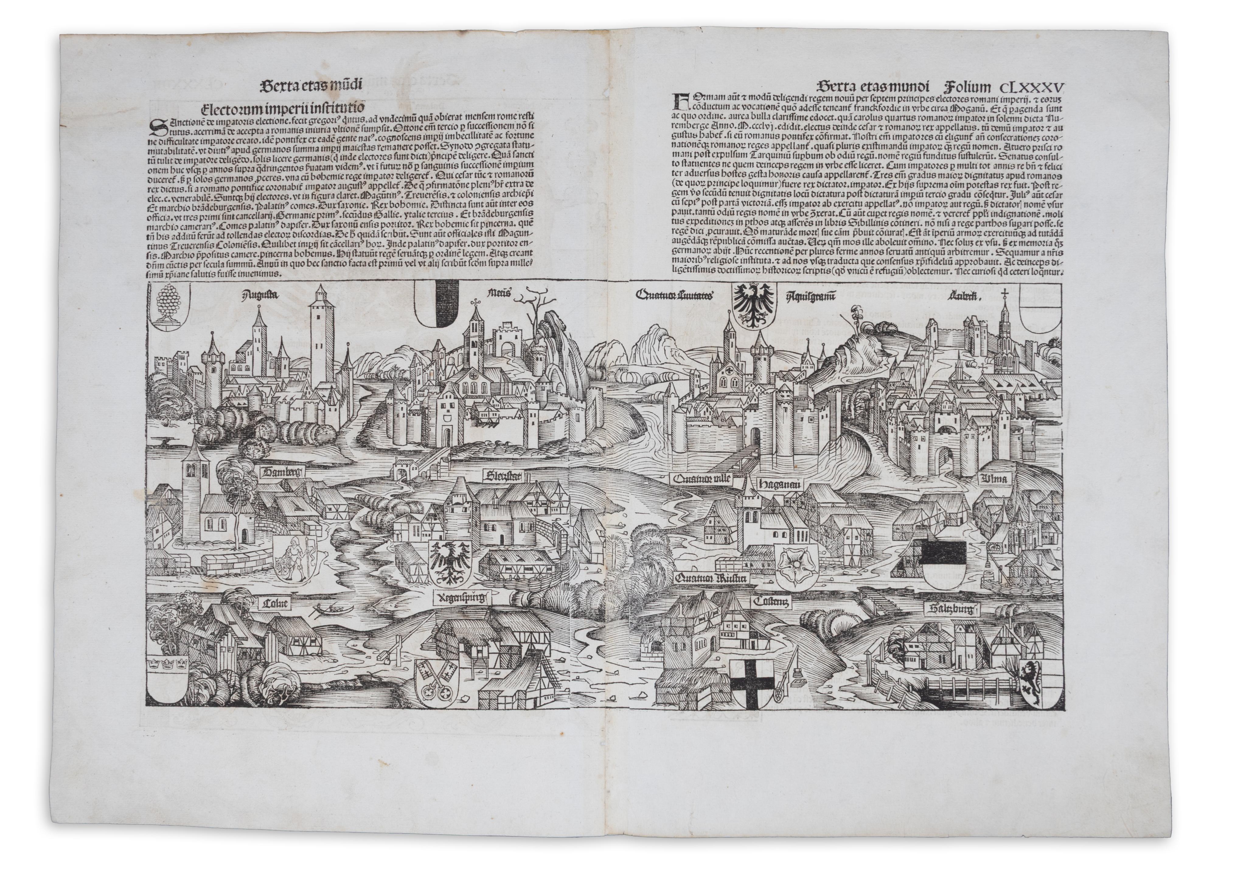 Díszes, fametszetű ősnyomtatvány-levél, amely birodalmi városok jellegzetes épületeit ábrázolja: Augsburg (Augusta), Metz (Metis), Aachen (Aquilgranu), Lubeck, Bamberg, Selestat (Sletzstat), Haguenau (Haganau), Ulm (Ulma), Cologne (Colne), Regensburg (Regenspurg), Konstanz (Costens) és Salzburg. A híres "Buch der Chroniken, a Nürnbergi Krónikából", latin nyelvű kiadás, 1493. Levélszám: CLXXXV. A verzón neves német történelmi családok heraldikai jelképeikkel és pápák portréi láthatók.