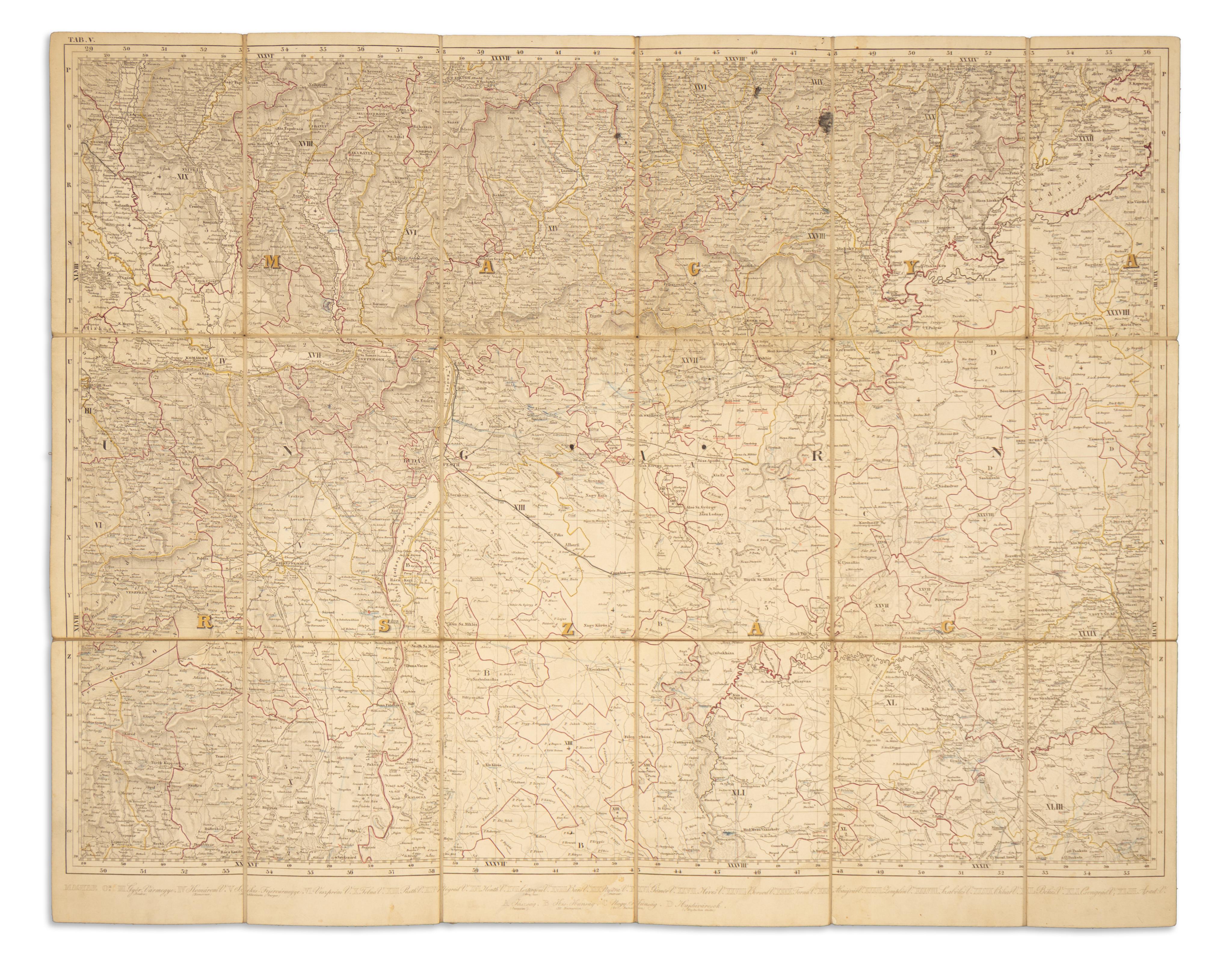 Pest, 1838- 1847. Ifjabbik Kilian könyvárosi biztosságában - Rauchenfels v. Steinberg. Teljes méret: 180x234 cm. Gyönyörű, határszínezett, rézmetszetű térképlapok. Csak öt szelvény a kilencből! Az első lap hiányában nem tudjuk datálni, hogy tételünk első vagy második kiadás.