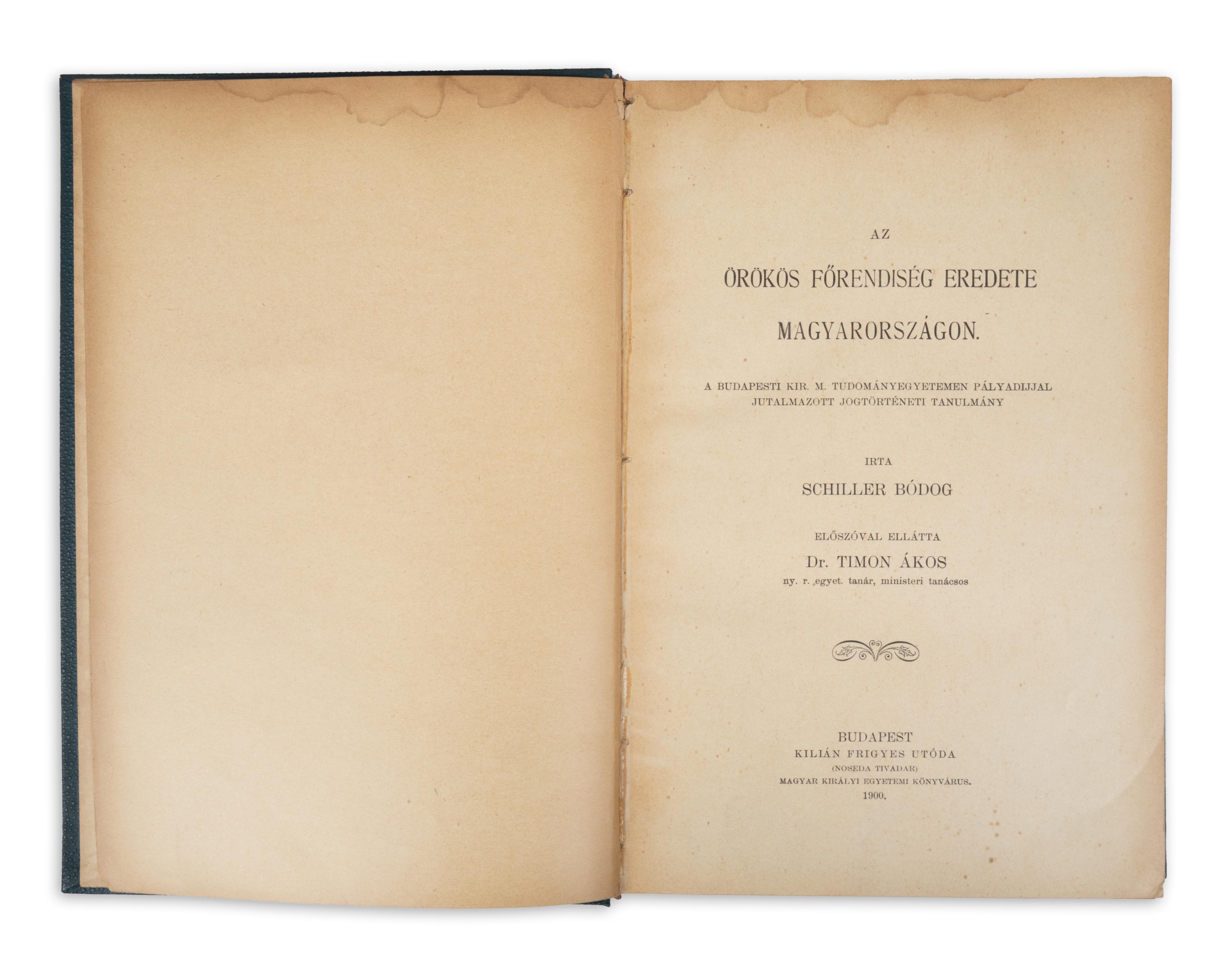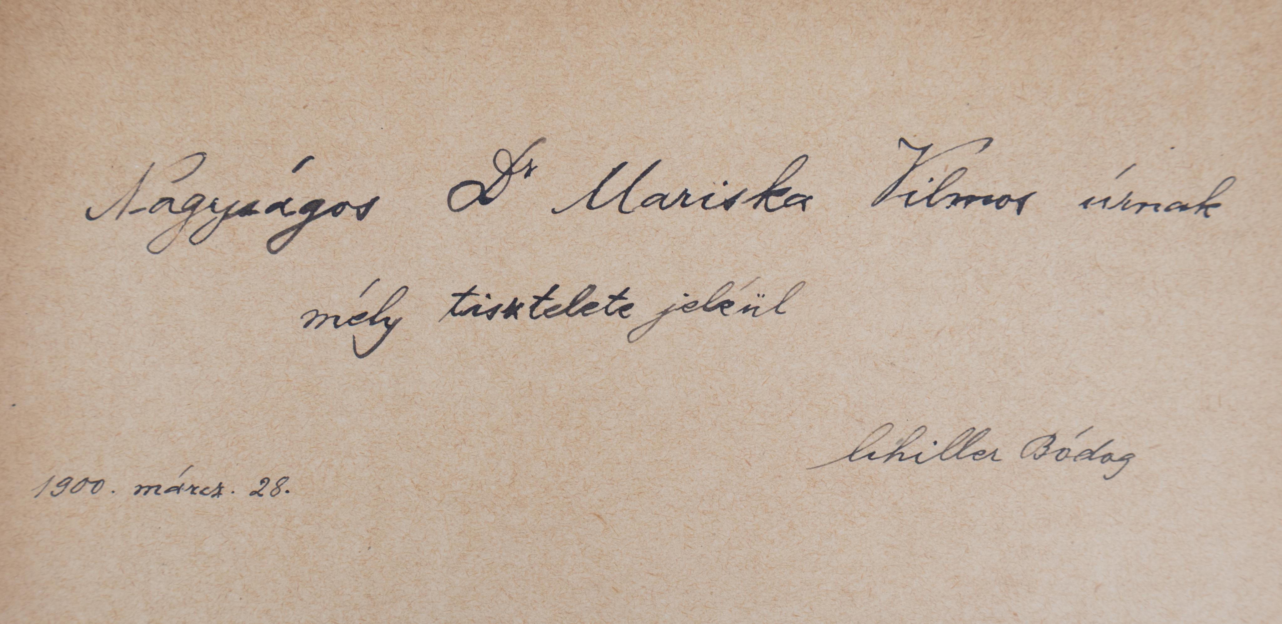 Budapest, 1900. Kilián Frigyes utóda (Egyházmegyei Könyvnyomda, Veszprém). 336 p. Előzéklapján "nagyságos Mariska Vilmos úrnak mély tisztelete jeléül Schiller Bódog, 1900. márc. 28." - dedikált példány. A címzett (1844-1912) egyetemi tanár, jogi doktor volt.