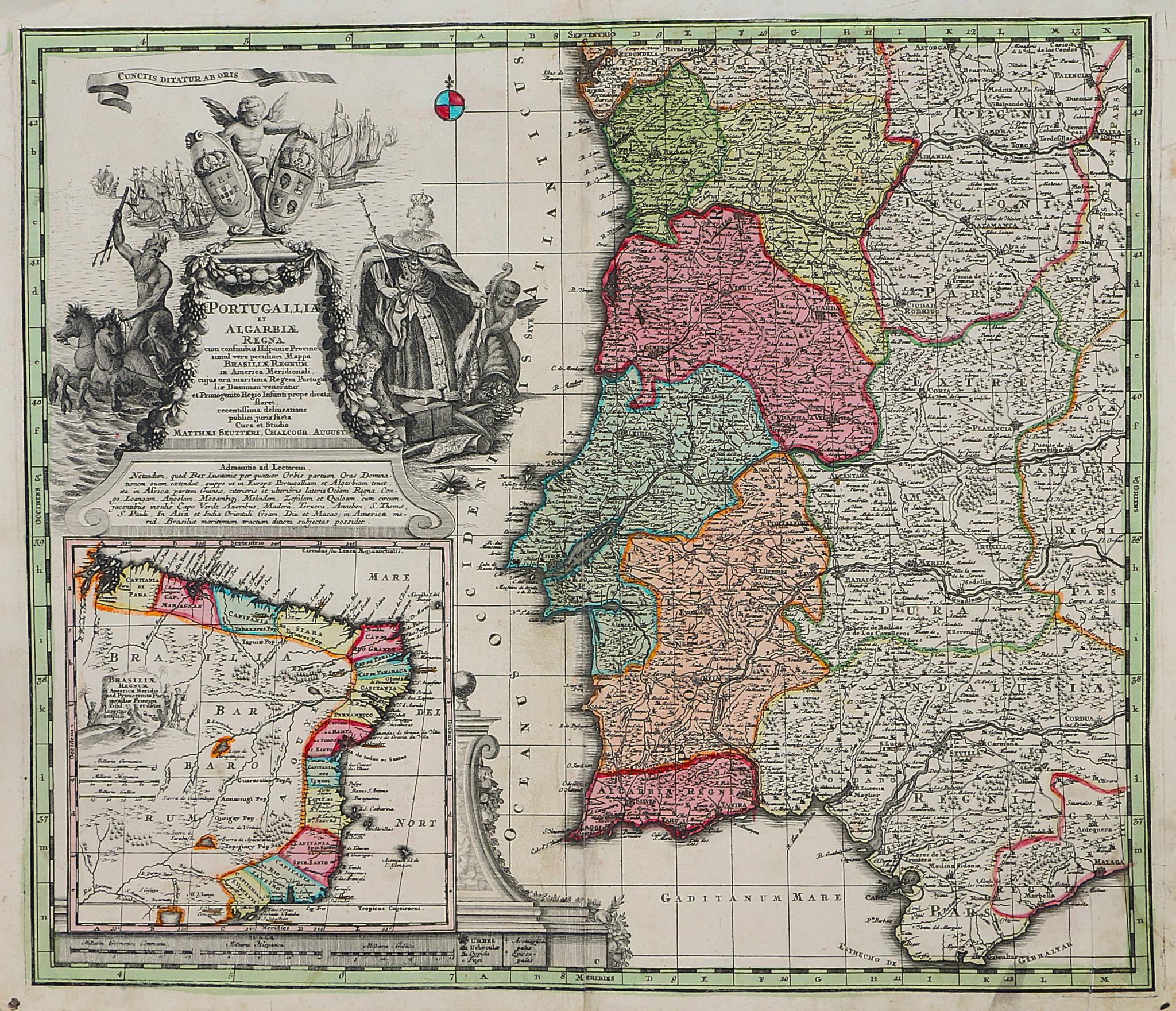 A stunning, original coloured folio map of the Kingdom of Portugal filled with impressive detail of carefully located mountains, forests, rivers, roads, cities and forts. What truly makes this map outstanding is the the inset map of Portugal's former 12 captaincies in Brazil.