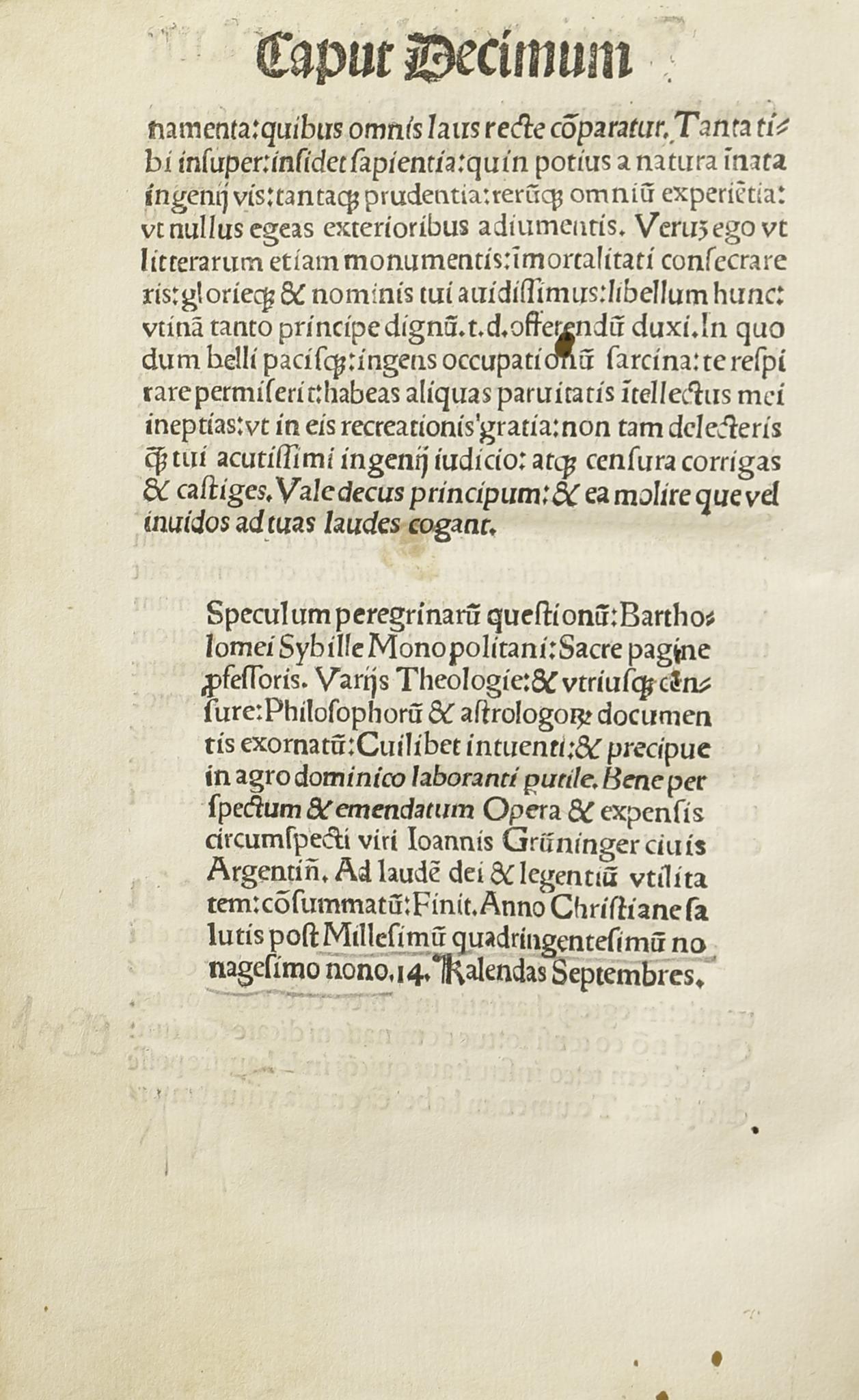 [X] + CCLIIII fol. A címlapon nagyméretű, szépen kidolgozott fametszettel. Korabeli, kéziratos, tintás széljegyzetekkel és aláhúzásokkal. 32 soros, egyhasábos szedés, 3-6 soros kezdőbetűkkel, üresen hagyott vezérbetűkkel. Összesen 264 levél, az utolsó, üres lap hiányzik. Első alkalommal 1493-ban jelent meg Rómában.