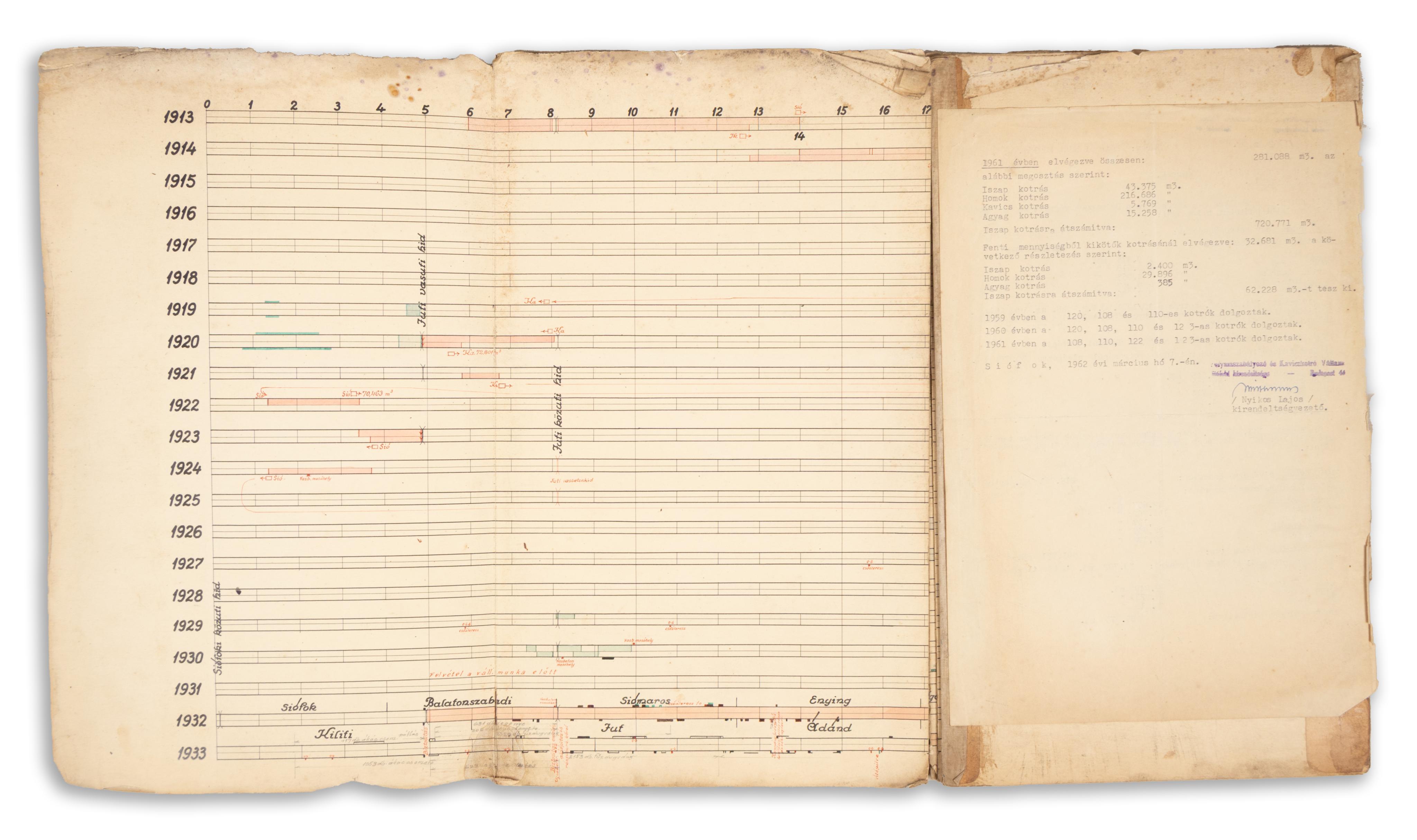 Az egyedi összeállítású dokumentum részletezése: 8 gépiratos, kézi javításokat tartalmazó tanulmány, kihajtható helyszínrajz és térképvázlat, egy alaprajz az energiatörőről 9 fényképpel, egy hajtogatható átnézeti rajz az 1913–31. közötti munkálatokról. A dokumentumokon Pataky Béla főmérnök, Straus János műszaki tanácsos és Bertár János főmérnök sk. aláírásai olvashatók.