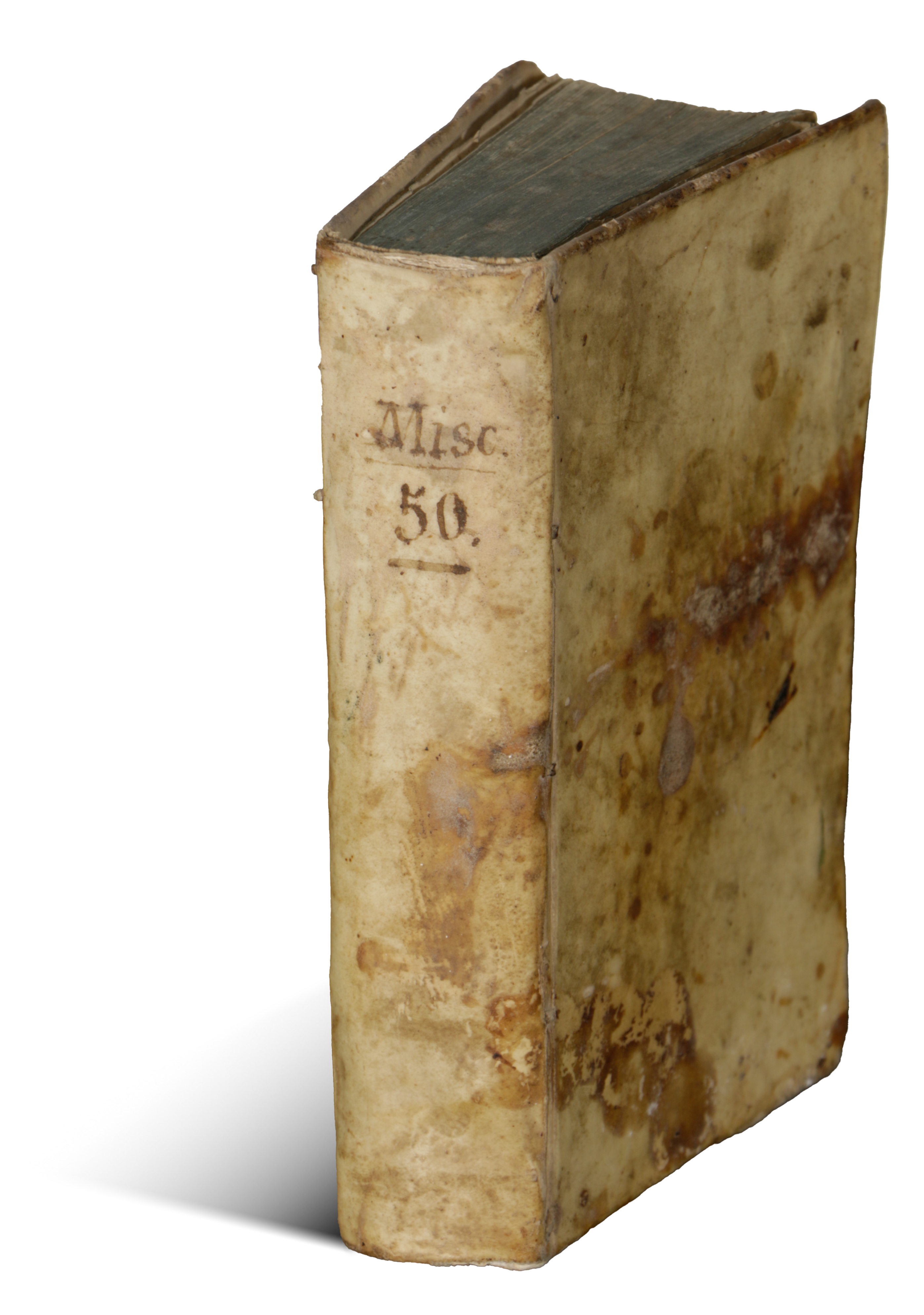 In a heavily foxed contemporary vellum binding, lacking on the rear board, with a manuscript title on the spine. Light spotting and rusting to boards and text in places. Densely annotated endpapers. Ink stains and poss inscriptions on the verso, of boards, title page and front endpaper.