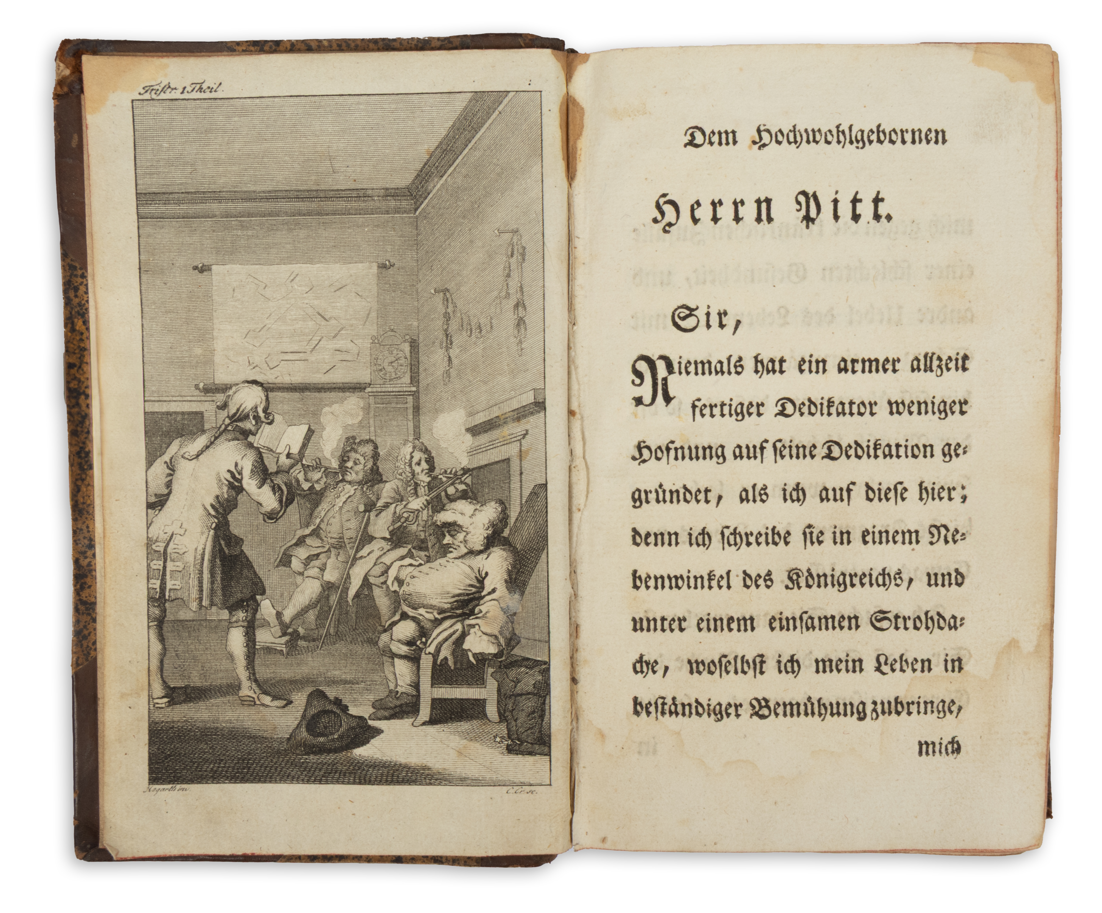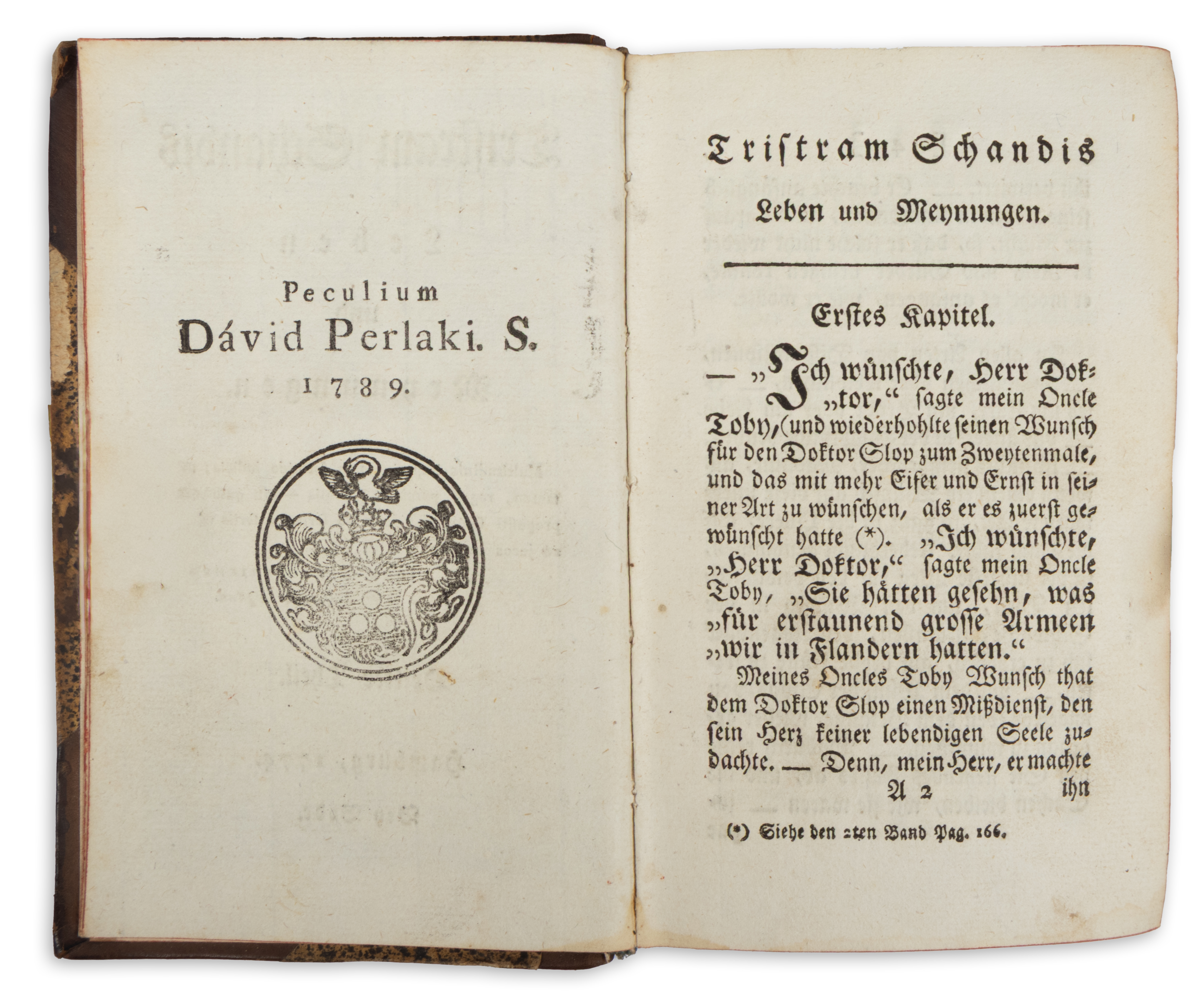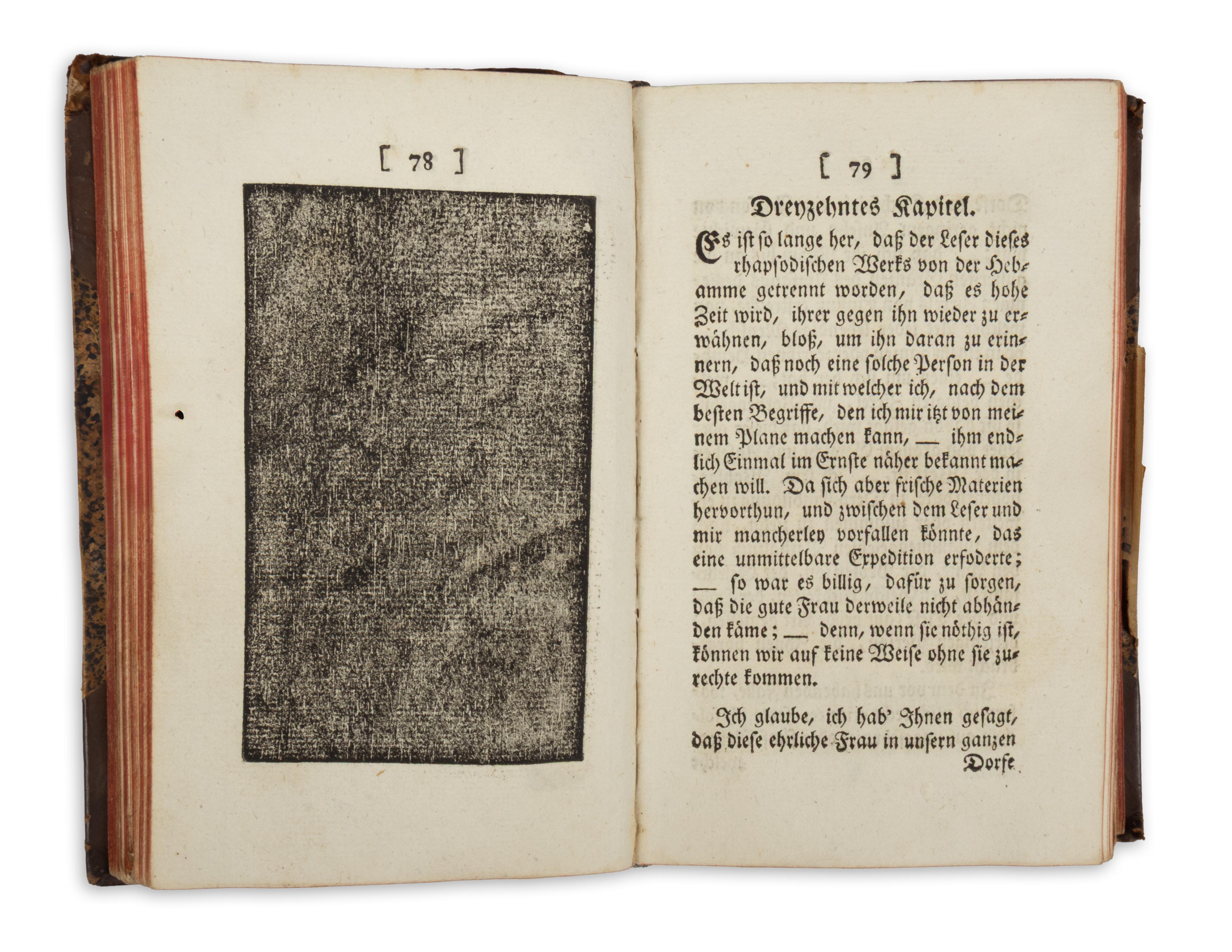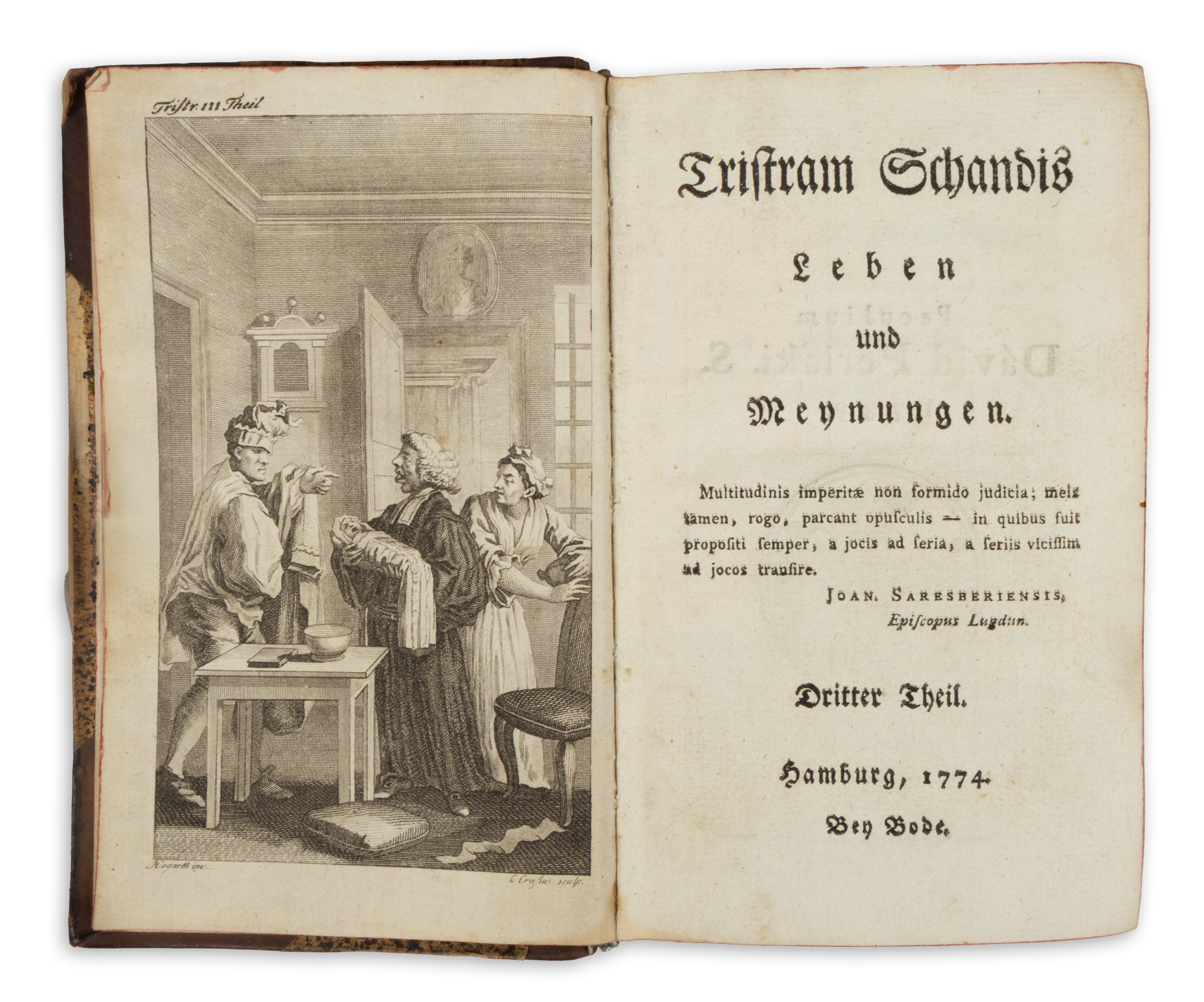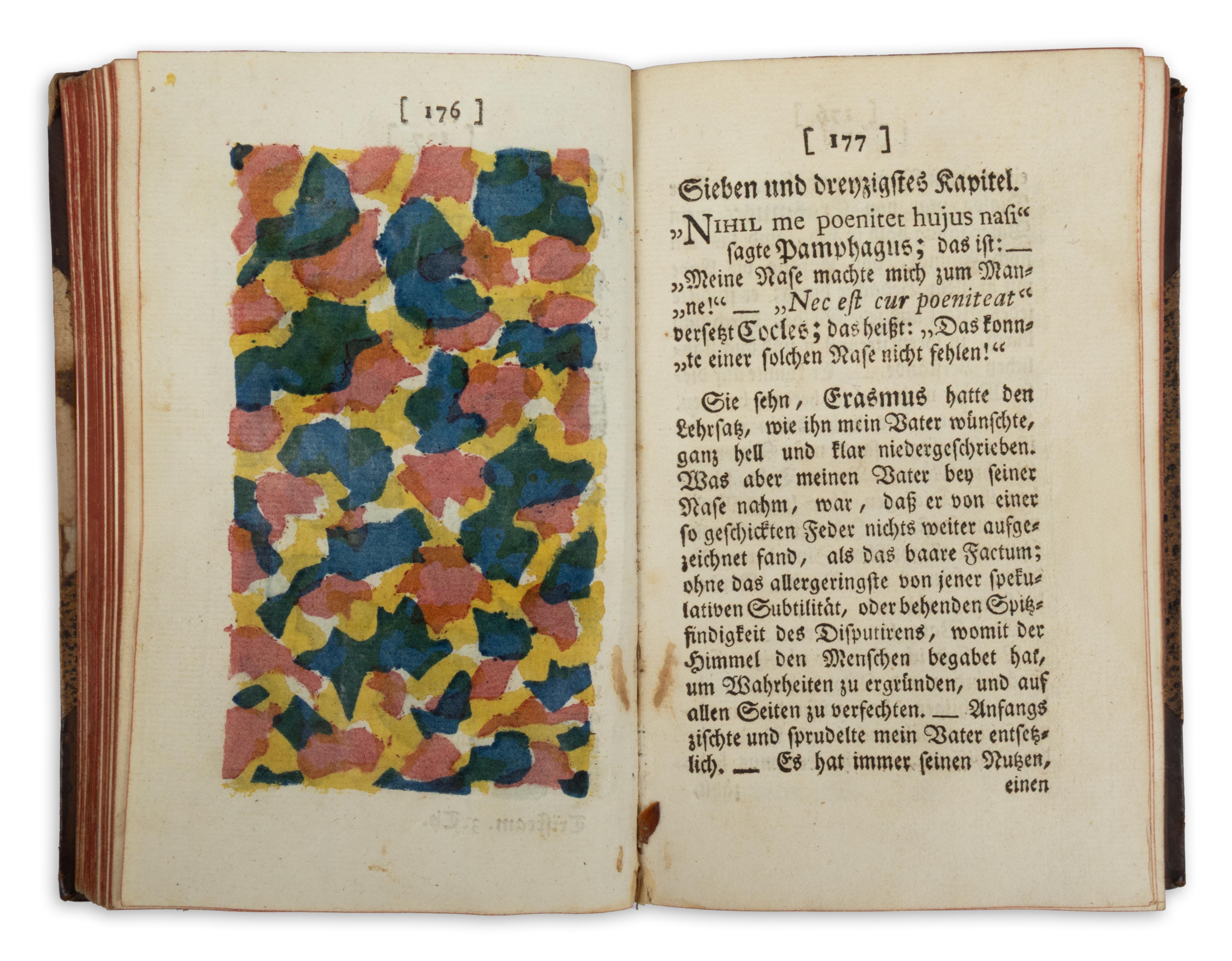 Four parts only (of nine). Part I contains an extensive subscription list, which includes Bertuch, Claudius, Gerstenberg, Goethe, Herder, Hippel, Hirschfeld, Jacobi, Klopstock, Lavater, Wieland and the Oldenburg Book Society. The so-called ‘black page’ in Bode's edition largely corresponds to the English version, with irregular black printing. The famous ‘marbled page’, which in the early English editions was actually designed using the marbling technique (a piece of marbled paper was glued into the first English edition), was replaced by Bode with a 3-colour stencil print (red, yellow, blue).