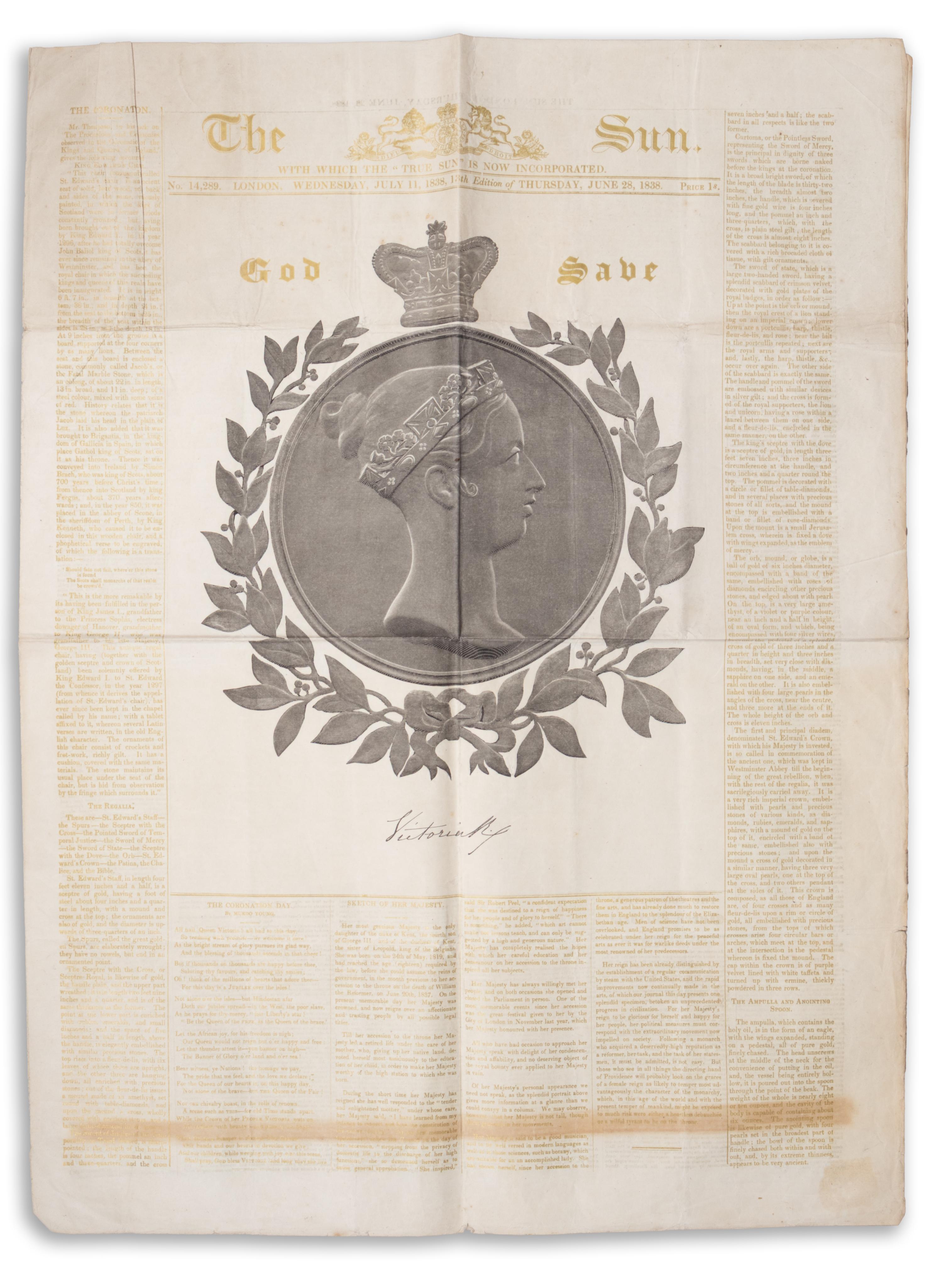 Viktória királynő 1838. június 28-i koronázásának emlékére a The Sun londoni napilap négyoldalas, aranynyomással készült különszámot jelentetett meg. Az első oldalon Nagy-Britannia és Írország Egyesült Királyságának királynőjének (1819–1901) nagyméretű medál portréja látható. A kiadvány olyan népszerű volt, hogy több kiadást is megélt.