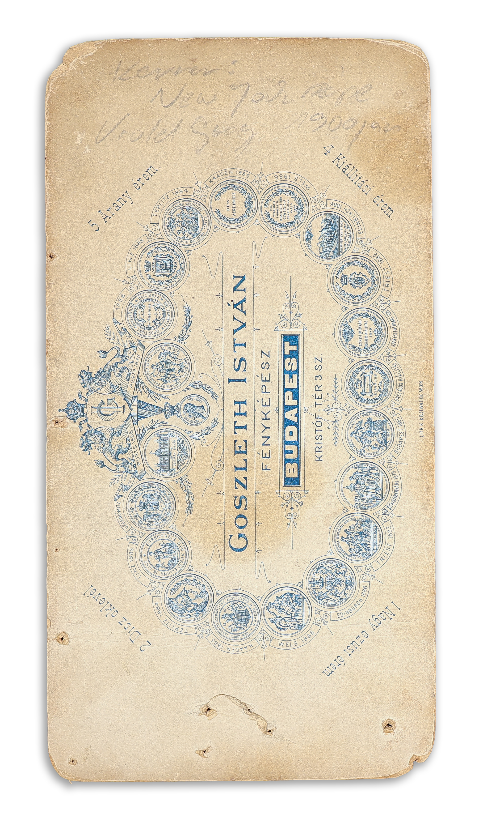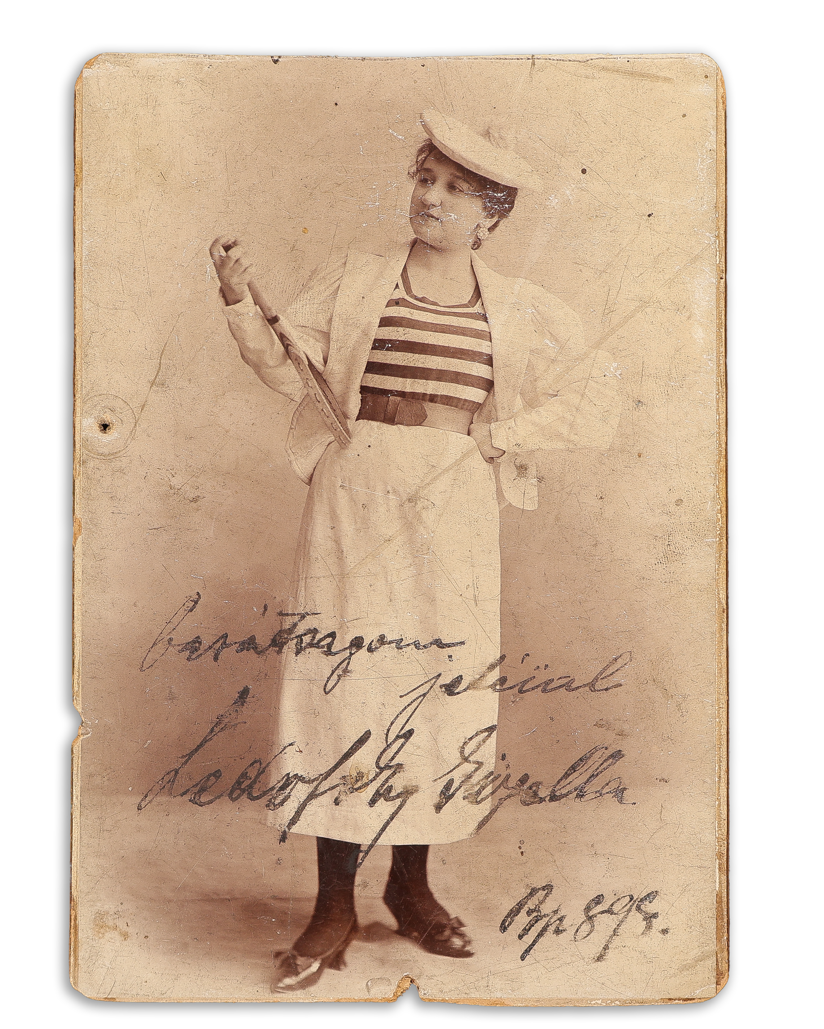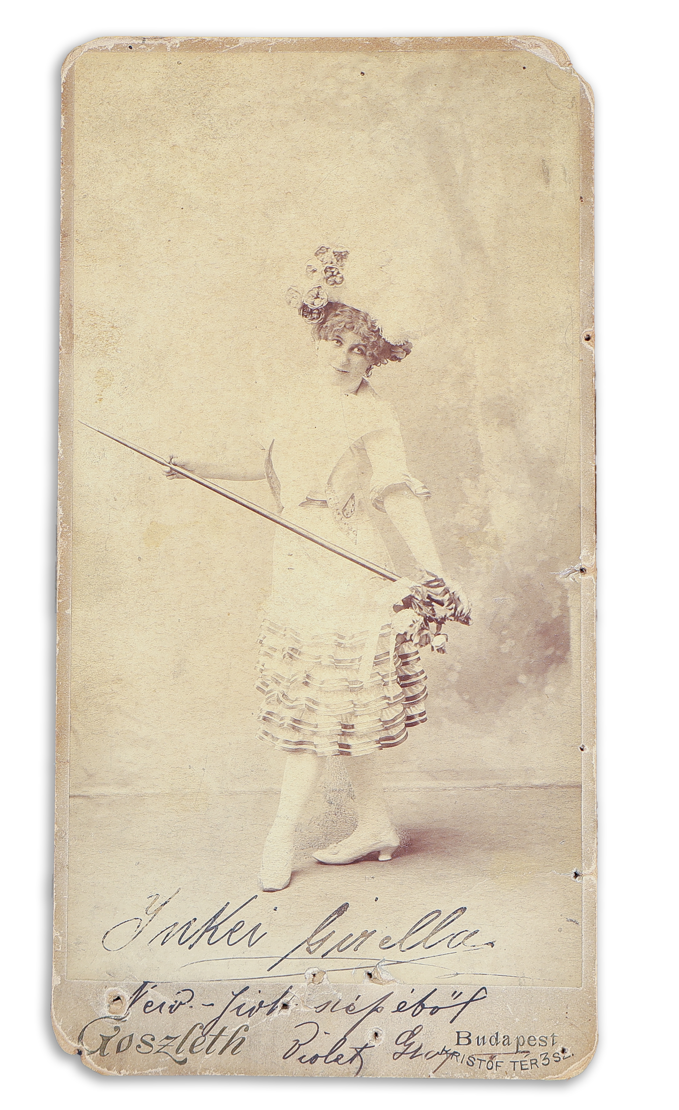 - Inkey Gizella primadonna egész alakos fényképe Goszleth István Kristóf téri, feliratozott műtermi kartonján, a színésznő sajátkezű aláírásával. Budapest, 1900.
