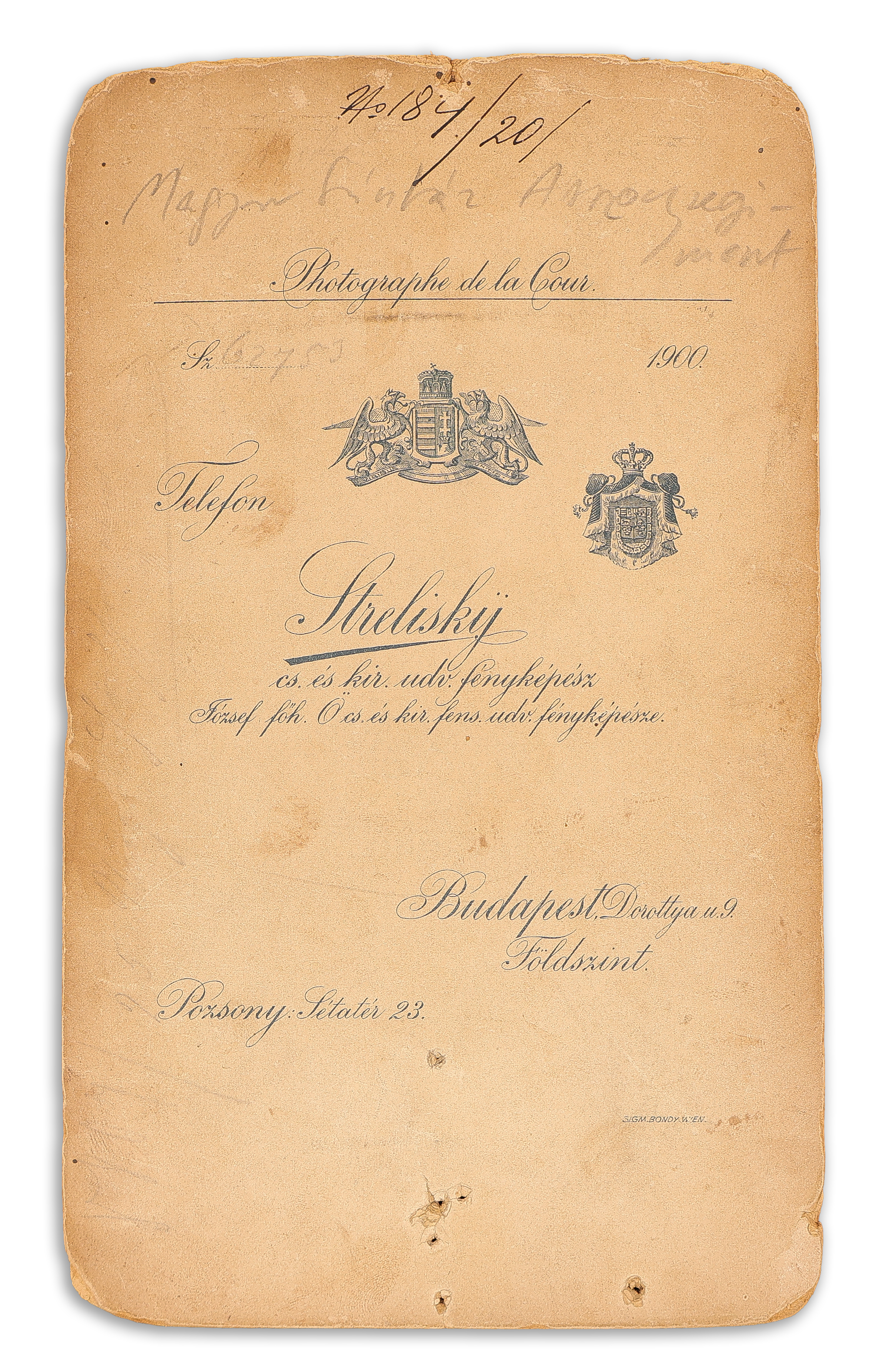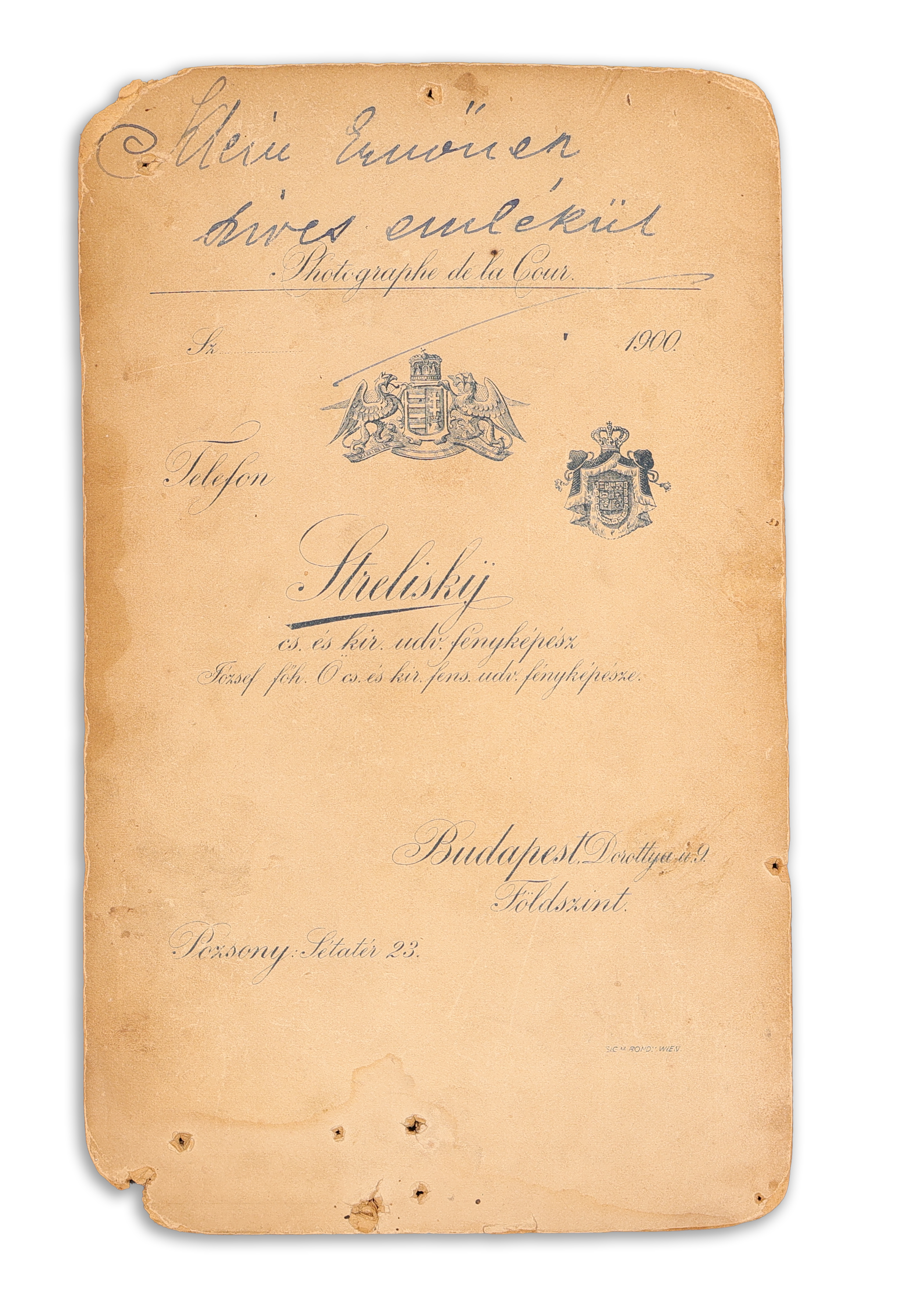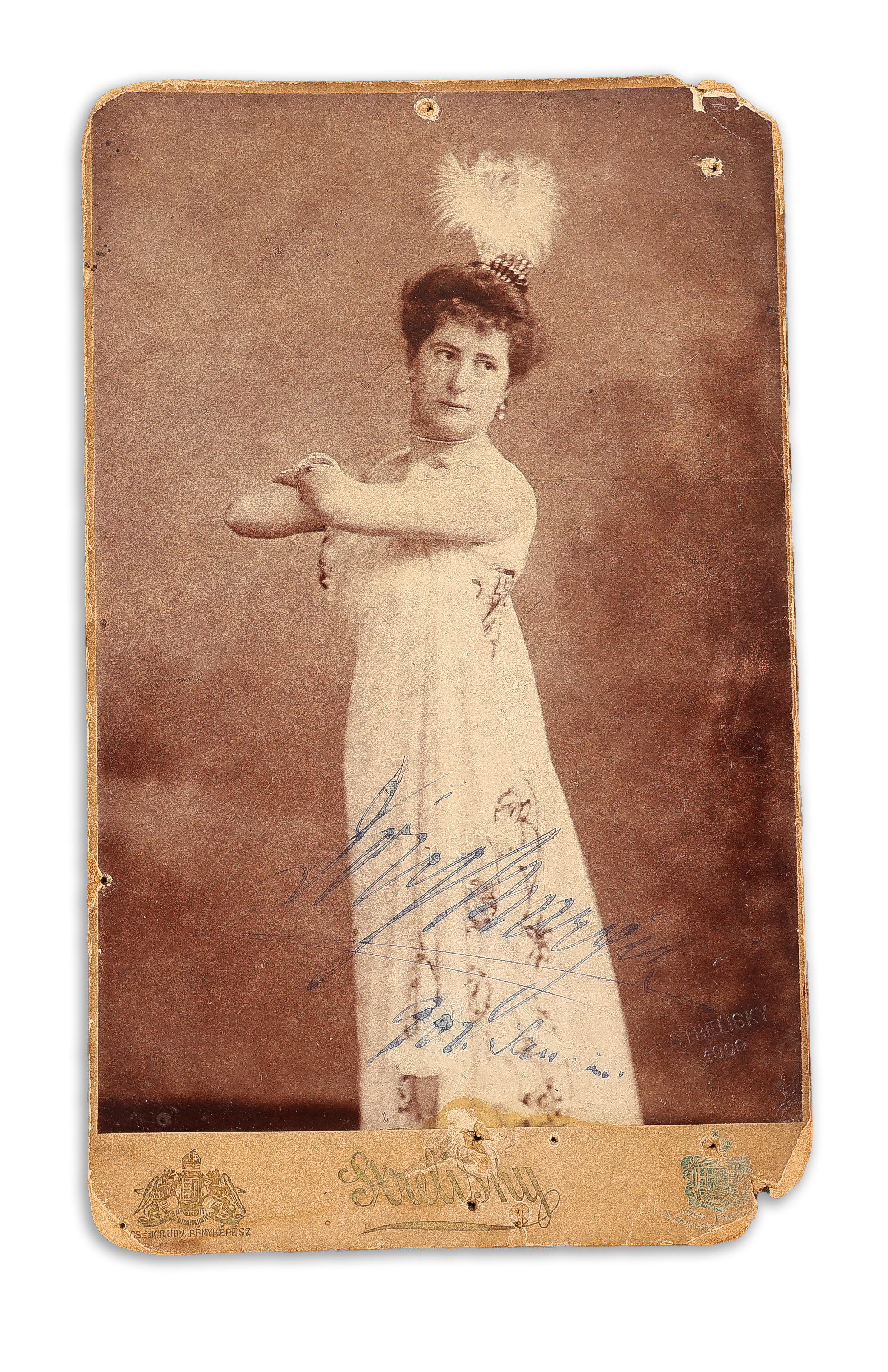 - Dóry Margit operetténekes színésznő (1879-19??) egészalakos fényképe aláírásával, a verzóján dedikációval Strelisky budapesti műterméből. Budapest, 1901.