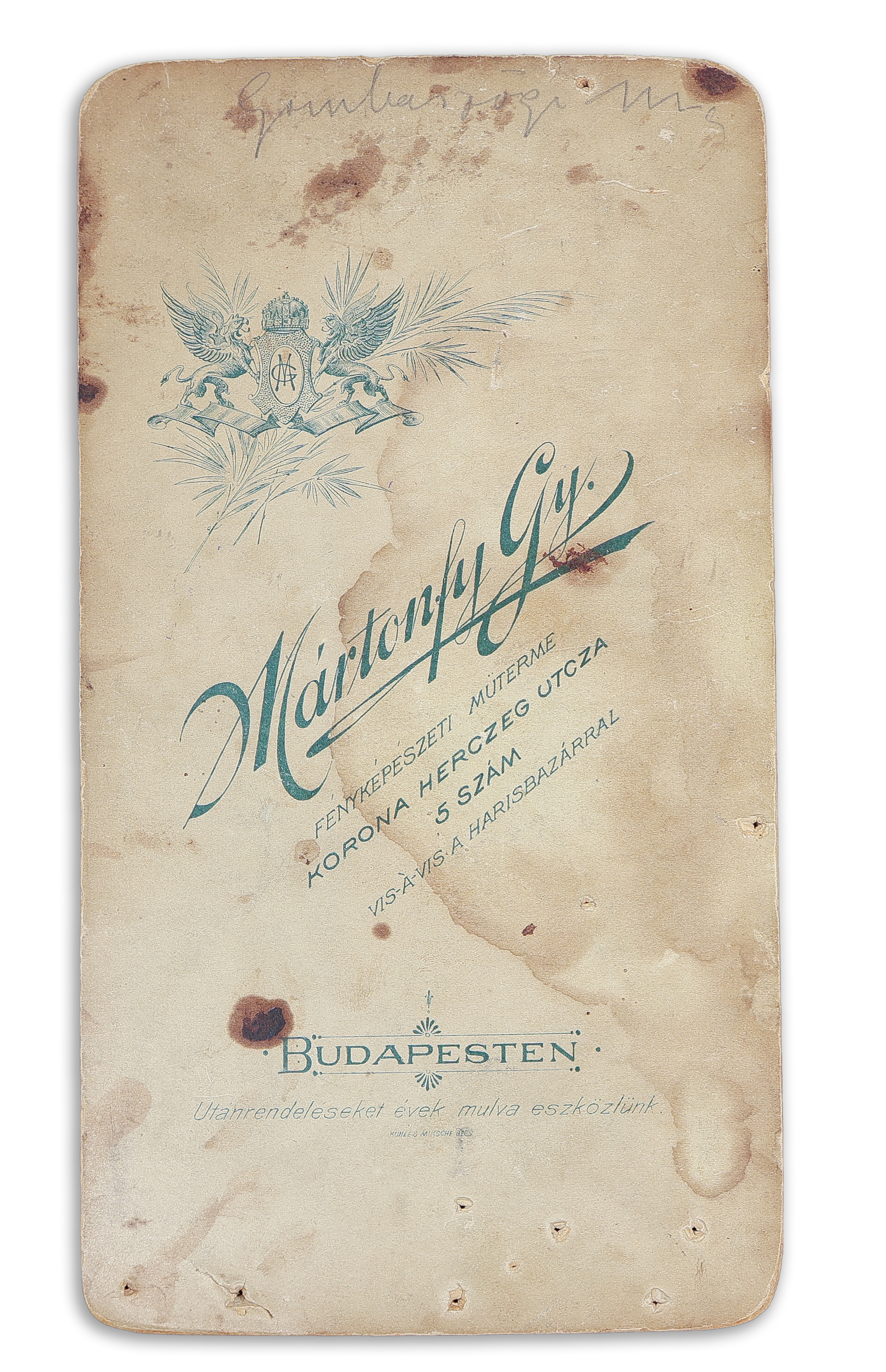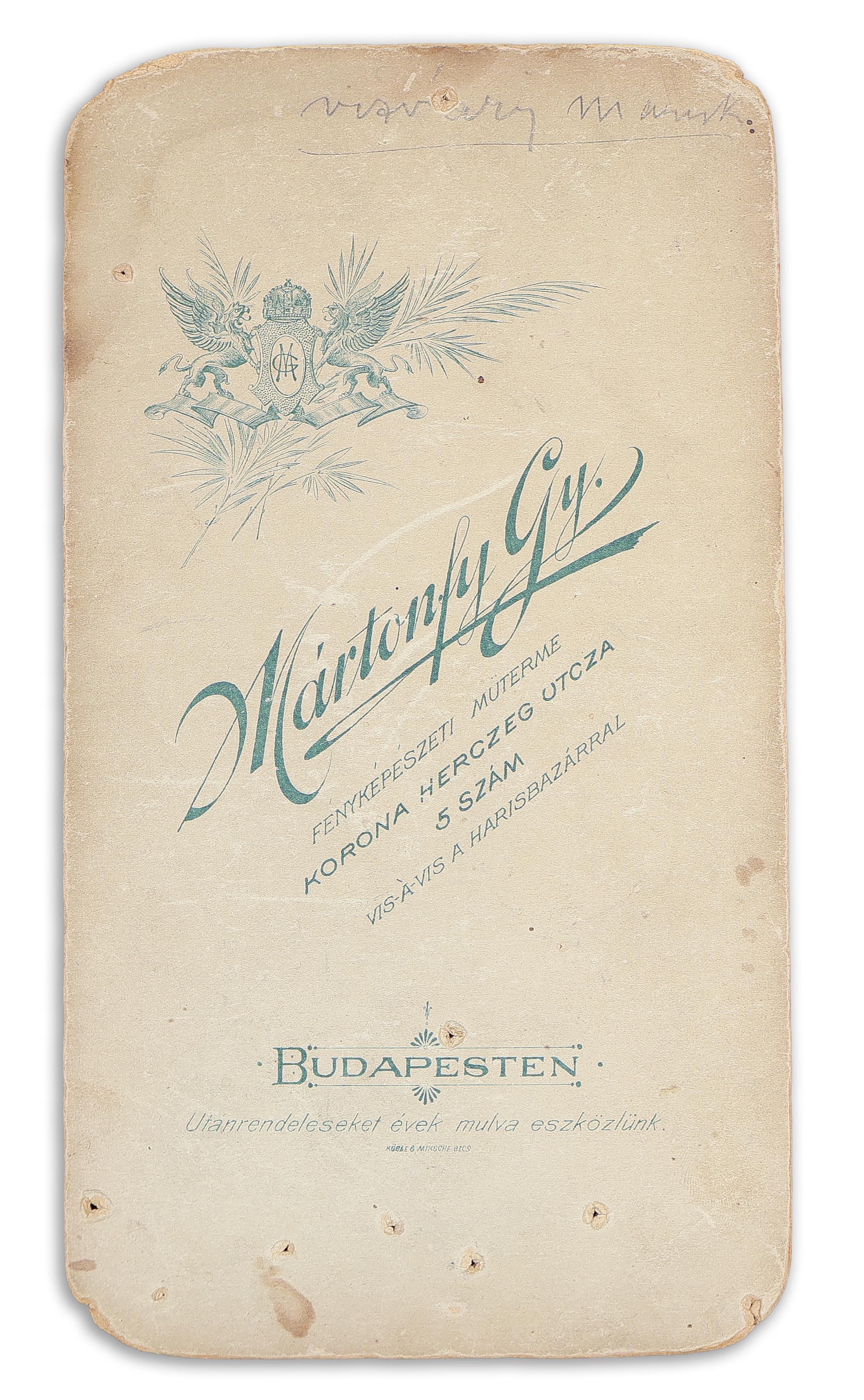 Kopottas, sarka kissé sérült, rajzszög ütötte lukakkal. M: 10,5×20,5 cm