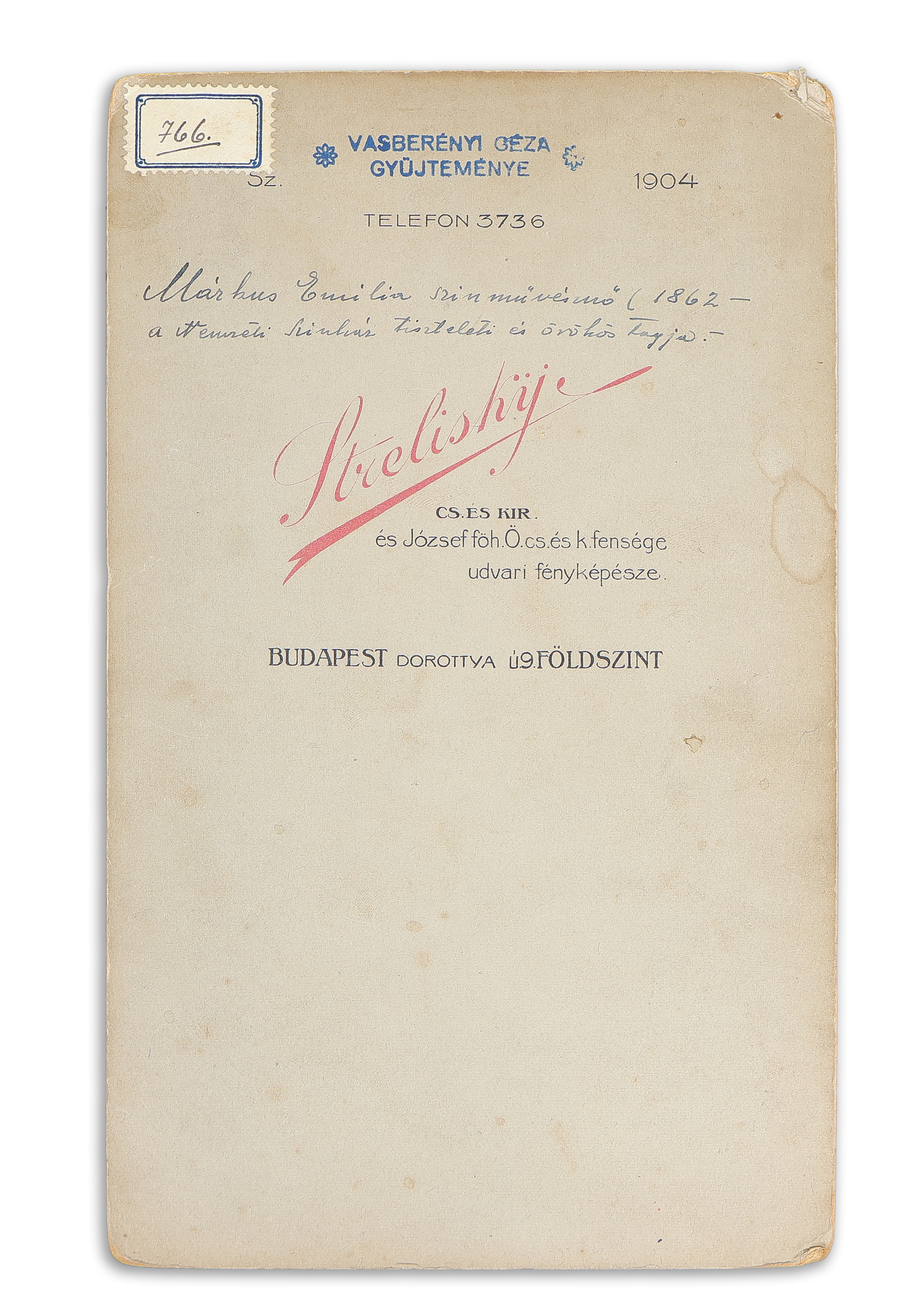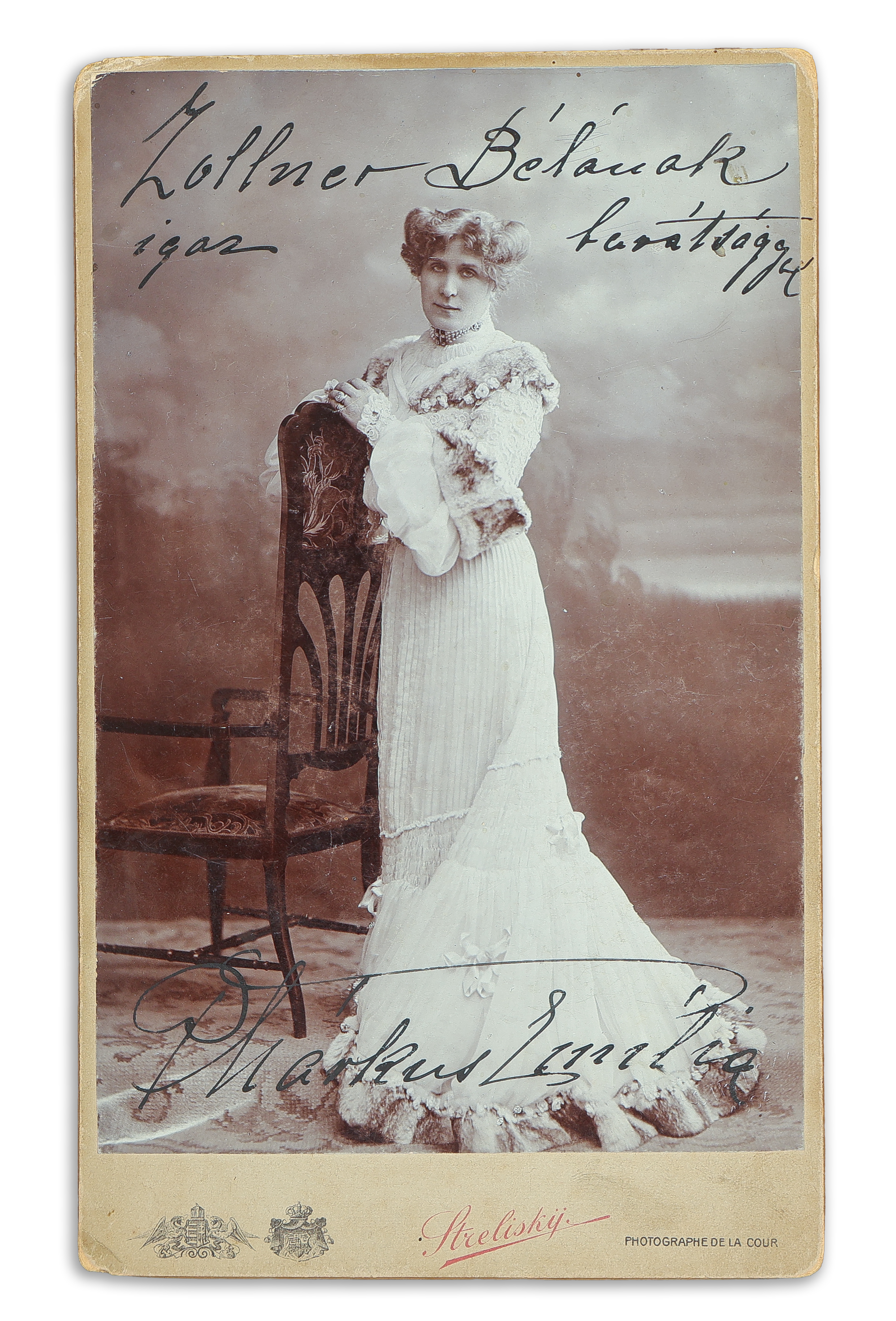 - Márkus Emília (1860-1949) színésznő dedikált egész alakos fényképe Strelisky Dorottya utcai műterméből. Budapest, 1904.