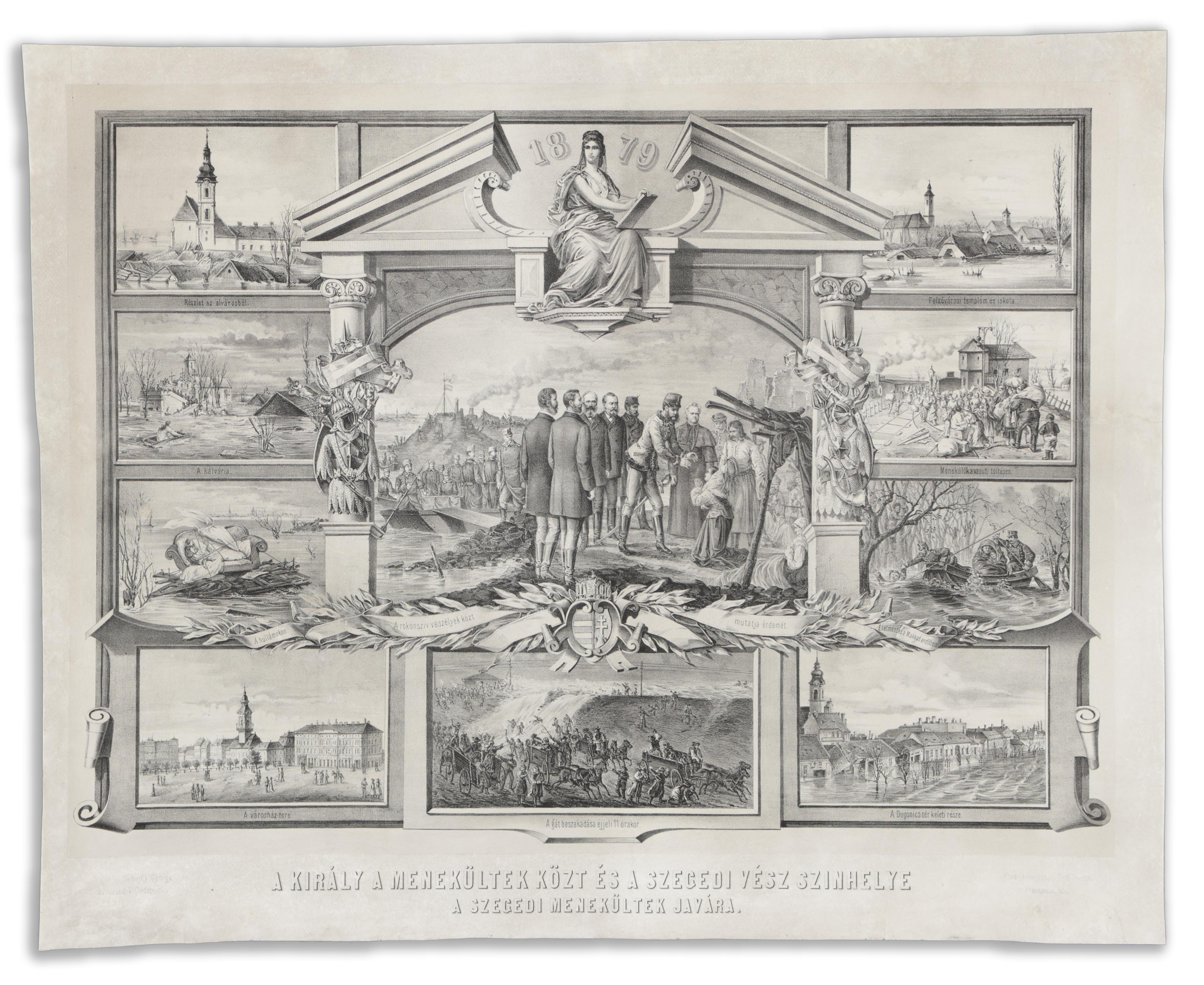 The central image depicts Franz Joseph I helping refugees ("The heart of someone akin shows its merit among the dangers"), while the smaller scenes around the central image show Szeged under water and the tragic or even heroic events of the flood.