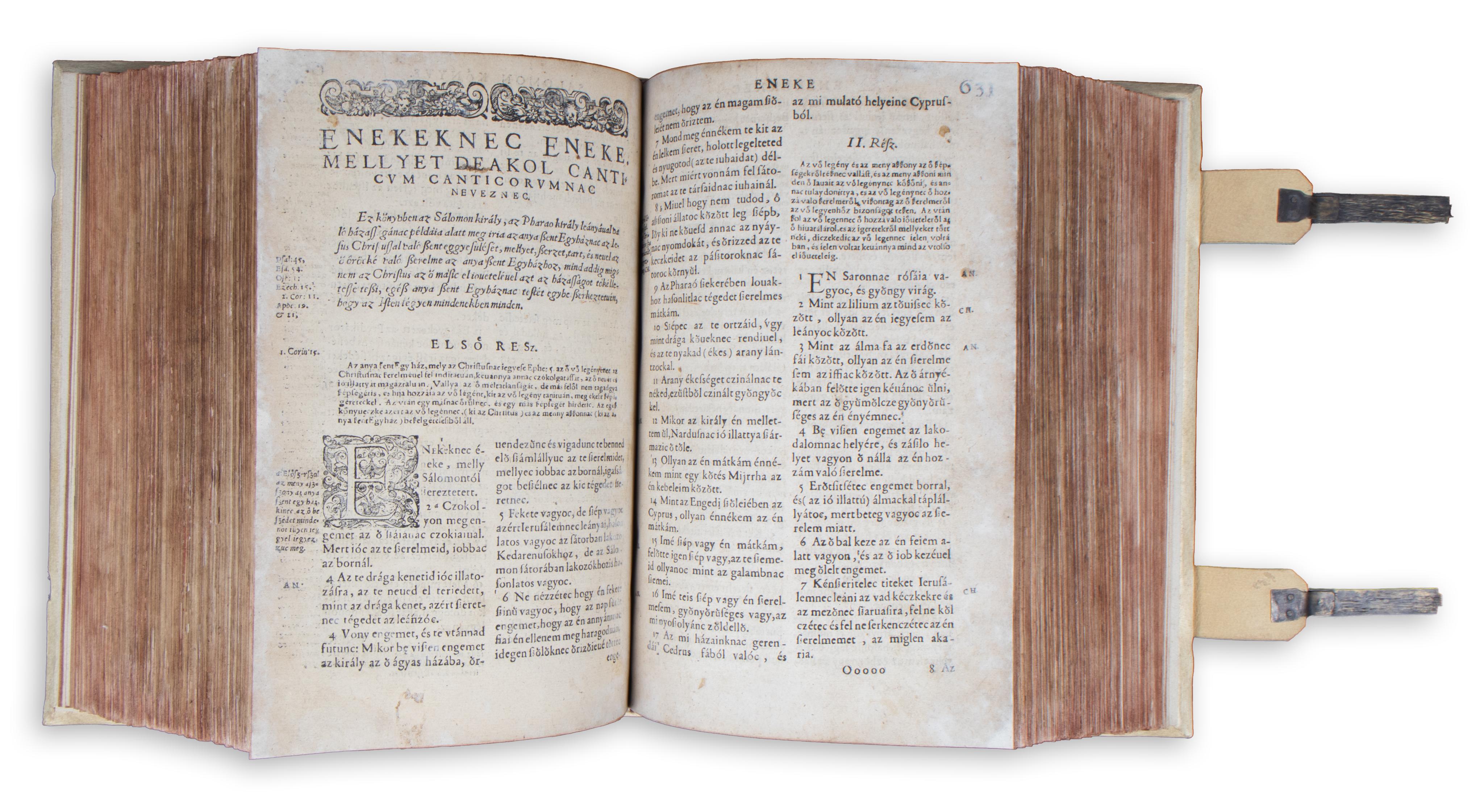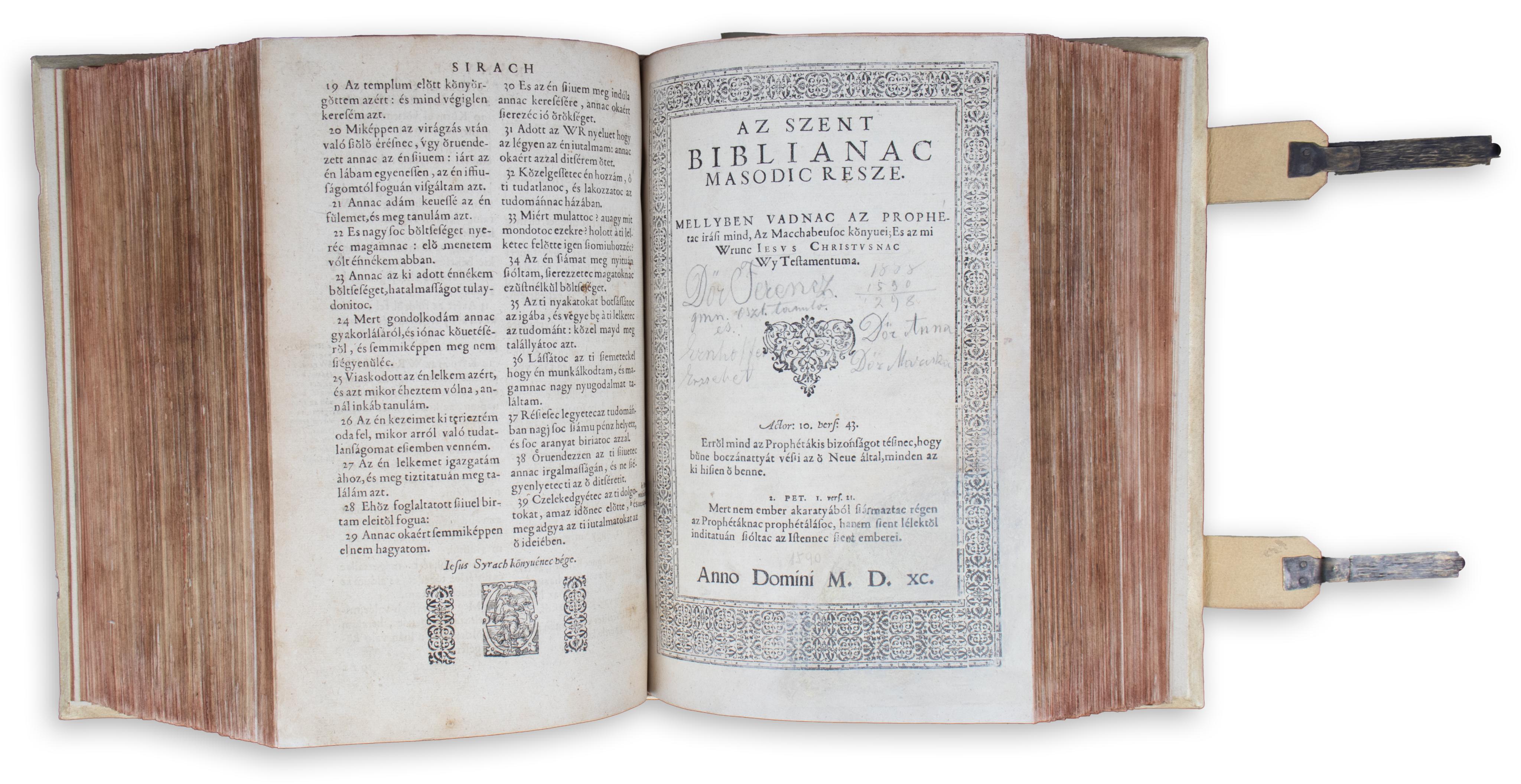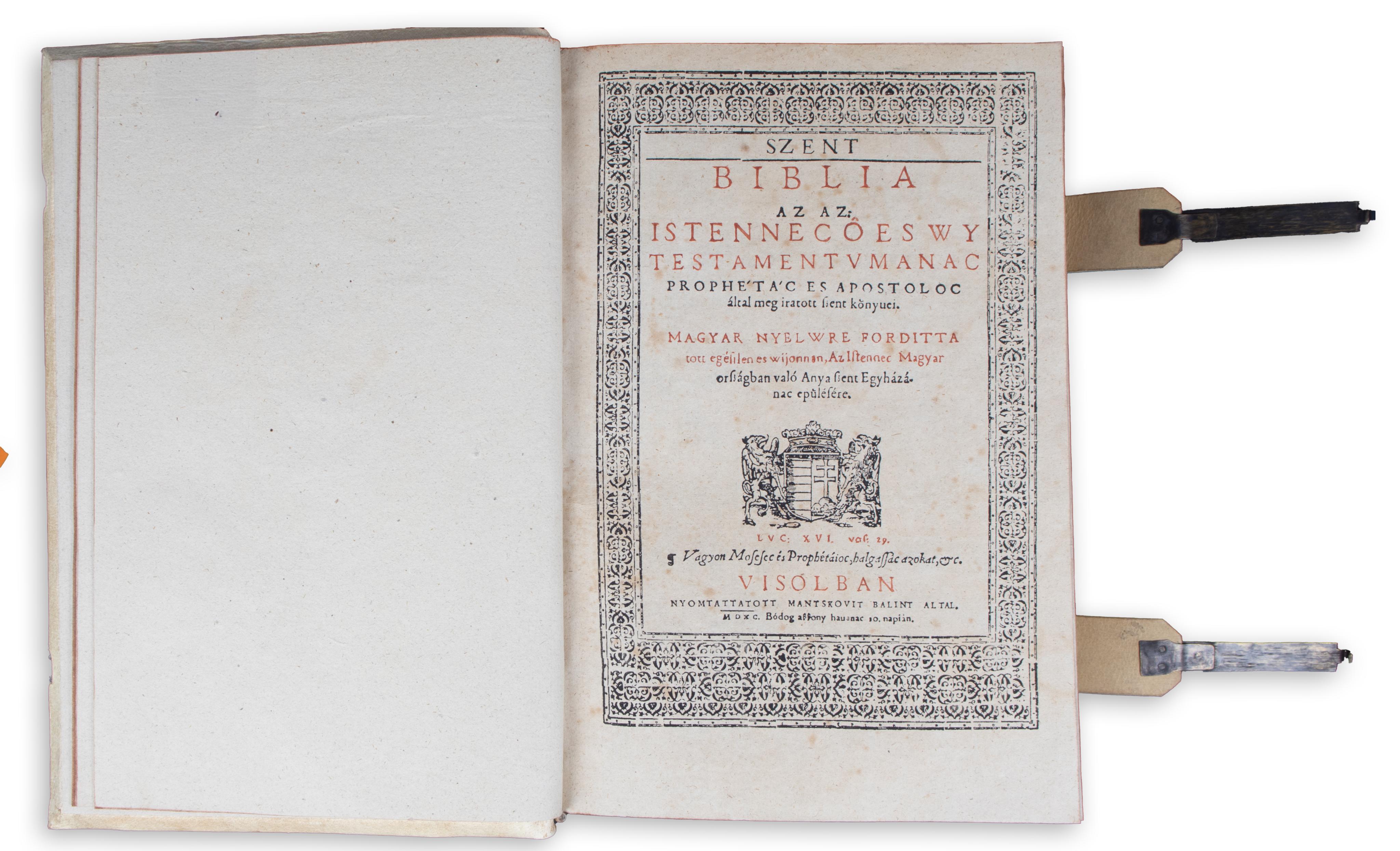 The Vizsoly Bible is considered a landmark in Hungarian cultural, printing, and church history, as it is the first complete Hungarian translation of the Bible. The work consists of three parts, each with its own title page and foliation. The first title page refers to the entire work, with the table of contents of the first part printed on its verso. This section contains the first 28 books of the Old Testament.