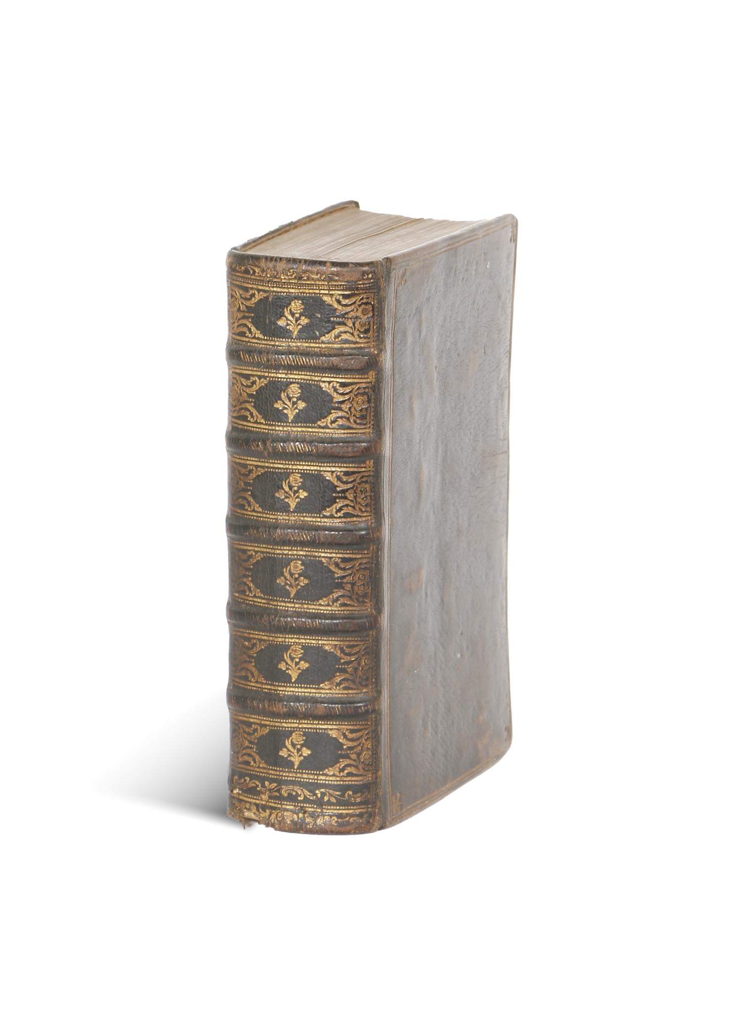 Korabeli, dúsan aranyozott és bordázott gerincű egészbőr kötésben, a táblákon vaknyomásos, aranyozott keretdísszel. Körül aranyozott lapélekkel, a gerincnél poncolt mintákkal. (14×21 cm) Az előzéken Johannis Szánthó 1815-ös névbejegyzése. Szép, stabil példány.
